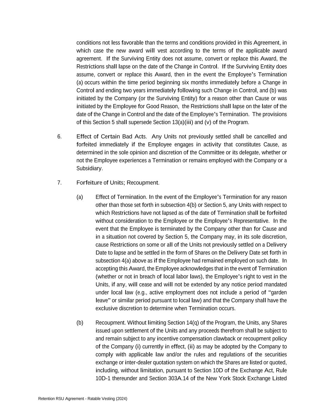 Retention RSU Agreement - Ratable Vesting (2024) conditions not less favorable than the terms and conditions provided in this Agreement, in which case the new award will vest according to the terms of the applicable award agreement. If the Surviving Entity does not assume, convert or replace this Award, the Restrictions shall lapse on the date of the Change in Control. If the Surviving Entity does assume, convert or replace this Award, then in the event the Employee’s Termination (a) occurs within the time period beginning six months immediately before a Change in Control and ending two years immediately following such Change in Control, and (b) was initiated by the Company (or the Surviving Entity) for a reason other than Cause or was initiated by the Employee for Good Reason, the Restrictions shall lapse on the later of the date of the Change in Control and the date of the Employee’s Termination. The provisions of this Section 5 shall supersede Section 13(a)(iii) and (v) of the Program. 6. Effect of Certain Bad Acts. Any Units not previously settled shall be cancelled and forfeited immediately if the Employee engages in activity that constitutes Cause, as determined in the sole opinion and discretion of the Committee or its delegate, whether or not the Employee experiences a Termination or remains employed with the Company or a Subsidiary. 7. Forfeiture of Units; Recoupment. (a) Effect of Termination. In the event of the Employee’s Termination for any reason other than those set forth in subsection 4(b) or Section 5, any Units with respect to which Restrictions have not lapsed as of the date of Termination shall be forfeited without consideration to the Employee or the Employee’s Representative. In the event that the Employee is terminated by the Company other than for Cause and in a situation not covered by Section 5, the Company may, in its sole discretion, cause Restrictions on some or all of the Units not previously settled on a Delivery Date to lapse and be settled in the form of Shares on the Delivery Date set forth in subsection 4(a) above as if the Employee had remained employed on such date. In accepting this Award, the Employee acknowledges that in the event of Termination (whether or not in breach of local labor laws), the Employee’s right to vest in the Units, if any, will cease and will not be extended by any notice period mandated under local law (e.g., active employment does not include a period of “garden leave” or similar period pursuant to local law) and that the Company shall have the exclusive discretion to determine when Termination occurs. (b) Recoupment. Without limiting Section 14(q) of the Program, the Units, any Shares issued upon settlement of the Units and any proceeds therefrom shall be subject to and remain subject to any incentive compensation clawback or recoupment policy of the Company (i) currently in effect, (ii) as may be adopted by the Company to comply with applicable law and/or the rules and regulations of the securities exchange or inter-dealer quotation system on which the Shares are listed or quoted, including, without limitation, pursuant to Section 10D of the Exchange Act, Rule 10D-1 thereunder and Section 303A.14 of the New York Stock Exchange Listed