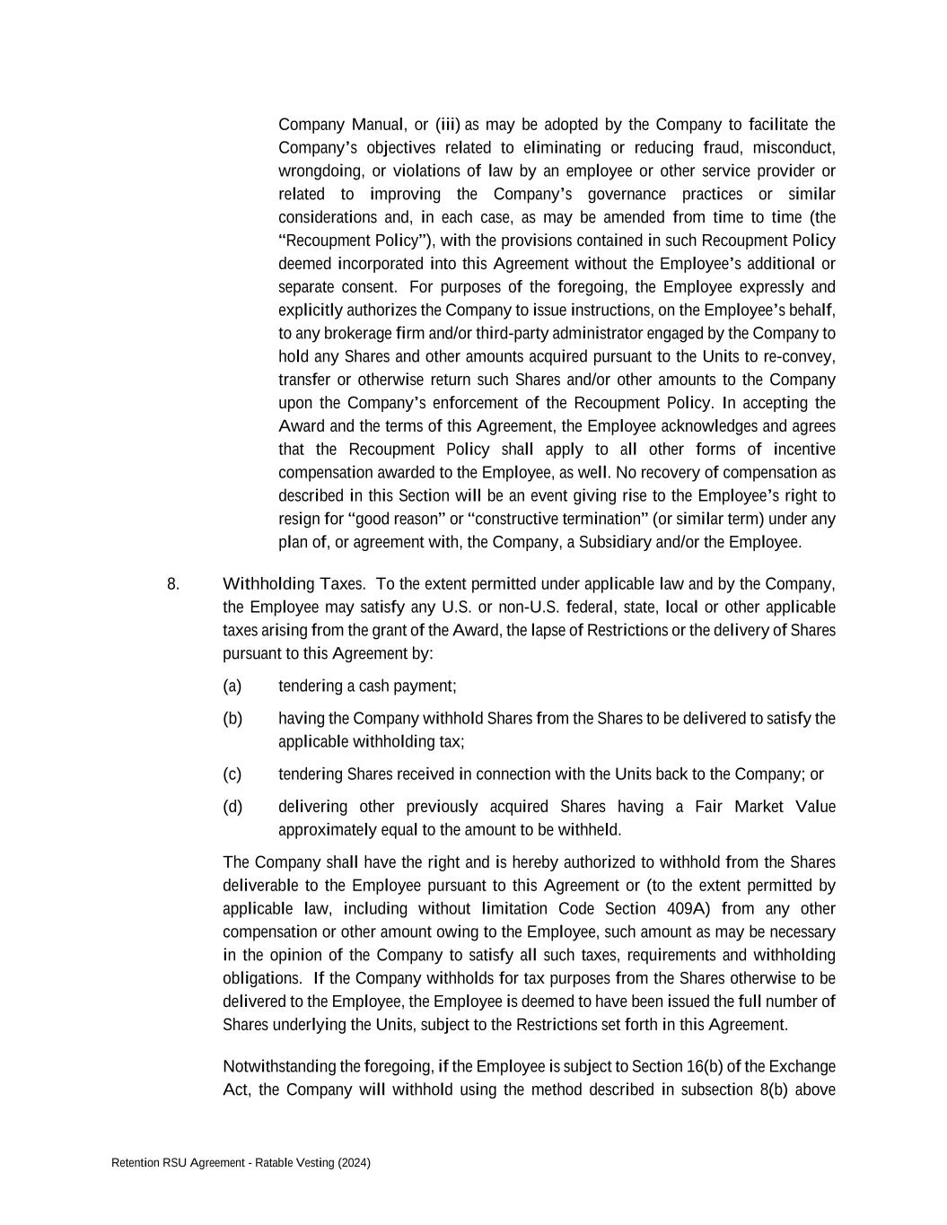 Retention RSU Agreement - Ratable Vesting (2024) Company Manual, or (iii) as may be adopted by the Company to facilitate the Company’s objectives related to eliminating or reducing fraud, misconduct, wrongdoing, or violations of law by an employee or other service provider or related to improving the Company’s governance practices or similar considerations and, in each case, as may be amended from time to time (the “Recoupment Policy”), with the provisions contained in such Recoupment Policy deemed incorporated into this Agreement without the Employee’s additional or separate consent. For purposes of the foregoing, the Employee expressly and explicitly authorizes the Company to issue instructions, on the Employee’s behalf, to any brokerage firm and/or third-party administrator engaged by the Company to hold any Shares and other amounts acquired pursuant to the Units to re-convey, transfer or otherwise return such Shares and/or other amounts to the Company upon the Company’s enforcement of the Recoupment Policy. In accepting the Award and the terms of this Agreement, the Employee acknowledges and agrees that the Recoupment Policy shall apply to all other forms of incentive compensation awarded to the Employee, as well. No recovery of compensation as described in this Section will be an event giving rise to the Employee’s right to resign for “good reason” or “constructive termination” (or similar term) under any plan of, or agreement with, the Company, a Subsidiary and/or the Employee. 8. Withholding Taxes. To the extent permitted under applicable law and by the Company, the Employee may satisfy any U.S. or non-U.S. federal, state, local or other applicable taxes arising from the grant of the Award, the lapse of Restrictions or the delivery of Shares pursuant to this Agreement by: (a) tendering a cash payment; (b) having the Company withhold Shares from the Shares to be delivered to satisfy the applicable withholding tax; (c) tendering Shares received in connection with the Units back to the Company; or (d) delivering other previously acquired Shares having a Fair Market Value approximately equal to the amount to be withheld. The Company shall have the right and is hereby authorized to withhold from the Shares deliverable to the Employee pursuant to this Agreement or (to the extent permitted by applicable law, including without limitation Code Section 409A) from any other compensation or other amount owing to the Employee, such amount as may be necessary in the opinion of the Company to satisfy all such taxes, requirements and withholding obligations. If the Company withholds for tax purposes from the Shares otherwise to be delivered to the Employee, the Employee is deemed to have been issued the full number of Shares underlying the Units, subject to the Restrictions set forth in this Agreement. Notwithstanding the foregoing, if the Employee is subject to Section 16(b) of the Exchange Act, the Company will withhold using the method described in subsection 8(b) above