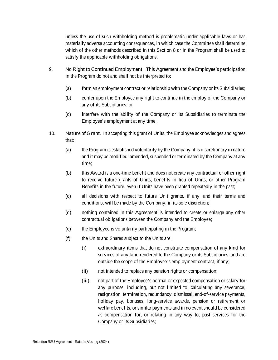 Retention RSU Agreement - Ratable Vesting (2024) unless the use of such withholding method is problematic under applicable laws or has materially adverse accounting consequences, in which case the Committee shall determine which of the other methods described in this Section 8 or in the Program shall be used to satisfy the applicable withholding obligations. 9. No Right to Continued Employment. This Agreement and the Employee’s participation in the Program do not and shall not be interpreted to: (a) form an employment contract or relationship with the Company or its Subsidiaries; (b) confer upon the Employee any right to continue in the employ of the Company or any of its Subsidiaries; or (c) interfere with the ability of the Company or its Subsidiaries to terminate the Employee’s employment at any time. 10. Nature of Grant. In accepting this grant of Units, the Employee acknowledges and agrees that: (a) the Program is established voluntarily by the Company, it is discretionary in nature and it may be modified, amended, suspended or terminated by the Company at any time; (b) this Award is a one-time benefit and does not create any contractual or other right to receive future grants of Units, benefits in lieu of Units, or other Program Benefits in the future, even if Units have been granted repeatedly in the past; (c) all decisions with respect to future Unit grants, if any, and their terms and conditions, will be made by the Company, in its sole discretion; (d) nothing contained in this Agreement is intended to create or enlarge any other contractual obligations between the Company and the Employee; (e) the Employee is voluntarily participating in the Program; (f) the Units and Shares subject to the Units are: (i) extraordinary items that do not constitute compensation of any kind for services of any kind rendered to the Company or its Subsidiaries, and are outside the scope of the Employee’s employment contract, if any; (ii) not intended to replace any pension rights or compensation; (iii) not part of the Employee’s normal or expected compensation or salary for any purpose, including, but not limited to, calculating any severance, resignation, termination, redundancy, dismissal, end-of-service payments, holiday pay, bonuses, long-service awards, pension or retirement or welfare benefits, or similar payments and in no event should be considered as compensation for, or relating in any way to, past services for the Company or its Subsidiaries;