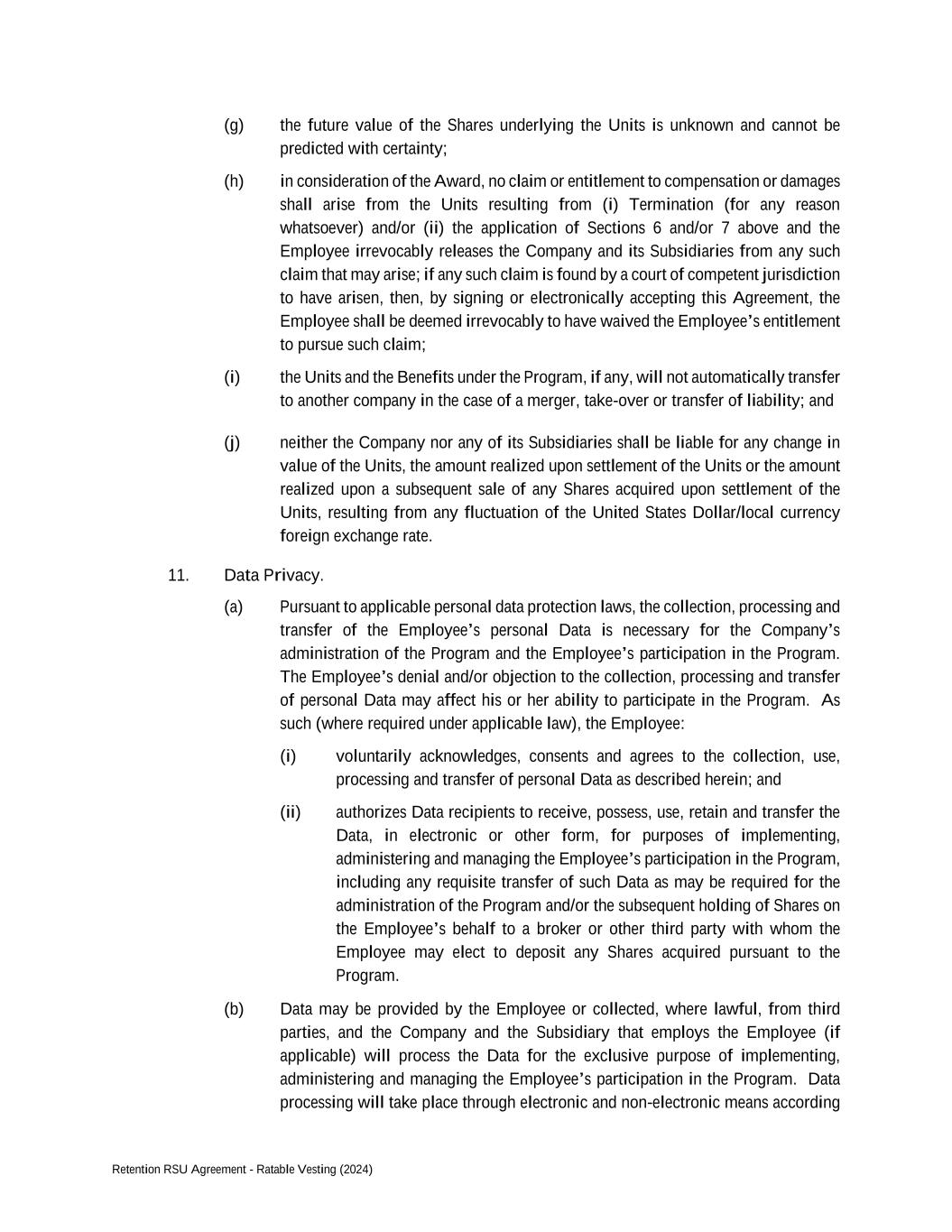 Retention RSU Agreement - Ratable Vesting (2024) (g) the future value of the Shares underlying the Units is unknown and cannot be predicted with certainty; (h) in consideration of the Award, no claim or entitlement to compensation or damages shall arise from the Units resulting from (i) Termination (for any reason whatsoever) and/or (ii) the application of Sections 6 and/or 7 above and the Employee irrevocably releases the Company and its Subsidiaries from any such claim that may arise; if any such claim is found by a court of competent jurisdiction to have arisen, then, by signing or electronically accepting this Agreement, the Employee shall be deemed irrevocably to have waived the Employee’s entitlement to pursue such claim; (i) the Units and the Benefits under the Program, if any, will not automatically transfer to another company in the case of a merger, take-over or transfer of liability; and (j) neither the Company nor any of its Subsidiaries shall be liable for any change in value of the Units, the amount realized upon settlement of the Units or the amount realized upon a subsequent sale of any Shares acquired upon settlement of the Units, resulting from any fluctuation of the United States Dollar/local currency foreign exchange rate. 11. Data Privacy. (a) Pursuant to applicable personal data protection laws, the collection, processing and transfer of the Employee’s personal Data is necessary for the Company’s administration of the Program and the Employee’s participation in the Program. The Employee’s denial and/or objection to the collection, processing and transfer of personal Data may affect his or her ability to participate in the Program. As such (where required under applicable law), the Employee: (i) voluntarily acknowledges, consents and agrees to the collection, use, processing and transfer of personal Data as described herein; and (ii) authorizes Data recipients to receive, possess, use, retain and transfer the Data, in electronic or other form, for purposes of implementing, administering and managing the Employee’s participation in the Program, including any requisite transfer of such Data as may be required for the administration of the Program and/or the subsequent holding of Shares on the Employee’s behalf to a broker or other third party with whom the Employee may elect to deposit any Shares acquired pursuant to the Program. (b) Data may be provided by the Employee or collected, where lawful, from third parties, and the Company and the Subsidiary that employs the Employee (if applicable) will process the Data for the exclusive purpose of implementing, administering and managing the Employee’s participation in the Program. Data processing will take place through electronic and non-electronic means according