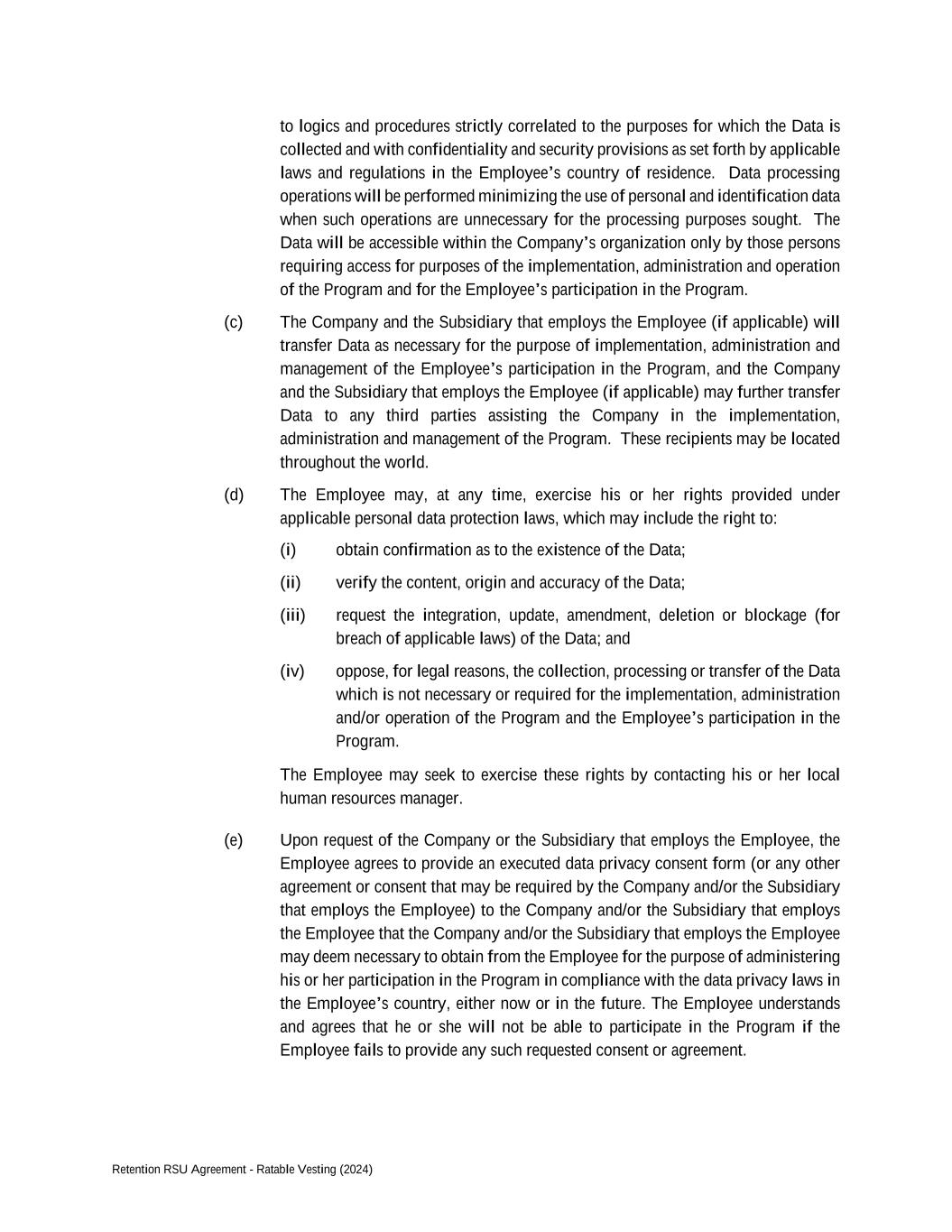 Retention RSU Agreement - Ratable Vesting (2024) to logics and procedures strictly correlated to the purposes for which the Data is collected and with confidentiality and security provisions as set forth by applicable laws and regulations in the Employee’s country of residence. Data processing operations will be performed minimizing the use of personal and identification data when such operations are unnecessary for the processing purposes sought. The Data will be accessible within the Company’s organization only by those persons requiring access for purposes of the implementation, administration and operation of the Program and for the Employee’s participation in the Program. (c) The Company and the Subsidiary that employs the Employee (if applicable) will transfer Data as necessary for the purpose of implementation, administration and management of the Employee’s participation in the Program, and the Company and the Subsidiary that employs the Employee (if applicable) may further transfer Data to any third parties assisting the Company in the implementation, administration and management of the Program. These recipients may be located throughout the world. (d) The Employee may, at any time, exercise his or her rights provided under applicable personal data protection laws, which may include the right to: (i) obtain confirmation as to the existence of the Data; (ii) verify the content, origin and accuracy of the Data; (iii) request the integration, update, amendment, deletion or blockage (for breach of applicable laws) of the Data; and (iv) oppose, for legal reasons, the collection, processing or transfer of the Data which is not necessary or required for the implementation, administration and/or operation of the Program and the Employee’s participation in the Program. The Employee may seek to exercise these rights by contacting his or her local human resources manager. (e) Upon request of the Company or the Subsidiary that employs the Employee, the Employee agrees to provide an executed data privacy consent form (or any other agreement or consent that may be required by the Company and/or the Subsidiary that employs the Employee) to the Company and/or the Subsidiary that employs the Employee that the Company and/or the Subsidiary that employs the Employee may deem necessary to obtain from the Employee for the purpose of administering his or her participation in the Program in compliance with the data privacy laws in the Employee’s country, either now or in the future. The Employee understands and agrees that he or she will not be able to participate in the Program if the Employee fails to provide any such requested consent or agreement.