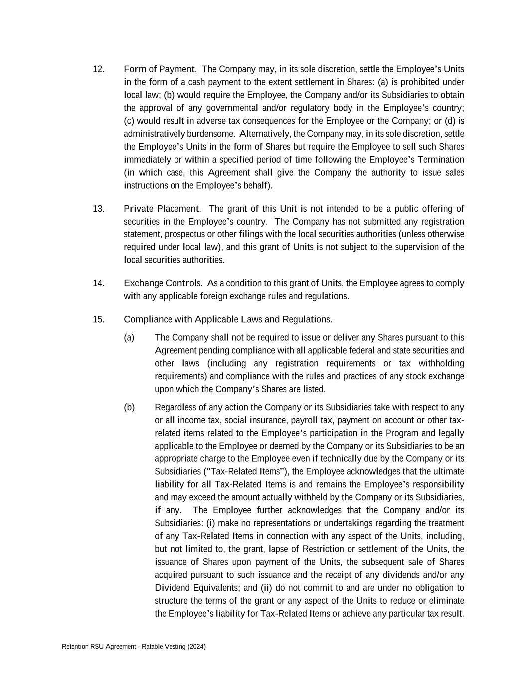 Retention RSU Agreement - Ratable Vesting (2024) 12. Form of Payment. The Company may, in its sole discretion, settle the Employee’s Units in the form of a cash payment to the extent settlement in Shares: (a) is prohibited under local law; (b) would require the Employee, the Company and/or its Subsidiaries to obtain the approval of any governmental and/or regulatory body in the Employee’s country; (c) would result in adverse tax consequences for the Employee or the Company; or (d) is administratively burdensome. Alternatively, the Company may, in its sole discretion, settle the Employee’s Units in the form of Shares but require the Employee to sell such Shares immediately or within a specified period of time following the Employee’s Termination (in which case, this Agreement shall give the Company the authority to issue sales instructions on the Employee’s behalf). 13. Private Placement. The grant of this Unit is not intended to be a public offering of securities in the Employee’s country. The Company has not submitted any registration statement, prospectus or other filings with the local securities authorities (unless otherwise required under local law), and this grant of Units is not subject to the supervision of the local securities authorities. 14. Exchange Controls. As a condition to this grant of Units, the Employee agrees to comply with any applicable foreign exchange rules and regulations. 15. Compliance with Applicable Laws and Regulations. (a) The Company shall not be required to issue or deliver any Shares pursuant to this Agreement pending compliance with all applicable federal and state securities and other laws (including any registration requirements or tax withholding requirements) and compliance with the rules and practices of any stock exchange upon which the Company’s Shares are listed. (b) Regardless of any action the Company or its Subsidiaries take with respect to any or all income tax, social insurance, payroll tax, payment on account or other tax- related items related to the Employee’s participation in the Program and legally applicable to the Employee or deemed by the Company or its Subsidiaries to be an appropriate charge to the Employee even if technically due by the Company or its Subsidiaries (“Tax-Related Items”), the Employee acknowledges that the ultimate liability for all Tax-Related Items is and remains the Employee’s responsibility and may exceed the amount actually withheld by the Company or its Subsidiaries, if any. The Employee further acknowledges that the Company and/or its Subsidiaries: (i) make no representations or undertakings regarding the treatment of any Tax-Related Items in connection with any aspect of the Units, including, but not limited to, the grant, lapse of Restriction or settlement of the Units, the issuance of Shares upon payment of the Units, the subsequent sale of Shares acquired pursuant to such issuance and the receipt of any dividends and/or any Dividend Equivalents; and (ii) do not commit to and are under no obligation to structure the terms of the grant or any aspect of the Units to reduce or eliminate the Employee’s liability for Tax-Related Items or achieve any particular tax result.