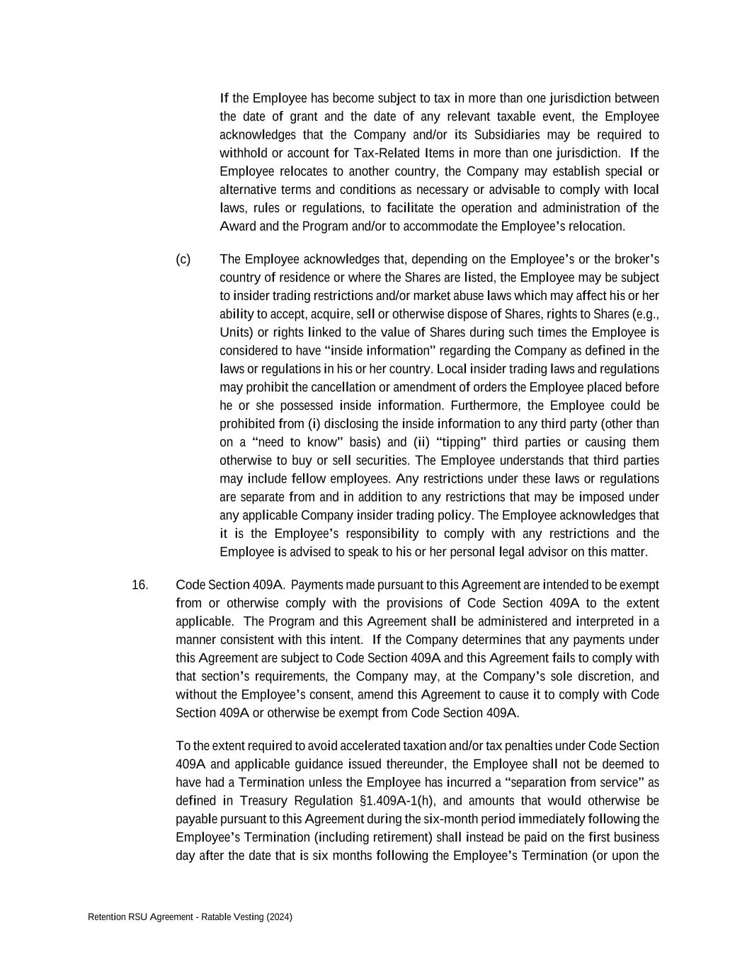 Retention RSU Agreement - Ratable Vesting (2024) If the Employee has become subject to tax in more than one jurisdiction between the date of grant and the date of any relevant taxable event, the Employee acknowledges that the Company and/or its Subsidiaries may be required to withhold or account for Tax-Related Items in more than one jurisdiction. If the Employee relocates to another country, the Company may establish special or alternative terms and conditions as necessary or advisable to comply with local laws, rules or regulations, to facilitate the operation and administration of the Award and the Program and/or to accommodate the Employee’s relocation. (c) The Employee acknowledges that, depending on the Employee’s or the broker’s country of residence or where the Shares are listed, the Employee may be subject to insider trading restrictions and/or market abuse laws which may affect his or her ability to accept, acquire, sell or otherwise dispose of Shares, rights to Shares (e.g., Units) or rights linked to the value of Shares during such times the Employee is considered to have “inside information” regarding the Company as defined in the laws or regulations in his or her country. Local insider trading laws and regulations may prohibit the cancellation or amendment of orders the Employee placed before he or she possessed inside information. Furthermore, the Employee could be prohibited from (i) disclosing the inside information to any third party (other than on a “need to know” basis) and (ii) “tipping” third parties or causing them otherwise to buy or sell securities. The Employee understands that third parties may include fellow employees. Any restrictions under these laws or regulations are separate from and in addition to any restrictions that may be imposed under any applicable Company insider trading policy. The Employee acknowledges that it is the Employee’s responsibility to comply with any restrictions and the Employee is advised to speak to his or her personal legal advisor on this matter. 16. Code Section 409A. Payments made pursuant to this Agreement are intended to be exempt from or otherwise comply with the provisions of Code Section 409A to the extent applicable. The Program and this Agreement shall be administered and interpreted in a manner consistent with this intent. If the Company determines that any payments under this Agreement are subject to Code Section 409A and this Agreement fails to comply with that section’s requirements, the Company may, at the Company’s sole discretion, and without the Employee’s consent, amend this Agreement to cause it to comply with Code Section 409A or otherwise be exempt from Code Section 409A. To the extent required to avoid accelerated taxation and/or tax penalties under Code Section 409A and applicable guidance issued thereunder, the Employee shall not be deemed to have had a Termination unless the Employee has incurred a “separation from service” as defined in Treasury Regulation §1.409A-1(h), and amounts that would otherwise be payable pursuant to this Agreement during the six-month period immediately following the Employee’s Termination (including retirement) shall instead be paid on the first business day after the date that is six months following the Employee’s Termination (or upon the
