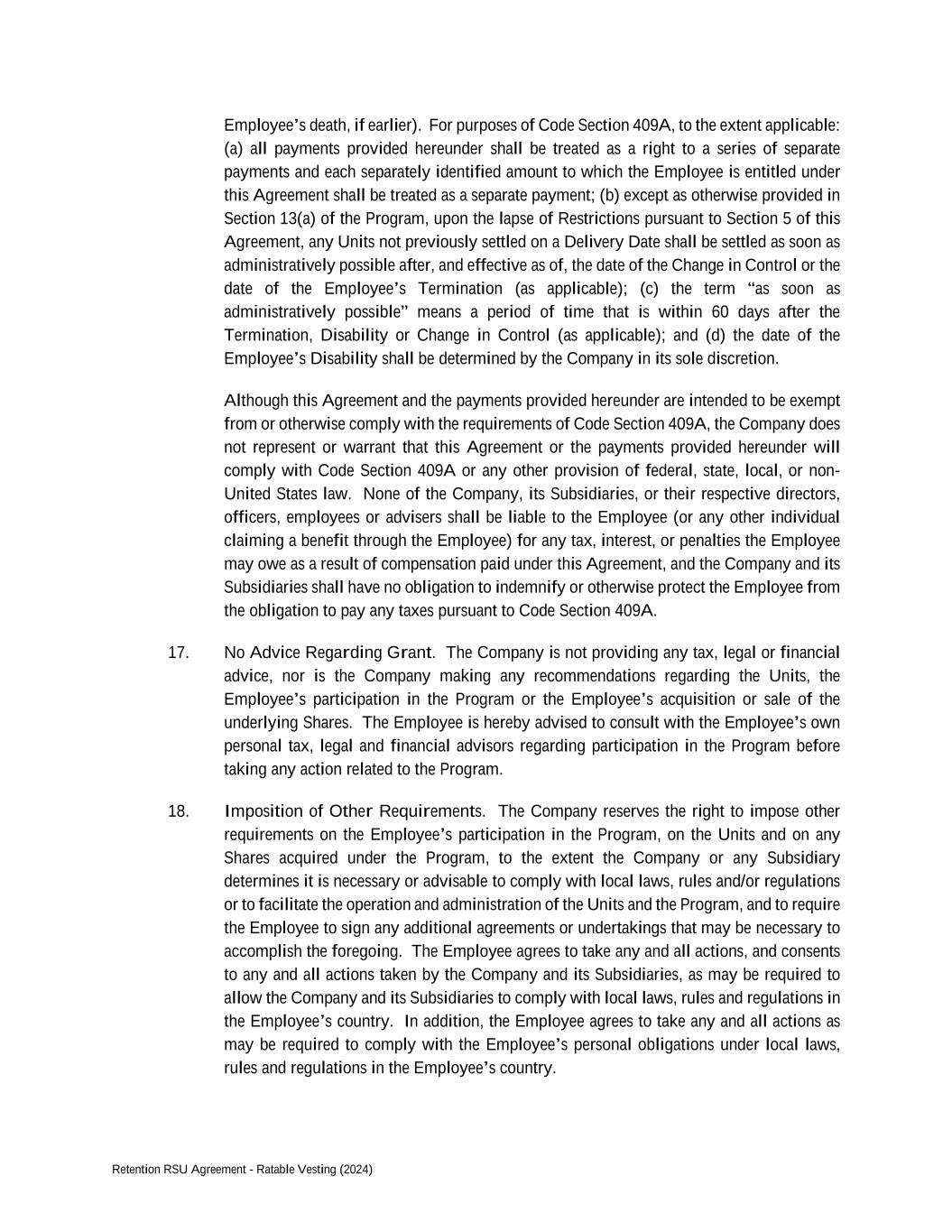 Retention RSU Agreement - Ratable Vesting (2024) Employee’s death, if earlier). For purposes of Code Section 409A, to the extent applicable: (a) all payments provided hereunder shall be treated as a right to a series of separate payments and each separately identified amount to which the Employee is entitled under this Agreement shall be treated as a separate payment; (b) except as otherwise provided in Section 13(a) of the Program, upon the lapse of Restrictions pursuant to Section 5 of this Agreement, any Units not previously settled on a Delivery Date shall be settled as soon as administratively possible after, and effective as of, the date of the Change in Control or the date of the Employee’s Termination (as applicable); (c) the term “as soon as administratively possible” means a period of time that is within 60 days after the Termination, Disability or Change in Control (as applicable); and (d) the date of the Employee’s Disability shall be determined by the Company in its sole discretion. Although this Agreement and the payments provided hereunder are intended to be exempt from or otherwise comply with the requirements of Code Section 409A, the Company does not represent or warrant that this Agreement or the payments provided hereunder will comply with Code Section 409A or any other provision of federal, state, local, or non- United States law. None of the Company, its Subsidiaries, or their respective directors, officers, employees or advisers shall be liable to the Employee (or any other individual claiming a benefit through the Employee) for any tax, interest, or penalties the Employee may owe as a result of compensation paid under this Agreement, and the Company and its Subsidiaries shall have no obligation to indemnify or otherwise protect the Employee from the obligation to pay any taxes pursuant to Code Section 409A. 17. No Advice Regarding Grant. The Company is not providing any tax, legal or financial advice, nor is the Company making any recommendations regarding the Units, the Employee’s participation in the Program or the Employee’s acquisition or sale of the underlying Shares. The Employee is hereby advised to consult with the Employee’s own personal tax, legal and financial advisors regarding participation in the Program before taking any action related to the Program. 18. Imposition of Other Requirements. The Company reserves the right to impose other requirements on the Employee’s participation in the Program, on the Units and on any Shares acquired under the Program, to the extent the Company or any Subsidiary determines it is necessary or advisable to comply with local laws, rules and/or regulations or to facilitate the operation and administration of the Units and the Program, and to require the Employee to sign any additional agreements or undertakings that may be necessary to accomplish the foregoing. The Employee agrees to take any and all actions, and consents to any and all actions taken by the Company and its Subsidiaries, as may be required to allow the Company and its Subsidiaries to comply with local laws, rules and regulations in the Employee’s country. In addition, the Employee agrees to take any and all actions as may be required to comply with the Employee’s personal obligations under local laws, rules and regulations in the Employee’s country.