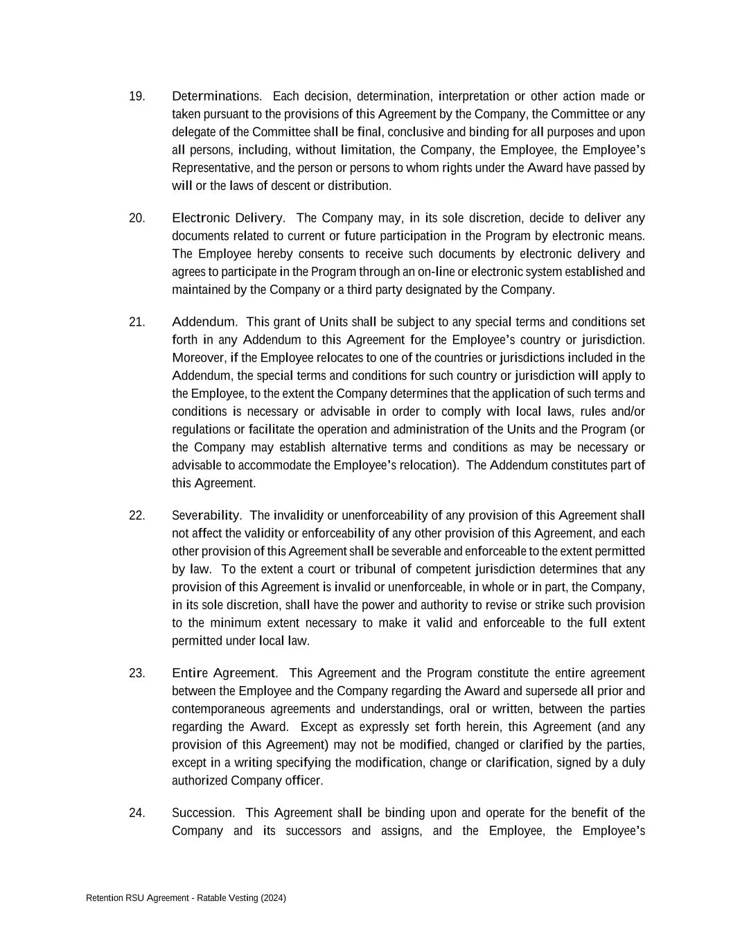 Retention RSU Agreement - Ratable Vesting (2024) 19. Determinations. Each decision, determination, interpretation or other action made or taken pursuant to the provisions of this Agreement by the Company, the Committee or any delegate of the Committee shall be final, conclusive and binding for all purposes and upon all persons, including, without limitation, the Company, the Employee, the Employee’s Representative, and the person or persons to whom rights under the Award have passed by will or the laws of descent or distribution. 20. Electronic Delivery. The Company may, in its sole discretion, decide to deliver any documents related to current or future participation in the Program by electronic means. The Employee hereby consents to receive such documents by electronic delivery and agrees to participate in the Program through an on-line or electronic system established and maintained by the Company or a third party designated by the Company. 21. Addendum. This grant of Units shall be subject to any special terms and conditions set forth in any Addendum to this Agreement for the Employee’s country or jurisdiction. Moreover, if the Employee relocates to one of the countries or jurisdictions included in the Addendum, the special terms and conditions for such country or jurisdiction will apply to the Employee, to the extent the Company determines that the application of such terms and conditions is necessary or advisable in order to comply with local laws, rules and/or regulations or facilitate the operation and administration of the Units and the Program (or the Company may establish alternative terms and conditions as may be necessary or advisable to accommodate the Employee’s relocation). The Addendum constitutes part of this Agreement. 22. Severability. The invalidity or unenforceability of any provision of this Agreement shall not affect the validity or enforceability of any other provision of this Agreement, and each other provision of this Agreement shall be severable and enforceable to the extent permitted by law. To the extent a court or tribunal of competent jurisdiction determines that any provision of this Agreement is invalid or unenforceable, in whole or in part, the Company, in its sole discretion, shall have the power and authority to revise or strike such provision to the minimum extent necessary to make it valid and enforceable to the full extent permitted under local law. 23. Entire Agreement. This Agreement and the Program constitute the entire agreement between the Employee and the Company regarding the Award and supersede all prior and contemporaneous agreements and understandings, oral or written, between the parties regarding the Award. Except as expressly set forth herein, this Agreement (and any provision of this Agreement) may not be modified, changed or clarified by the parties, except in a writing specifying the modification, change or clarification, signed by a duly authorized Company officer. 24. Succession. This Agreement shall be binding upon and operate for the benefit of the Company and its successors and assigns, and the Employee, the Employee’s