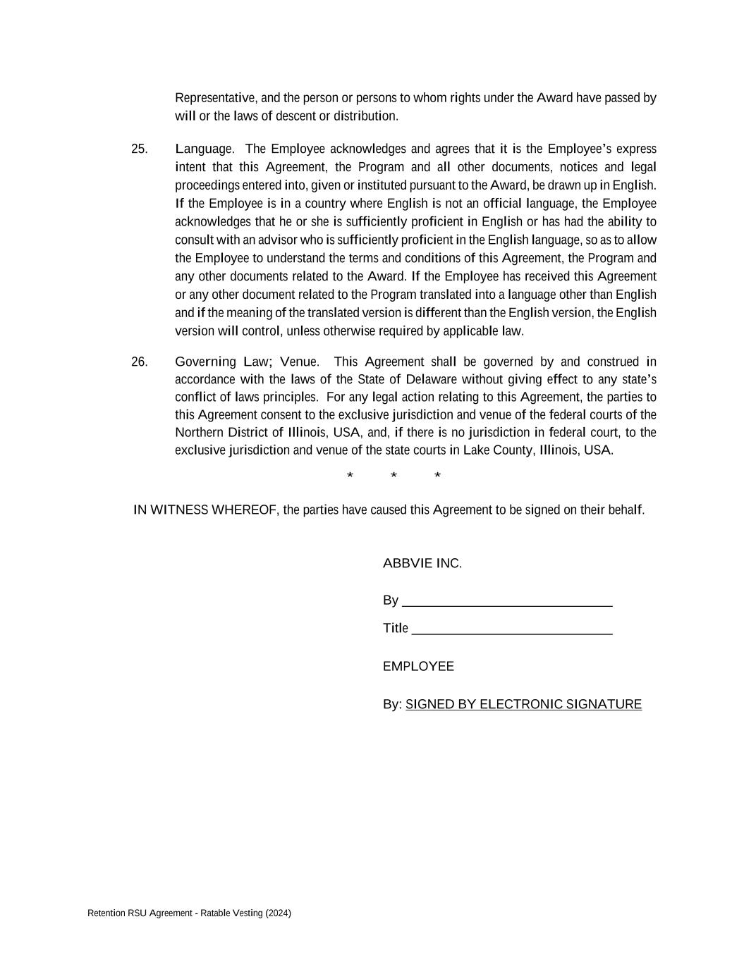 Retention RSU Agreement - Ratable Vesting (2024) Representative, and the person or persons to whom rights under the Award have passed by will or the laws of descent or distribution. 25. Language. The Employee acknowledges and agrees that it is the Employee’s express intent that this Agreement, the Program and all other documents, notices and legal proceedings entered into, given or instituted pursuant to the Award, be drawn up in English. If the Employee is in a country where English is not an official language, the Employee acknowledges that he or she is sufficiently proficient in English or has had the ability to consult with an advisor who is sufficiently proficient in the English language, so as to allow the Employee to understand the terms and conditions of this Agreement, the Program and any other documents related to the Award. If the Employee has received this Agreement or any other document related to the Program translated into a language other than English and if the meaning of the translated version is different than the English version, the English version will control, unless otherwise required by applicable law. 26. Governing Law; Venue. This Agreement shall be governed by and construed in accordance with the laws of the State of Delaware without giving effect to any state’s conflict of laws principles. For any legal action relating to this Agreement, the parties to this Agreement consent to the exclusive jurisdiction and venue of the federal courts of the Northern District of Illinois, USA, and, if there is no jurisdiction in federal court, to the exclusive jurisdiction and venue of the state courts in Lake County, Illinois, USA. * * * IN WITNESS WHEREOF, the parties have caused this Agreement to be signed on their behalf. ABBVIE INC. By Title EMPLOYEE By: SIGNED BY ELECTRONIC SIGNATURE