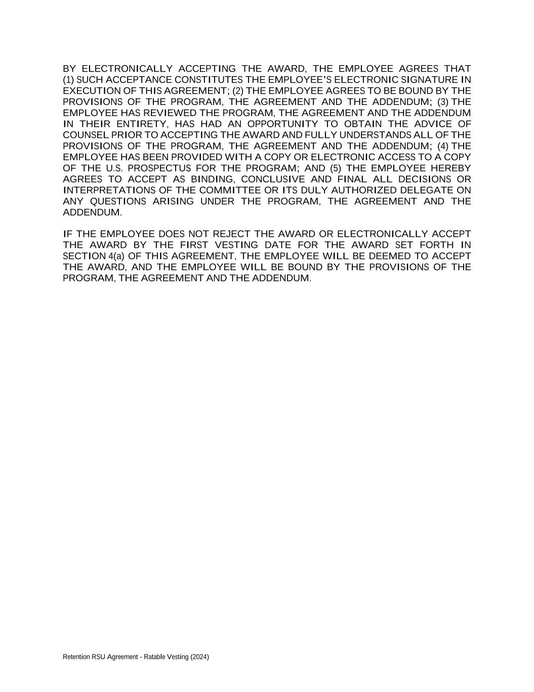 Retention RSU Agreement - Ratable Vesting (2024) BY ELECTRONICALLY ACCEPTING THE AWARD, THE EMPLOYEE AGREES THAT (1) SUCH ACCEPTANCE CONSTITUTES THE EMPLOYEE’S ELECTRONIC SIGNATURE IN EXECUTION OF THIS AGREEMENT; (2) THE EMPLOYEE AGREES TO BE BOUND BY THE PROVISIONS OF THE PROGRAM, THE AGREEMENT AND THE ADDENDUM; (3) THE EMPLOYEE HAS REVIEWED THE PROGRAM, THE AGREEMENT AND THE ADDENDUM IN THEIR ENTIRETY, HAS HAD AN OPPORTUNITY TO OBTAIN THE ADVICE OF COUNSEL PRIOR TO ACCEPTING THE AWARD AND FULLY UNDERSTANDS ALL OF THE PROVISIONS OF THE PROGRAM, THE AGREEMENT AND THE ADDENDUM; (4) THE EMPLOYEE HAS BEEN PROVIDED WITH A COPY OR ELECTRONIC ACCESS TO A COPY OF THE U.S. PROSPECTUS FOR THE PROGRAM; AND (5) THE EMPLOYEE HEREBY AGREES TO ACCEPT AS BINDING, CONCLUSIVE AND FINAL ALL DECISIONS OR INTERPRETATIONS OF THE COMMITTEE OR ITS DULY AUTHORIZED DELEGATE ON ANY QUESTIONS ARISING UNDER THE PROGRAM, THE AGREEMENT AND THE ADDENDUM. IF THE EMPLOYEE DOES NOT REJECT THE AWARD OR ELECTRONICALLY ACCEPT THE AWARD BY THE FIRST VESTING DATE FOR THE AWARD SET FORTH IN SECTION 4(a) OF THIS AGREEMENT, THE EMPLOYEE WILL BE DEEMED TO ACCEPT THE AWARD, AND THE EMPLOYEE WILL BE BOUND BY THE PROVISIONS OF THE PROGRAM, THE AGREEMENT AND THE ADDENDUM.