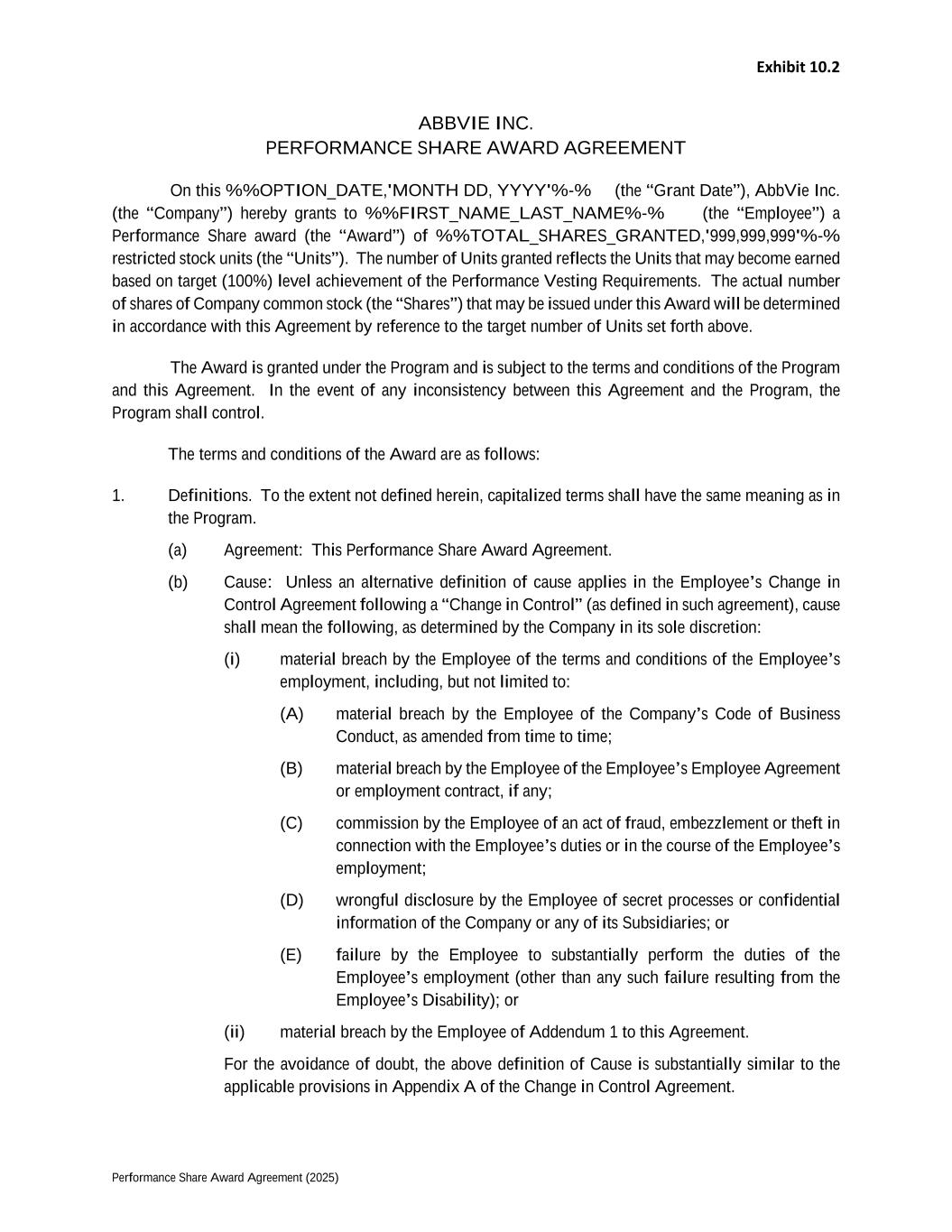 Exhibit 10.2 Performance Share Award Agreement (2025) ABBVIE INC. PERFORMANCE SHARE AWARD AGREEMENT On this %%OPTION_DATE,'MONTH DD, YYYY'%-% (the “Grant Date”), AbbVie Inc. (the “Company”) hereby grants to %%FIRST_NAME_LAST_NAME%-% (the “Employee”) a Performance Share award (the “Award”) of %%TOTAL_SHARES_GRANTED,'999,999,999'%-% restricted stock units (the “Units”). The number of Units granted reflects the Units that may become earned based on target (100%) level achievement of the Performance Vesting Requirements. The actual number of shares of Company common stock (the “Shares”) that may be issued under this Award will be determined in accordance with this Agreement by reference to the target number of Units set forth above. The Award is granted under the Program and is subject to the terms and conditions of the Program and this Agreement. In the event of any inconsistency between this Agreement and the Program, the Program shall control. The terms and conditions of the Award are as follows: 1. Definitions. To the extent not defined herein, capitalized terms shall have the same meaning as in the Program. (a) Agreement: This Performance Share Award Agreement. (b) Cause: Unless an alternative definition of cause applies in the Employee’s Change in Control Agreement following a “Change in Control” (as defined in such agreement), cause shall mean the following, as determined by the Company in its sole discretion: (i) material breach by the Employee of the terms and conditions of the Employee’s employment, including, but not limited to: (A) material breach by the Employee of the Company’s Code of Business Conduct, as amended from time to time; (B) material breach by the Employee of the Employee’s Employee Agreement or employment contract, if any; (C) commission by the Employee of an act of fraud, embezzlement or theft in connection with the Employee’s duties or in the course of the Employee’s employment; (D) wrongful disclosure by the Employee of secret processes or confidential information of the Company or any of its Subsidiaries; or (E) failure by the Employee to substantially perform the duties of the Employee’s employment (other than any such failure resulting from the Employee’s Disability); or (ii) material breach by the Employee of Addendum 1 to this Agreement. For the avoidance of doubt, the above definition of Cause is substantially similar to the applicable provisions in Appendix A of the Change in Control Agreement.