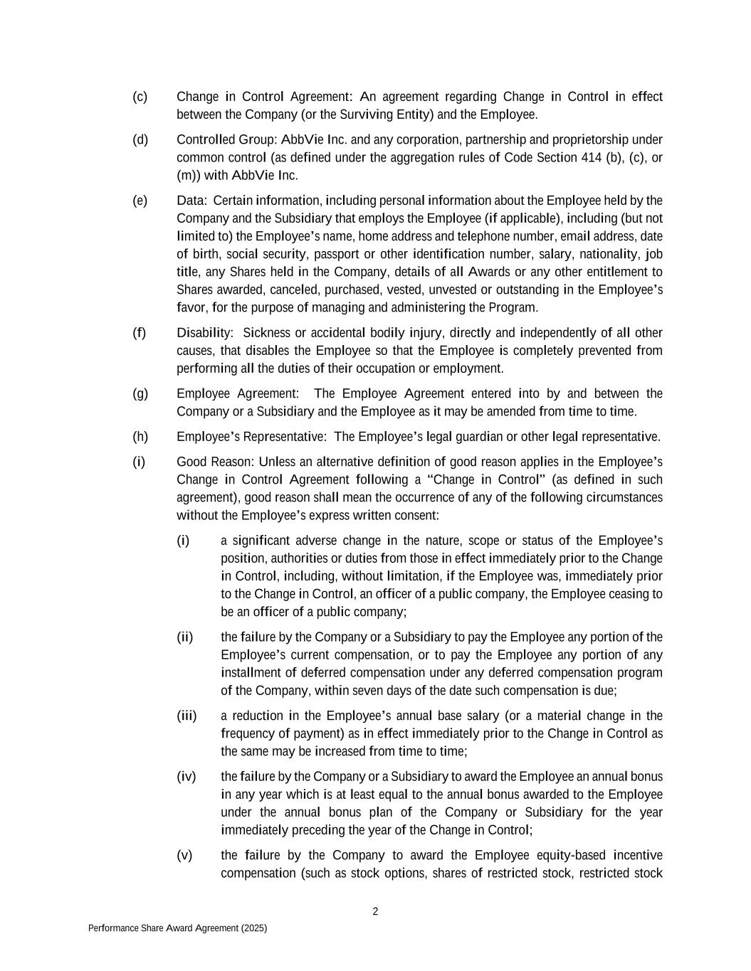 2 Performance Share Award Agreement (2025) (c) Change in Control Agreement: An agreement regarding Change in Control in effect between the Company (or the Surviving Entity) and the Employee. (d) Controlled Group: AbbVie Inc. and any corporation, partnership and proprietorship under common control (as defined under the aggregation rules of Code Section 414 (b), (c), or (m)) with AbbVie Inc. (e) Data: Certain information, including personal information about the Employee held by the Company and the Subsidiary that employs the Employee (if applicable), including (but not limited to) the Employee’s name, home address and telephone number, email address, date of birth, social security, passport or other identification number, salary, nationality, job title, any Shares held in the Company, details of all Awards or any other entitlement to Shares awarded, canceled, purchased, vested, unvested or outstanding in the Employee’s favor, for the purpose of managing and administering the Program. (f) Disability: Sickness or accidental bodily injury, directly and independently of all other causes, that disables the Employee so that the Employee is completely prevented from performing all the duties of their occupation or employment. (g) Employee Agreement: The Employee Agreement entered into by and between the Company or a Subsidiary and the Employee as it may be amended from time to time. (h) Employee’s Representative: The Employee’s legal guardian or other legal representative. (i) Good Reason: Unless an alternative definition of good reason applies in the Employee’s Change in Control Agreement following a “Change in Control” (as defined in such agreement), good reason shall mean the occurrence of any of the following circumstances without the Employee’s express written consent: (i) a significant adverse change in the nature, scope or status of the Employee’s position, authorities or duties from those in effect immediately prior to the Change in Control, including, without limitation, if the Employee was, immediately prior to the Change in Control, an officer of a public company, the Employee ceasing to be an officer of a public company; (ii) the failure by the Company or a Subsidiary to pay the Employee any portion of the Employee’s current compensation, or to pay the Employee any portion of any installment of deferred compensation under any deferred compensation program of the Company, within seven days of the date such compensation is due; (iii) a reduction in the Employee’s annual base salary (or a material change in the frequency of payment) as in effect immediately prior to the Change in Control as the same may be increased from time to time; (iv) the failure by the Company or a Subsidiary to award the Employee an annual bonus in any year which is at least equal to the annual bonus awarded to the Employee under the annual bonus plan of the Company or Subsidiary for the year immediately preceding the year of the Change in Control; (v) the failure by the Company to award the Employee equity-based incentive compensation (such as stock options, shares of restricted stock, restricted stock