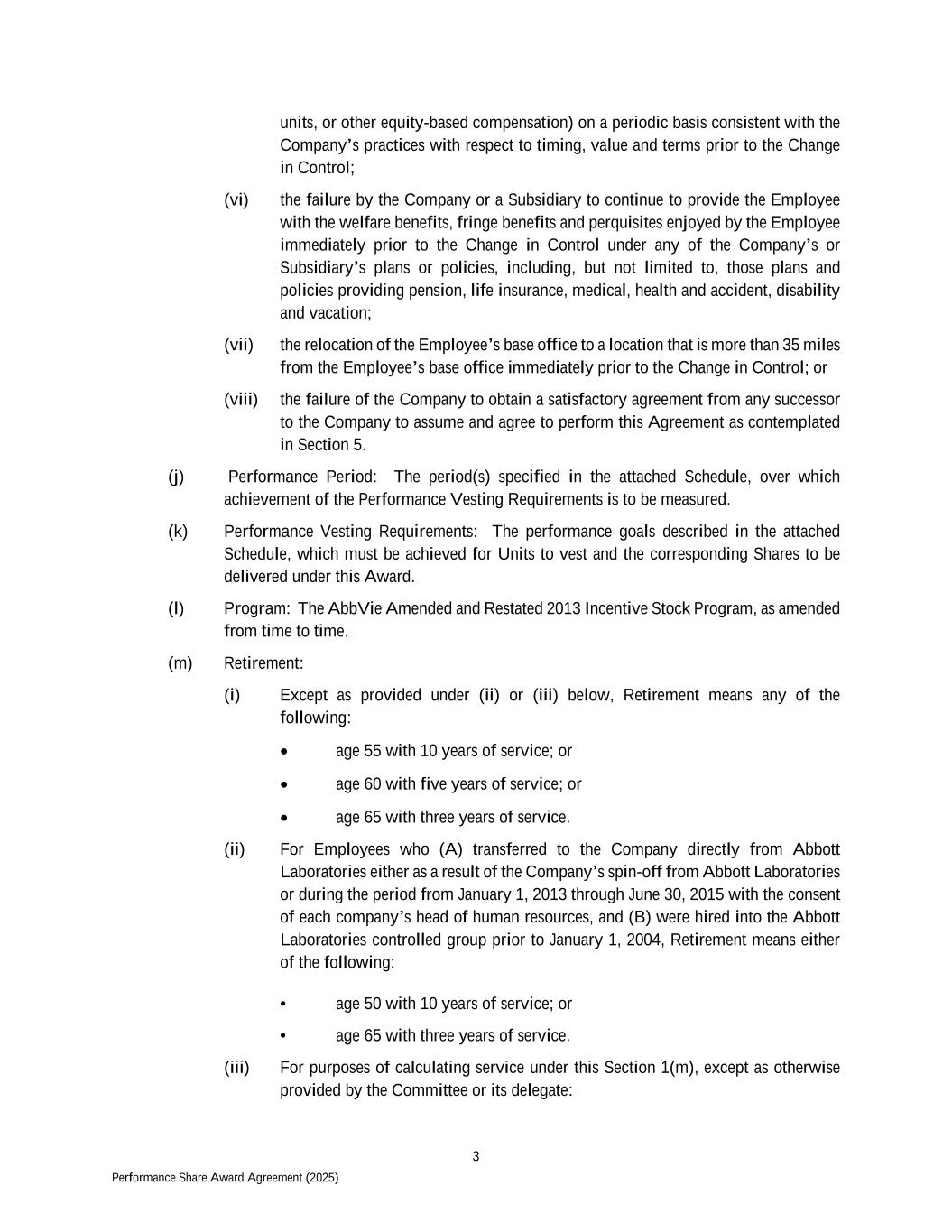 3 Performance Share Award Agreement (2025) units, or other equity-based compensation) on a periodic basis consistent with the Company’s practices with respect to timing, value and terms prior to the Change in Control; (vi) the failure by the Company or a Subsidiary to continue to provide the Employee with the welfare benefits, fringe benefits and perquisites enjoyed by the Employee immediately prior to the Change in Control under any of the Company’s or Subsidiary’s plans or policies, including, but not limited to, those plans and policies providing pension, life insurance, medical, health and accident, disability and vacation; (vii) the relocation of the Employee’s base office to a location that is more than 35 miles from the Employee’s base office immediately prior to the Change in Control; or (viii) the failure of the Company to obtain a satisfactory agreement from any successor to the Company to assume and agree to perform this Agreement as contemplated in Section 5. (j) Performance Period: The period(s) specified in the attached Schedule, over which achievement of the Performance Vesting Requirements is to be measured. (k) Performance Vesting Requirements: The performance goals described in the attached Schedule, which must be achieved for Units to vest and the corresponding Shares to be delivered under this Award. (l) Program: The AbbVie Amended and Restated 2013 Incentive Stock Program, as amended from time to time. (m) Retirement: (i) Except as provided under (ii) or (iii) below, Retirement means any of the following:  age 55 with 10 years of service; or  age 60 with five years of service; or  age 65 with three years of service. (ii) For Employees who (A) transferred to the Company directly from Abbott Laboratories either as a result of the Company’s spin-off from Abbott Laboratories or during the period from January 1, 2013 through June 30, 2015 with the consent of each company’s head of human resources, and (B) were hired into the Abbott Laboratories controlled group prior to January 1, 2004, Retirement means either of the following: • age 50 with 10 years of service; or • age 65 with three years of service. (iii) For purposes of calculating service under this Section 1(m), except as otherwise provided by the Committee or its delegate: