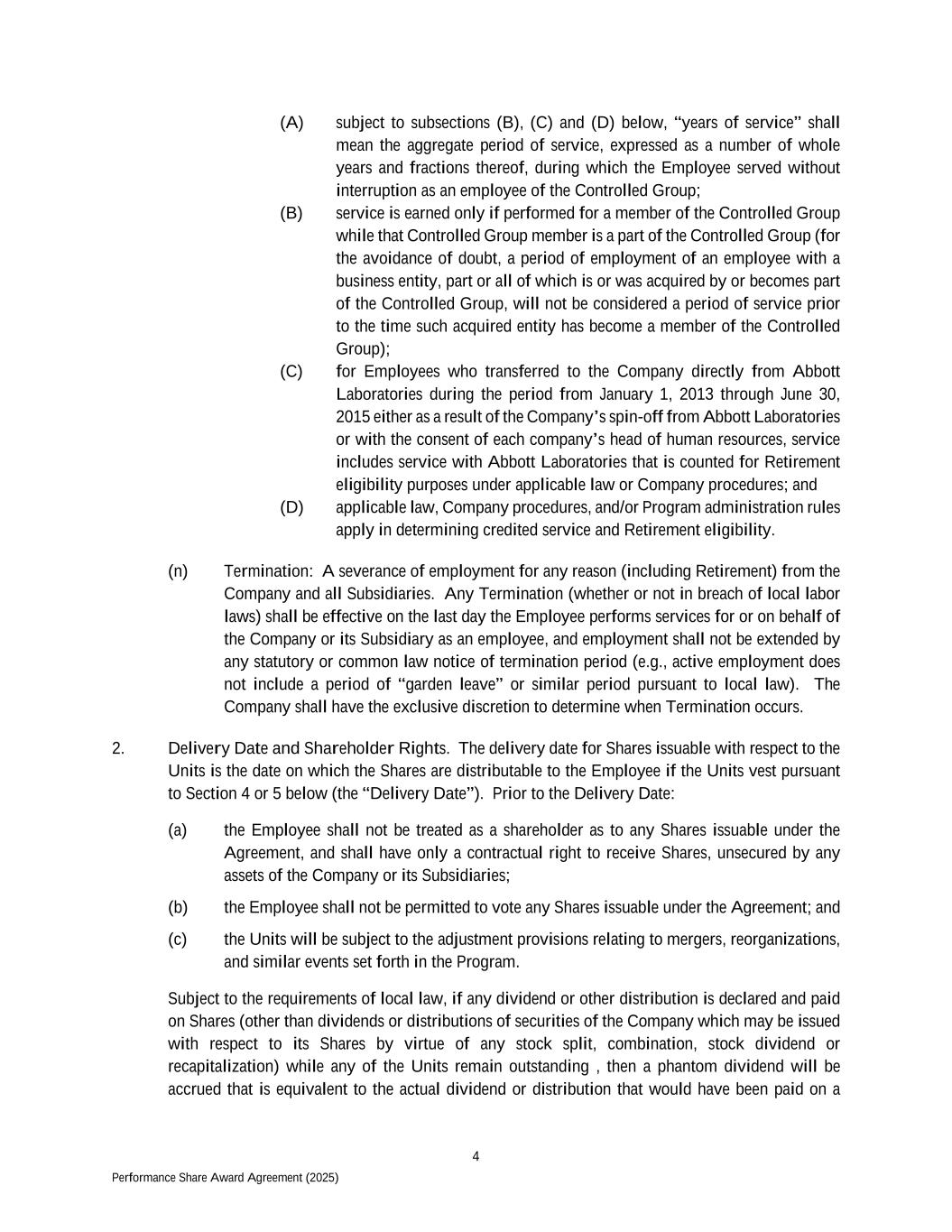 4 Performance Share Award Agreement (2025) (A) subject to subsections (B), (C) and (D) below, “years of service” shall mean the aggregate period of service, expressed as a number of whole years and fractions thereof, during which the Employee served without interruption as an employee of the Controlled Group; (B) service is earned only if performed for a member of the Controlled Group while that Controlled Group member is a part of the Controlled Group (for the avoidance of doubt, a period of employment of an employee with a business entity, part or all of which is or was acquired by or becomes part of the Controlled Group, will not be considered a period of service prior to the time such acquired entity has become a member of the Controlled Group); (C) for Employees who transferred to the Company directly from Abbott Laboratories during the period from January 1, 2013 through June 30, 2015 either as a result of the Company’s spin-off from Abbott Laboratories or with the consent of each company’s head of human resources, service includes service with Abbott Laboratories that is counted for Retirement eligibility purposes under applicable law or Company procedures; and (D) applicable law, Company procedures, and/or Program administration rules apply in determining credited service and Retirement eligibility. (n) Termination: A severance of employment for any reason (including Retirement) from the Company and all Subsidiaries. Any Termination (whether or not in breach of local labor laws) shall be effective on the last day the Employee performs services for or on behalf of the Company or its Subsidiary as an employee, and employment shall not be extended by any statutory or common law notice of termination period (e.g., active employment does not include a period of “garden leave” or similar period pursuant to local law). The Company shall have the exclusive discretion to determine when Termination occurs. 2. Delivery Date and Shareholder Rights. The delivery date for Shares issuable with respect to the Units is the date on which the Shares are distributable to the Employee if the Units vest pursuant to Section 4 or 5 below (the “Delivery Date”). Prior to the Delivery Date: (a) the Employee shall not be treated as a shareholder as to any Shares issuable under the Agreement, and shall have only a contractual right to receive Shares, unsecured by any assets of the Company or its Subsidiaries; (b) the Employee shall not be permitted to vote any Shares issuable under the Agreement; and (c) the Units will be subject to the adjustment provisions relating to mergers, reorganizations, and similar events set forth in the Program. Subject to the requirements of local law, if any dividend or other distribution is declared and paid on Shares (other than dividends or distributions of securities of the Company which may be issued with respect to its Shares by virtue of any stock split, combination, stock dividend or recapitalization) while any of the Units remain outstanding , then a phantom dividend will be accrued that is equivalent to the actual dividend or distribution that would have been paid on a