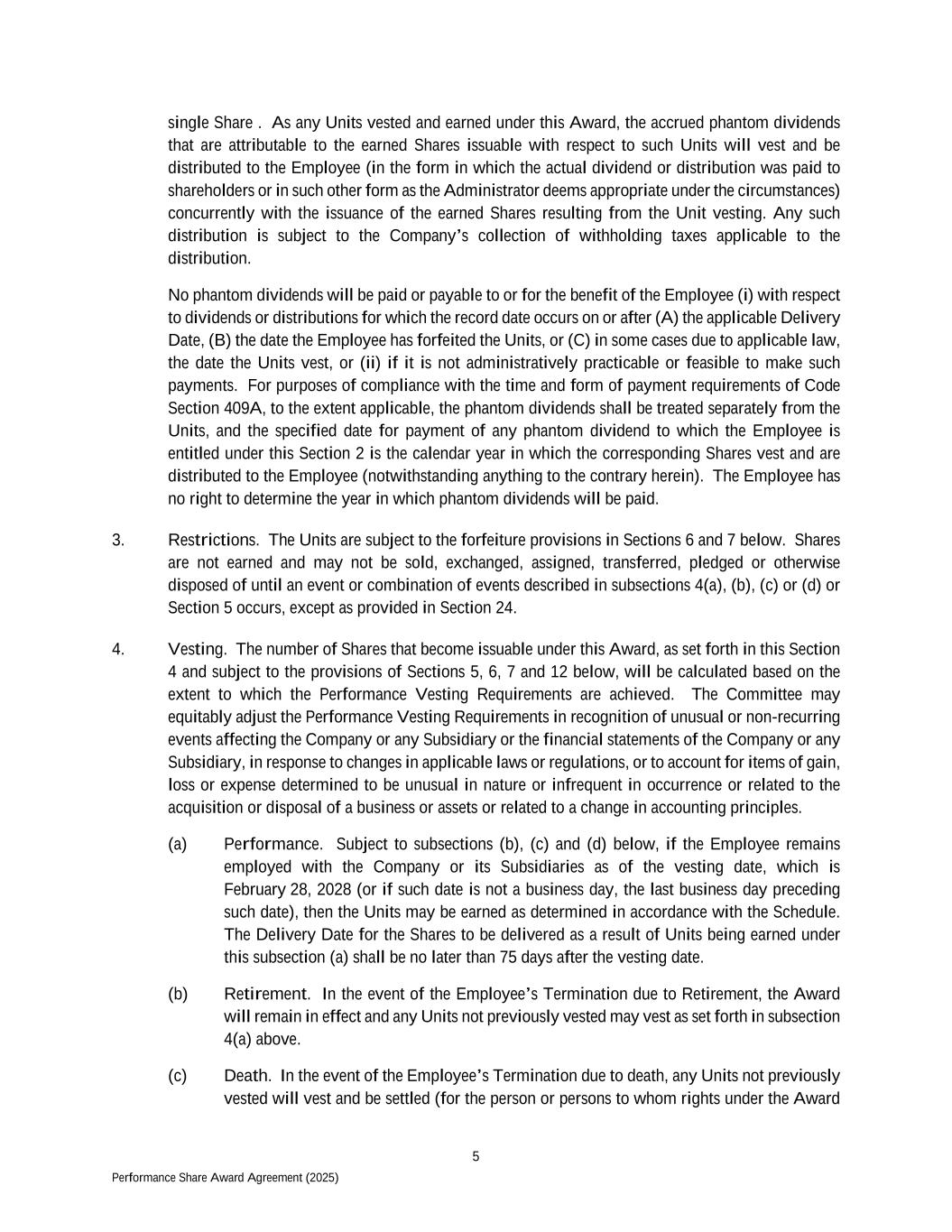 5 Performance Share Award Agreement (2025) single Share . As any Units vested and earned under this Award, the accrued phantom dividends that are attributable to the earned Shares issuable with respect to such Units will vest and be distributed to the Employee (in the form in which the actual dividend or distribution was paid to shareholders or in such other form as the Administrator deems appropriate under the circumstances) concurrently with the issuance of the earned Shares resulting from the Unit vesting. Any such distribution is subject to the Company’s collection of withholding taxes applicable to the distribution. No phantom dividends will be paid or payable to or for the benefit of the Employee (i) with respect to dividends or distributions for which the record date occurs on or after (A) the applicable Delivery Date, (B) the date the Employee has forfeited the Units, or (C) in some cases due to applicable law, the date the Units vest, or (ii) if it is not administratively practicable or feasible to make such payments. For purposes of compliance with the time and form of payment requirements of Code Section 409A, to the extent applicable, the phantom dividends shall be treated separately from the Units, and the specified date for payment of any phantom dividend to which the Employee is entitled under this Section 2 is the calendar year in which the corresponding Shares vest and are distributed to the Employee (notwithstanding anything to the contrary herein). The Employee has no right to determine the year in which phantom dividends will be paid. 3. Restrictions. The Units are subject to the forfeiture provisions in Sections 6 and 7 below. Shares are not earned and may not be sold, exchanged, assigned, transferred, pledged or otherwise disposed of until an event or combination of events described in subsections 4(a), (b), (c) or (d) or Section 5 occurs, except as provided in Section 24. 4. Vesting. The number of Shares that become issuable under this Award, as set forth in this Section 4 and subject to the provisions of Sections 5, 6, 7 and 12 below, will be calculated based on the extent to which the Performance Vesting Requirements are achieved. The Committee may equitably adjust the Performance Vesting Requirements in recognition of unusual or non-recurring events affecting the Company or any Subsidiary or the financial statements of the Company or any Subsidiary, in response to changes in applicable laws or regulations, or to account for items of gain, loss or expense determined to be unusual in nature or infrequent in occurrence or related to the acquisition or disposal of a business or assets or related to a change in accounting principles. (a) Performance. Subject to subsections (b), (c) and (d) below, if the Employee remains employed with the Company or its Subsidiaries as of the vesting date, which is February 28, 2028 (or if such date is not a business day, the last business day preceding such date), then the Units may be earned as determined in accordance with the Schedule. The Delivery Date for the Shares to be delivered as a result of Units being earned under this subsection (a) shall be no later than 75 days after the vesting date. (b) Retirement. In the event of the Employee’s Termination due to Retirement, the Award will remain in effect and any Units not previously vested may vest as set forth in subsection 4(a) above. (c) Death. In the event of the Employee’s Termination due to death, any Units not previously vested will vest and be settled (for the person or persons to whom rights under the Award