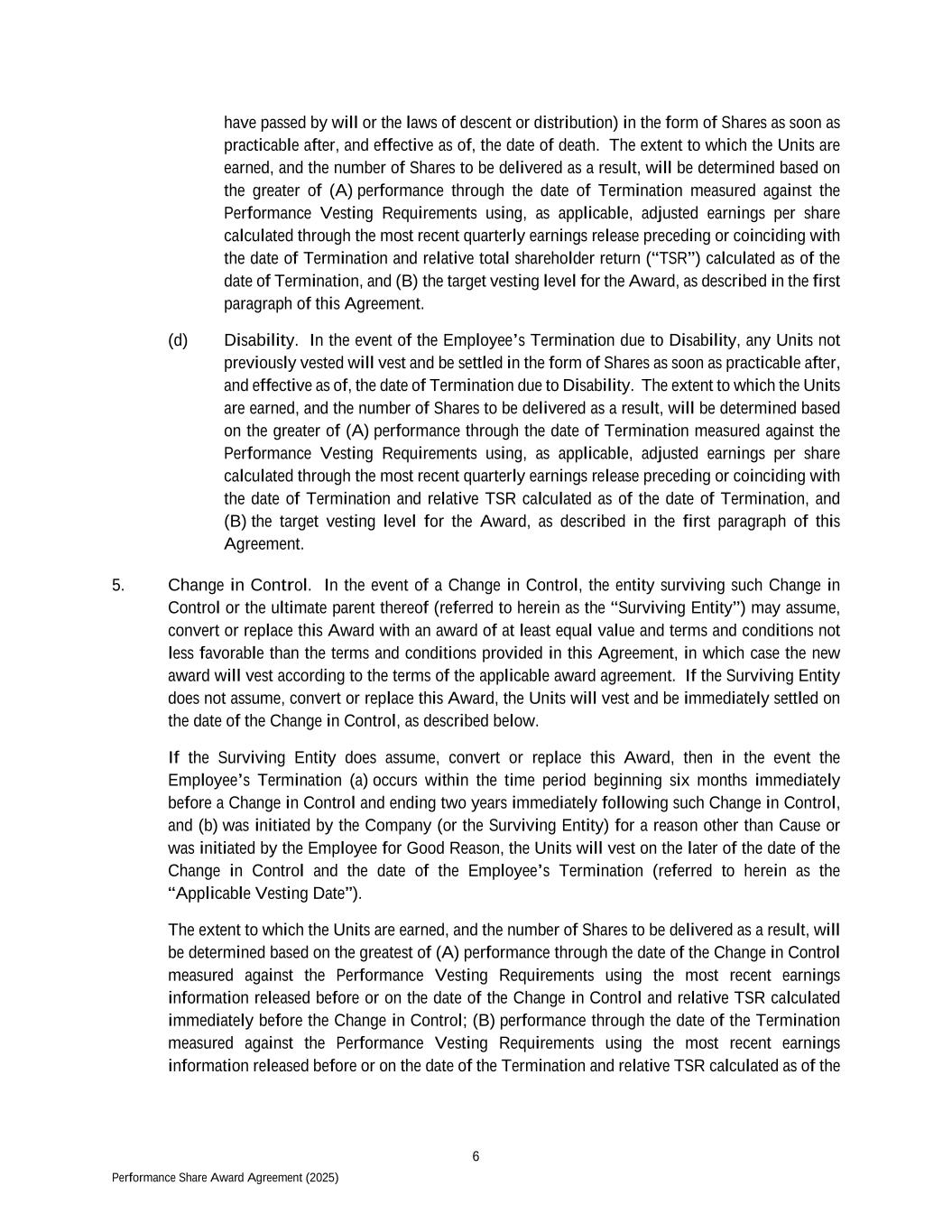 6 Performance Share Award Agreement (2025) have passed by will or the laws of descent or distribution) in the form of Shares as soon as practicable after, and effective as of, the date of death. The extent to which the Units are earned, and the number of Shares to be delivered as a result, will be determined based on the greater of (A) performance through the date of Termination measured against the Performance Vesting Requirements using, as applicable, adjusted earnings per share calculated through the most recent quarterly earnings release preceding or coinciding with the date of Termination and relative total shareholder return (“TSR”) calculated as of the date of Termination, and (B) the target vesting level for the Award, as described in the first paragraph of this Agreement. (d) Disability. In the event of the Employee’s Termination due to Disability, any Units not previously vested will vest and be settled in the form of Shares as soon as practicable after, and effective as of, the date of Termination due to Disability. The extent to which the Units are earned, and the number of Shares to be delivered as a result, will be determined based on the greater of (A) performance through the date of Termination measured against the Performance Vesting Requirements using, as applicable, adjusted earnings per share calculated through the most recent quarterly earnings release preceding or coinciding with the date of Termination and relative TSR calculated as of the date of Termination, and (B) the target vesting level for the Award, as described in the first paragraph of this Agreement. 5. Change in Control. In the event of a Change in Control, the entity surviving such Change in Control or the ultimate parent thereof (referred to herein as the “Surviving Entity”) may assume, convert or replace this Award with an award of at least equal value and terms and conditions not less favorable than the terms and conditions provided in this Agreement, in which case the new award will vest according to the terms of the applicable award agreement. If the Surviving Entity does not assume, convert or replace this Award, the Units will vest and be immediately settled on the date of the Change in Control, as described below. If the Surviving Entity does assume, convert or replace this Award, then in the event the Employee’s Termination (a) occurs within the time period beginning six months immediately before a Change in Control and ending two years immediately following such Change in Control, and (b) was initiated by the Company (or the Surviving Entity) for a reason other than Cause or was initiated by the Employee for Good Reason, the Units will vest on the later of the date of the Change in Control and the date of the Employee’s Termination (referred to herein as the “Applicable Vesting Date”). The extent to which the Units are earned, and the number of Shares to be delivered as a result, will be determined based on the greatest of (A) performance through the date of the Change in Control measured against the Performance Vesting Requirements using the most recent earnings information released before or on the date of the Change in Control and relative TSR calculated immediately before the Change in Control; (B) performance through the date of the Termination measured against the Performance Vesting Requirements using the most recent earnings information released before or on the date of the Termination and relative TSR calculated as of the