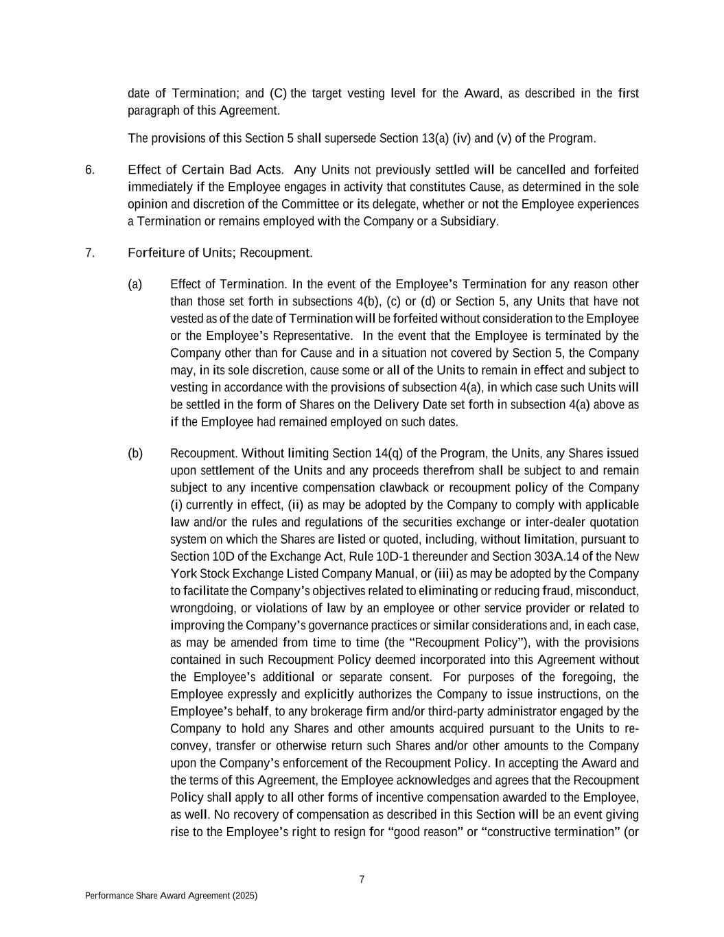 7 Performance Share Award Agreement (2025) date of Termination; and (C) the target vesting level for the Award, as described in the first paragraph of this Agreement. The provisions of this Section 5 shall supersede Section 13(a) (iv) and (v) of the Program. 6. Effect of Certain Bad Acts. Any Units not previously settled will be cancelled and forfeited immediately if the Employee engages in activity that constitutes Cause, as determined in the sole opinion and discretion of the Committee or its delegate, whether or not the Employee experiences a Termination or remains employed with the Company or a Subsidiary. 7. Forfeiture of Units; Recoupment. (a) Effect of Termination. In the event of the Employee’s Termination for any reason other than those set forth in subsections 4(b), (c) or (d) or Section 5, any Units that have not vested as of the date of Termination will be forfeited without consideration to the Employee or the Employee’s Representative. In the event that the Employee is terminated by the Company other than for Cause and in a situation not covered by Section 5, the Company may, in its sole discretion, cause some or all of the Units to remain in effect and subject to vesting in accordance with the provisions of subsection 4(a), in which case such Units will be settled in the form of Shares on the Delivery Date set forth in subsection 4(a) above as if the Employee had remained employed on such dates. (b) Recoupment. Without limiting Section 14(q) of the Program, the Units, any Shares issued upon settlement of the Units and any proceeds therefrom shall be subject to and remain subject to any incentive compensation clawback or recoupment policy of the Company (i) currently in effect, (ii) as may be adopted by the Company to comply with applicable law and/or the rules and regulations of the securities exchange or inter-dealer quotation system on which the Shares are listed or quoted, including, without limitation, pursuant to Section 10D of the Exchange Act, Rule 10D-1 thereunder and Section 303A.14 of the New York Stock Exchange Listed Company Manual, or (iii) as may be adopted by the Company to facilitate the Company’s objectives related to eliminating or reducing fraud, misconduct, wrongdoing, or violations of law by an employee or other service provider or related to improving the Company’s governance practices or similar considerations and, in each case, as may be amended from time to time (the “Recoupment Policy”), with the provisions contained in such Recoupment Policy deemed incorporated into this Agreement without the Employee’s additional or separate consent. For purposes of the foregoing, the Employee expressly and explicitly authorizes the Company to issue instructions, on the Employee’s behalf, to any brokerage firm and/or third-party administrator engaged by the Company to hold any Shares and other amounts acquired pursuant to the Units to re- convey, transfer or otherwise return such Shares and/or other amounts to the Company upon the Company’s enforcement of the Recoupment Policy. In accepting the Award and the terms of this Agreement, the Employee acknowledges and agrees that the Recoupment Policy shall apply to all other forms of incentive compensation awarded to the Employee, as well. No recovery of compensation as described in this Section will be an event giving rise to the Employee’s right to resign for “good reason” or “constructive termination” (or