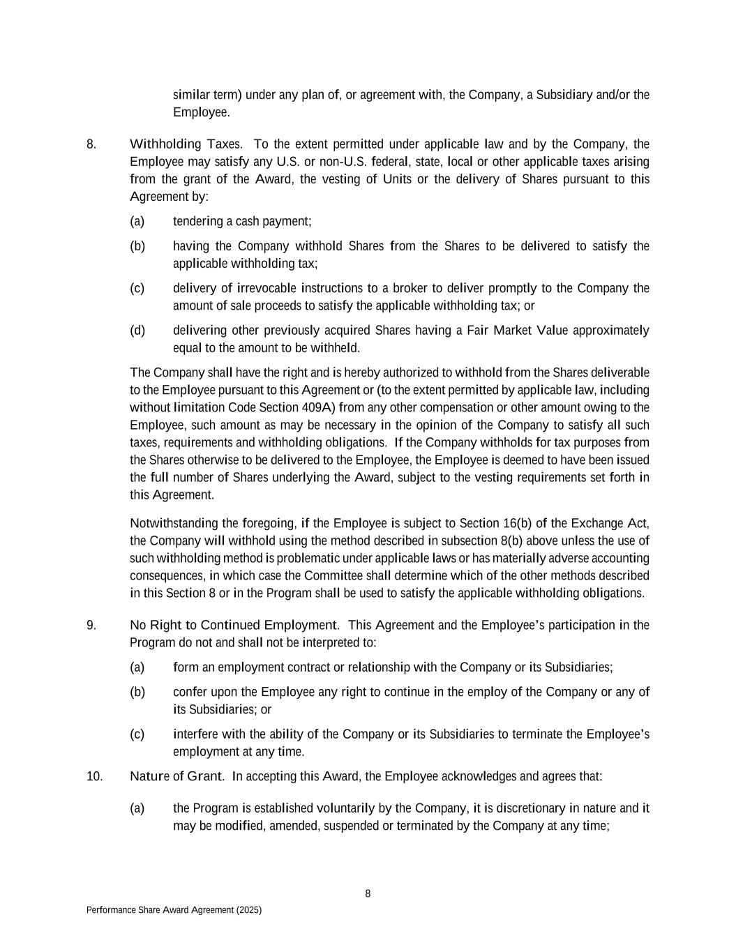 8 Performance Share Award Agreement (2025) similar term) under any plan of, or agreement with, the Company, a Subsidiary and/or the Employee. 8. Withholding Taxes. To the extent permitted under applicable law and by the Company, the Employee may satisfy any U.S. or non-U.S. federal, state, local or other applicable taxes arising from the grant of the Award, the vesting of Units or the delivery of Shares pursuant to this Agreement by: (a) tendering a cash payment; (b) having the Company withhold Shares from the Shares to be delivered to satisfy the applicable withholding tax; (c) delivery of irrevocable instructions to a broker to deliver promptly to the Company the amount of sale proceeds to satisfy the applicable withholding tax; or (d) delivering other previously acquired Shares having a Fair Market Value approximately equal to the amount to be withheld. The Company shall have the right and is hereby authorized to withhold from the Shares deliverable to the Employee pursuant to this Agreement or (to the extent permitted by applicable law, including without limitation Code Section 409A) from any other compensation or other amount owing to the Employee, such amount as may be necessary in the opinion of the Company to satisfy all such taxes, requirements and withholding obligations. If the Company withholds for tax purposes from the Shares otherwise to be delivered to the Employee, the Employee is deemed to have been issued the full number of Shares underlying the Award, subject to the vesting requirements set forth in this Agreement. Notwithstanding the foregoing, if the Employee is subject to Section 16(b) of the Exchange Act, the Company will withhold using the method described in subsection 8(b) above unless the use of such withholding method is problematic under applicable laws or has materially adverse accounting consequences, in which case the Committee shall determine which of the other methods described in this Section 8 or in the Program shall be used to satisfy the applicable withholding obligations. 9. No Right to Continued Employment. This Agreement and the Employee’s participation in the Program do not and shall not be interpreted to: (a) form an employment contract or relationship with the Company or its Subsidiaries; (b) confer upon the Employee any right to continue in the employ of the Company or any of its Subsidiaries; or (c) interfere with the ability of the Company or its Subsidiaries to terminate the Employee’s employment at any time. 10. Nature of Grant. In accepting this Award, the Employee acknowledges and agrees that: (a) the Program is established voluntarily by the Company, it is discretionary in nature and it may be modified, amended, suspended or terminated by the Company at any time;