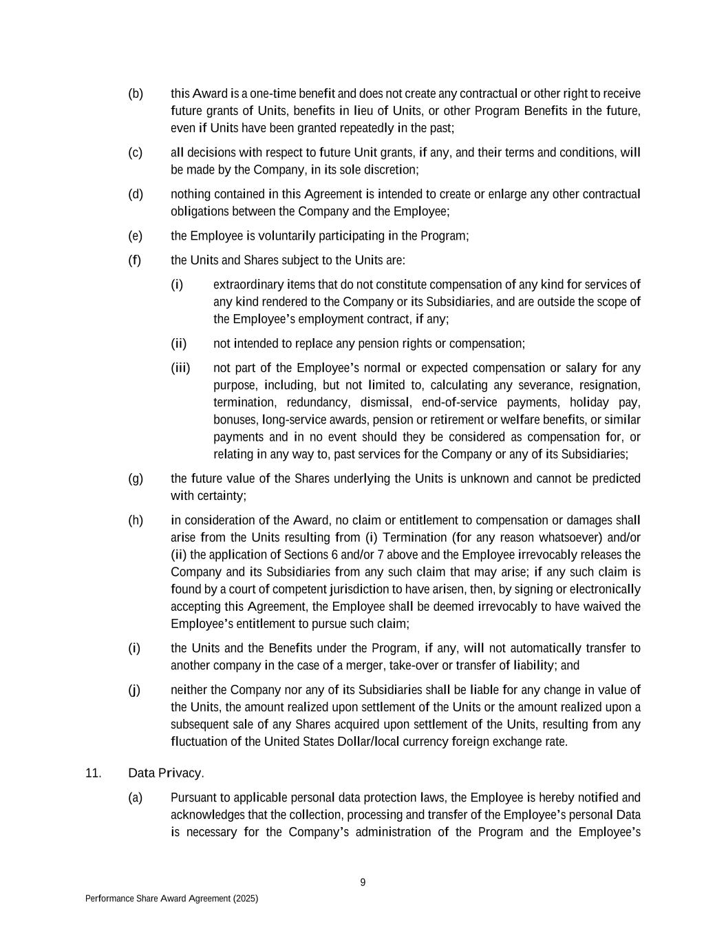 9 Performance Share Award Agreement (2025) (b) this Award is a one-time benefit and does not create any contractual or other right to receive future grants of Units, benefits in lieu of Units, or other Program Benefits in the future, even if Units have been granted repeatedly in the past; (c) all decisions with respect to future Unit grants, if any, and their terms and conditions, will be made by the Company, in its sole discretion; (d) nothing contained in this Agreement is intended to create or enlarge any other contractual obligations between the Company and the Employee; (e) the Employee is voluntarily participating in the Program; (f) the Units and Shares subject to the Units are: (i) extraordinary items that do not constitute compensation of any kind for services of any kind rendered to the Company or its Subsidiaries, and are outside the scope of the Employee’s employment contract, if any; (ii) not intended to replace any pension rights or compensation; (iii) not part of the Employee’s normal or expected compensation or salary for any purpose, including, but not limited to, calculating any severance, resignation, termination, redundancy, dismissal, end-of-service payments, holiday pay, bonuses, long-service awards, pension or retirement or welfare benefits, or similar payments and in no event should they be considered as compensation for, or relating in any way to, past services for the Company or any of its Subsidiaries; (g) the future value of the Shares underlying the Units is unknown and cannot be predicted with certainty; (h) in consideration of the Award, no claim or entitlement to compensation or damages shall arise from the Units resulting from (i) Termination (for any reason whatsoever) and/or (ii) the application of Sections 6 and/or 7 above and the Employee irrevocably releases the Company and its Subsidiaries from any such claim that may arise; if any such claim is found by a court of competent jurisdiction to have arisen, then, by signing or electronically accepting this Agreement, the Employee shall be deemed irrevocably to have waived the Employee’s entitlement to pursue such claim; (i) the Units and the Benefits under the Program, if any, will not automatically transfer to another company in the case of a merger, take-over or transfer of liability; and (j) neither the Company nor any of its Subsidiaries shall be liable for any change in value of the Units, the amount realized upon settlement of the Units or the amount realized upon a subsequent sale of any Shares acquired upon settlement of the Units, resulting from any fluctuation of the United States Dollar/local currency foreign exchange rate. 11. Data Privacy. (a) Pursuant to applicable personal data protection laws, the Employee is hereby notified and acknowledges that the collection, processing and transfer of the Employee’s personal Data is necessary for the Company’s administration of the Program and the Employee’s