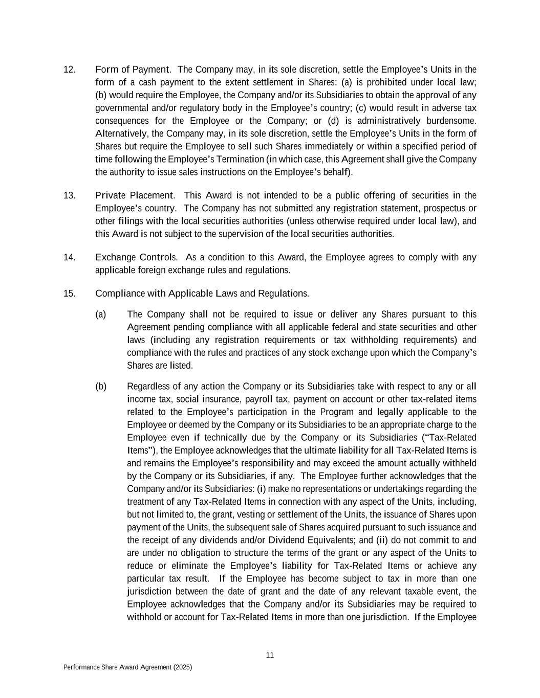 11 Performance Share Award Agreement (2025) 12. Form of Payment. The Company may, in its sole discretion, settle the Employee’s Units in the form of a cash payment to the extent settlement in Shares: (a) is prohibited under local law; (b) would require the Employee, the Company and/or its Subsidiaries to obtain the approval of any governmental and/or regulatory body in the Employee’s country; (c) would result in adverse tax consequences for the Employee or the Company; or (d) is administratively burdensome. Alternatively, the Company may, in its sole discretion, settle the Employee’s Units in the form of Shares but require the Employee to sell such Shares immediately or within a specified period of time following the Employee’s Termination (in which case, this Agreement shall give the Company the authority to issue sales instructions on the Employee’s behalf). 13. Private Placement. This Award is not intended to be a public offering of securities in the Employee’s country. The Company has not submitted any registration statement, prospectus or other filings with the local securities authorities (unless otherwise required under local law), and this Award is not subject to the supervision of the local securities authorities. 14. Exchange Controls. As a condition to this Award, the Employee agrees to comply with any applicable foreign exchange rules and regulations. 15. Compliance with Applicable Laws and Regulations. (a) The Company shall not be required to issue or deliver any Shares pursuant to this Agreement pending compliance with all applicable federal and state securities and other laws (including any registration requirements or tax withholding requirements) and compliance with the rules and practices of any stock exchange upon which the Company’s Shares are listed. (b) Regardless of any action the Company or its Subsidiaries take with respect to any or all income tax, social insurance, payroll tax, payment on account or other tax-related items related to the Employee’s participation in the Program and legally applicable to the Employee or deemed by the Company or its Subsidiaries to be an appropriate charge to the Employee even if technically due by the Company or its Subsidiaries (“Tax-Related Items”), the Employee acknowledges that the ultimate liability for all Tax-Related Items is and remains the Employee’s responsibility and may exceed the amount actually withheld by the Company or its Subsidiaries, if any. The Employee further acknowledges that the Company and/or its Subsidiaries: (i) make no representations or undertakings regarding the treatment of any Tax-Related Items in connection with any aspect of the Units, including, but not limited to, the grant, vesting or settlement of the Units, the issuance of Shares upon payment of the Units, the subsequent sale of Shares acquired pursuant to such issuance and the receipt of any dividends and/or Dividend Equivalents; and (ii) do not commit to and are under no obligation to structure the terms of the grant or any aspect of the Units to reduce or eliminate the Employee’s liability for Tax-Related Items or achieve any particular tax result. If the Employee has become subject to tax in more than one jurisdiction between the date of grant and the date of any relevant taxable event, the Employee acknowledges that the Company and/or its Subsidiaries may be required to withhold or account for Tax-Related Items in more than one jurisdiction. If the Employee