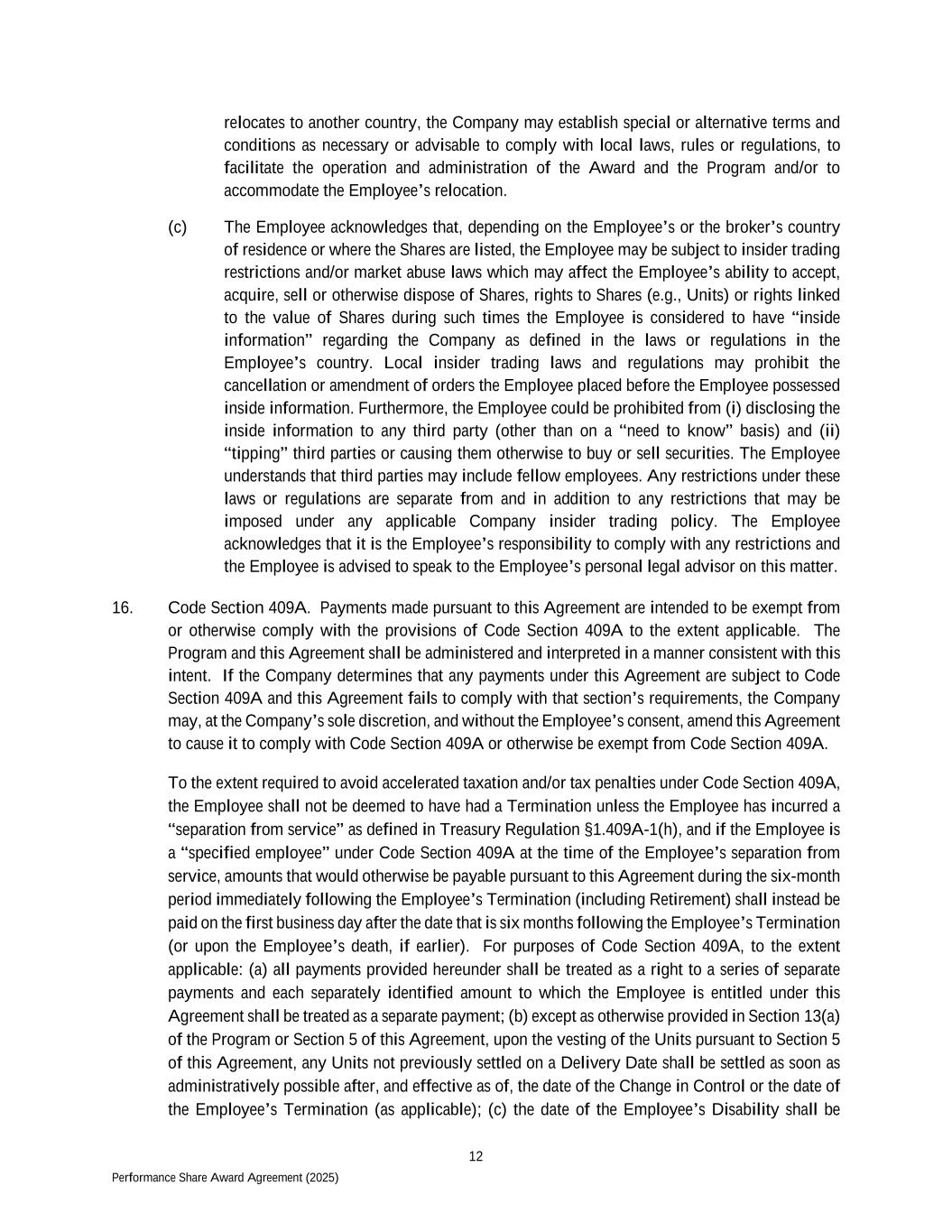 12 Performance Share Award Agreement (2025) relocates to another country, the Company may establish special or alternative terms and conditions as necessary or advisable to comply with local laws, rules or regulations, to facilitate the operation and administration of the Award and the Program and/or to accommodate the Employee’s relocation. (c) The Employee acknowledges that, depending on the Employee’s or the broker’s country of residence or where the Shares are listed, the Employee may be subject to insider trading restrictions and/or market abuse laws which may affect the Employee’s ability to accept, acquire, sell or otherwise dispose of Shares, rights to Shares (e.g., Units) or rights linked to the value of Shares during such times the Employee is considered to have “inside information” regarding the Company as defined in the laws or regulations in the Employee’s country. Local insider trading laws and regulations may prohibit the cancellation or amendment of orders the Employee placed before the Employee possessed inside information. Furthermore, the Employee could be prohibited from (i) disclosing the inside information to any third party (other than on a “need to know” basis) and (ii) “tipping” third parties or causing them otherwise to buy or sell securities. The Employee understands that third parties may include fellow employees. Any restrictions under these laws or regulations are separate from and in addition to any restrictions that may be imposed under any applicable Company insider trading policy. The Employee acknowledges that it is the Employee’s responsibility to comply with any restrictions and the Employee is advised to speak to the Employee’s personal legal advisor on this matter. 16. Code Section 409A. Payments made pursuant to this Agreement are intended to be exempt from or otherwise comply with the provisions of Code Section 409A to the extent applicable. The Program and this Agreement shall be administered and interpreted in a manner consistent with this intent. If the Company determines that any payments under this Agreement are subject to Code Section 409A and this Agreement fails to comply with that section’s requirements, the Company may, at the Company’s sole discretion, and without the Employee’s consent, amend this Agreement to cause it to comply with Code Section 409A or otherwise be exempt from Code Section 409A. To the extent required to avoid accelerated taxation and/or tax penalties under Code Section 409A, the Employee shall not be deemed to have had a Termination unless the Employee has incurred a “separation from service” as defined in Treasury Regulation §1.409A-1(h), and if the Employee is a “specified employee” under Code Section 409A at the time of the Employee’s separation from service, amounts that would otherwise be payable pursuant to this Agreement during the six-month period immediately following the Employee’s Termination (including Retirement) shall instead be paid on the first business day after the date that is six months following the Employee’s Termination (or upon the Employee’s death, if earlier). For purposes of Code Section 409A, to the extent applicable: (a) all payments provided hereunder shall be treated as a right to a series of separate payments and each separately identified amount to which the Employee is entitled under this Agreement shall be treated as a separate payment; (b) except as otherwise provided in Section 13(a) of the Program or Section 5 of this Agreement, upon the vesting of the Units pursuant to Section 5 of this Agreement, any Units not previously settled on a Delivery Date shall be settled as soon as administratively possible after, and effective as of, the date of the Change in Control or the date of the Employee’s Termination (as applicable); (c) the date of the Employee’s Disability shall be