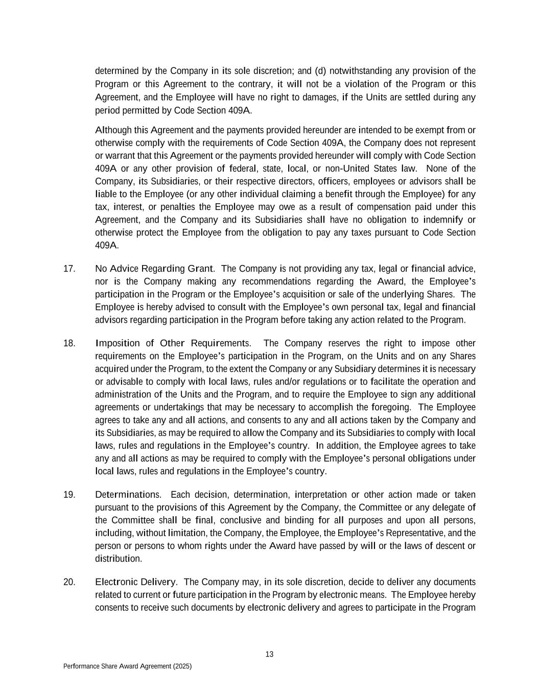 13 Performance Share Award Agreement (2025) determined by the Company in its sole discretion; and (d) notwithstanding any provision of the Program or this Agreement to the contrary, it will not be a violation of the Program or this Agreement, and the Employee will have no right to damages, if the Units are settled during any period permitted by Code Section 409A. Although this Agreement and the payments provided hereunder are intended to be exempt from or otherwise comply with the requirements of Code Section 409A, the Company does not represent or warrant that this Agreement or the payments provided hereunder will comply with Code Section 409A or any other provision of federal, state, local, or non-United States law. None of the Company, its Subsidiaries, or their respective directors, officers, employees or advisors shall be liable to the Employee (or any other individual claiming a benefit through the Employee) for any tax, interest, or penalties the Employee may owe as a result of compensation paid under this Agreement, and the Company and its Subsidiaries shall have no obligation to indemnify or otherwise protect the Employee from the obligation to pay any taxes pursuant to Code Section 409A. 17. No Advice Regarding Grant. The Company is not providing any tax, legal or financial advice, nor is the Company making any recommendations regarding the Award, the Employee’s participation in the Program or the Employee’s acquisition or sale of the underlying Shares. The Employee is hereby advised to consult with the Employee’s own personal tax, legal and financial advisors regarding participation in the Program before taking any action related to the Program. 18. Imposition of Other Requirements. The Company reserves the right to impose other requirements on the Employee’s participation in the Program, on the Units and on any Shares acquired under the Program, to the extent the Company or any Subsidiary determines it is necessary or advisable to comply with local laws, rules and/or regulations or to facilitate the operation and administration of the Units and the Program, and to require the Employee to sign any additional agreements or undertakings that may be necessary to accomplish the foregoing. The Employee agrees to take any and all actions, and consents to any and all actions taken by the Company and its Subsidiaries, as may be required to allow the Company and its Subsidiaries to comply with local laws, rules and regulations in the Employee’s country. In addition, the Employee agrees to take any and all actions as may be required to comply with the Employee’s personal obligations under local laws, rules and regulations in the Employee’s country. 19. Determinations. Each decision, determination, interpretation or other action made or taken pursuant to the provisions of this Agreement by the Company, the Committee or any delegate of the Committee shall be final, conclusive and binding for all purposes and upon all persons, including, without limitation, the Company, the Employee, the Employee’s Representative, and the person or persons to whom rights under the Award have passed by will or the laws of descent or distribution. 20. Electronic Delivery. The Company may, in its sole discretion, decide to deliver any documents related to current or future participation in the Program by electronic means. The Employee hereby consents to receive such documents by electronic delivery and agrees to participate in the Program