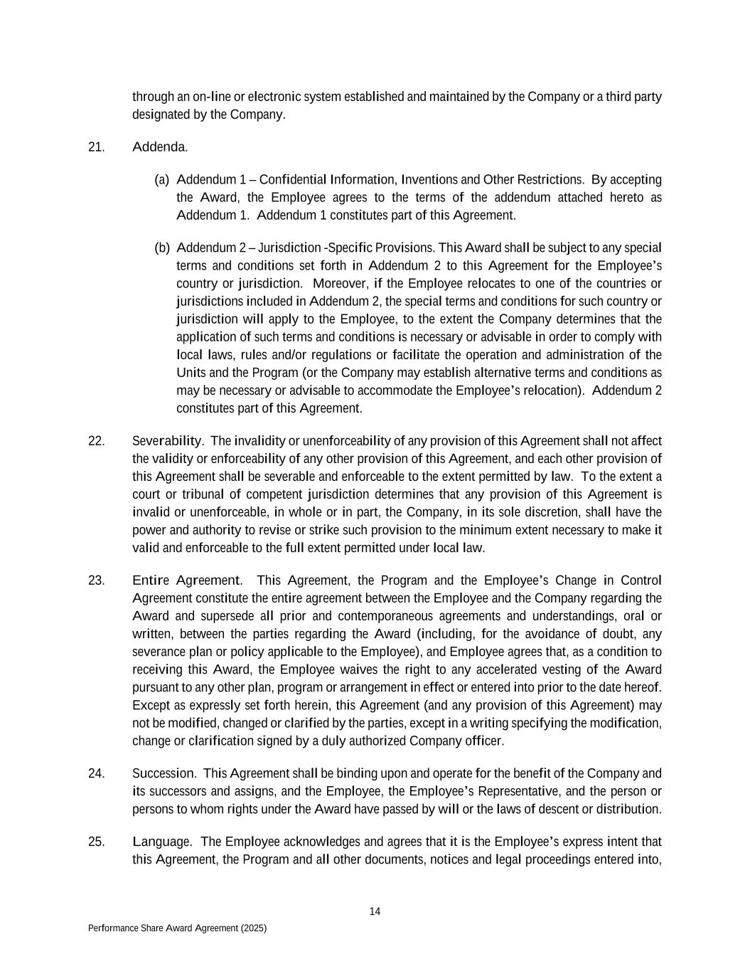 14 Performance Share Award Agreement (2025) through an on-line or electronic system established and maintained by the Company or a third party designated by the Company. 21. Addenda. (a) Addendum 1 – Confidential Information, Inventions and Other Restrictions. By accepting the Award, the Employee agrees to the terms of the addendum attached hereto as Addendum 1. Addendum 1 constitutes part of this Agreement. (b) Addendum 2 – Jurisdiction -Specific Provisions. This Award shall be subject to any special terms and conditions set forth in Addendum 2 to this Agreement for the Employee’s country or jurisdiction. Moreover, if the Employee relocates to one of the countries or jurisdictions included in Addendum 2, the special terms and conditions for such country or jurisdiction will apply to the Employee, to the extent the Company determines that the application of such terms and conditions is necessary or advisable in order to comply with local laws, rules and/or regulations or facilitate the operation and administration of the Units and the Program (or the Company may establish alternative terms and conditions as may be necessary or advisable to accommodate the Employee’s relocation). Addendum 2 constitutes part of this Agreement. 22. Severability. The invalidity or unenforceability of any provision of this Agreement shall not affect the validity or enforceability of any other provision of this Agreement, and each other provision of this Agreement shall be severable and enforceable to the extent permitted by law. To the extent a court or tribunal of competent jurisdiction determines that any provision of this Agreement is invalid or unenforceable, in whole or in part, the Company, in its sole discretion, shall have the power and authority to revise or strike such provision to the minimum extent necessary to make it valid and enforceable to the full extent permitted under local law. 23. Entire Agreement. This Agreement, the Program and the Employee’s Change in Control Agreement constitute the entire agreement between the Employee and the Company regarding the Award and supersede all prior and contemporaneous agreements and understandings, oral or written, between the parties regarding the Award (including, for the avoidance of doubt, any severance plan or policy applicable to the Employee), and Employee agrees that, as a condition to receiving this Award, the Employee waives the right to any accelerated vesting of the Award pursuant to any other plan, program or arrangement in effect or entered into prior to the date hereof. Except as expressly set forth herein, this Agreement (and any provision of this Agreement) may not be modified, changed or clarified by the parties, except in a writing specifying the modification, change or clarification signed by a duly authorized Company officer. 24. Succession. This Agreement shall be binding upon and operate for the benefit of the Company and its successors and assigns, and the Employee, the Employee’s Representative, and the person or persons to whom rights under the Award have passed by will or the laws of descent or distribution. 25. Language. The Employee acknowledges and agrees that it is the Employee’s express intent that this Agreement, the Program and all other documents, notices and legal proceedings entered into,