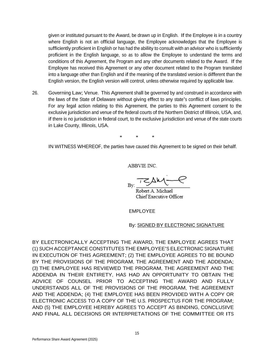 15 Performance Share Award Agreement (2025) given or instituted pursuant to the Award, be drawn up in English. If the Employee is in a country where English is not an official language, the Employee acknowledges that the Employee is sufficiently proficient in English or has had the ability to consult with an advisor who is sufficiently proficient in the English language, so as to allow the Employee to understand the terms and conditions of this Agreement, the Program and any other documents related to the Award. If the Employee has received this Agreement or any other document related to the Program translated into a language other than English and if the meaning of the translated version is different than the English version, the English version will control, unless otherwise required by applicable law. 26. Governing Law; Venue. This Agreement shall be governed by and construed in accordance with the laws of the State of Delaware without giving effect to any state’s conflict of laws principles. For any legal action relating to this Agreement, the parties to this Agreement consent to the exclusive jurisdiction and venue of the federal courts of the Northern District of Illinois, USA, and, if there is no jurisdiction in federal court, to the exclusive jurisdiction and venue of the state courts in Lake County, Illinois, USA. * * * IN WITNESS WHEREOF, the parties have caused this Agreement to be signed on their behalf. EMPLOYEE By: SIGNED BY ELECTRONIC SIGNATURE BY ELECTRONICALLY ACCEPTING THE AWARD, THE EMPLOYEE AGREES THAT (1) SUCH ACCEPTANCE CONSTITUTES THE EMPLOYEE’S ELECTRONIC SIGNATURE IN EXECUTION OF THIS AGREEMENT; (2) THE EMPLOYEE AGREES TO BE BOUND BY THE PROVISIONS OF THE PROGRAM, THE AGREEMENT AND THE ADDENDA; (3) THE EMPLOYEE HAS REVIEWED THE PROGRAM, THE AGREEMENT AND THE ADDENDA IN THEIR ENTIRETY, HAS HAD AN OPPORTUNITY TO OBTAIN THE ADVICE OF COUNSEL PRIOR TO ACCEPTING THE AWARD AND FULLY UNDERSTANDS ALL OF THE PROVISIONS OF THE PROGRAM, THE AGREEMENT AND THE ADDENDA; (4) THE EMPLOYEE HAS BEEN PROVIDED WITH A COPY OR ELECTRONIC ACCESS TO A COPY OF THE U.S. PROSPECTUS FOR THE PROGRAM; AND (5) THE EMPLOYEE HEREBY AGREES TO ACCEPT AS BINDING, CONCLUSIVE AND FINAL ALL DECISIONS OR INTERPRETATIONS OF THE COMMITTEE OR ITS