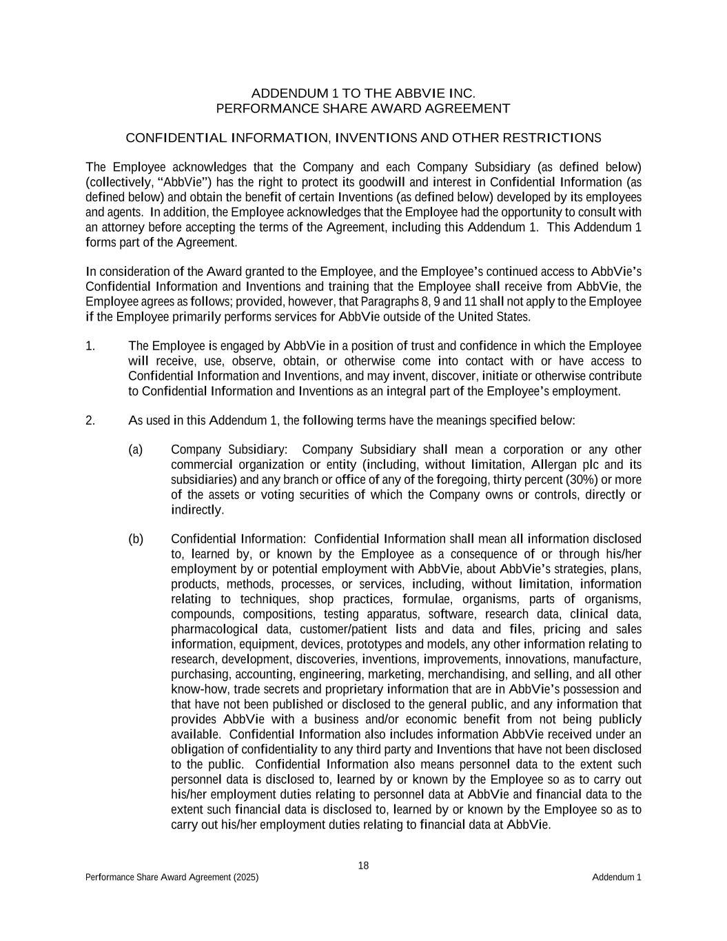 18 Performance Share Award Agreement (2025) Addendum 1 ADDENDUM 1 TO THE ABBVIE INC. PERFORMANCE SHARE AWARD AGREEMENT CONFIDENTIAL INFORMATION, INVENTIONS AND OTHER RESTRICTIONS The Employee acknowledges that the Company and each Company Subsidiary (as defined below) (collectively, “AbbVie”) has the right to protect its goodwill and interest in Confidential Information (as defined below) and obtain the benefit of certain Inventions (as defined below) developed by its employees and agents. In addition, the Employee acknowledges that the Employee had the opportunity to consult with an attorney before accepting the terms of the Agreement, including this Addendum 1. This Addendum 1 forms part of the Agreement. In consideration of the Award granted to the Employee, and the Employee’s continued access to AbbVie’s Confidential Information and Inventions and training that the Employee shall receive from AbbVie, the Employee agrees as follows; provided, however, that Paragraphs 8, 9 and 11 shall not apply to the Employee if the Employee primarily performs services for AbbVie outside of the United States. 1. The Employee is engaged by AbbVie in a position of trust and confidence in which the Employee will receive, use, observe, obtain, or otherwise come into contact with or have access to Confidential Information and Inventions, and may invent, discover, initiate or otherwise contribute to Confidential Information and Inventions as an integral part of the Employee’s employment. 2. As used in this Addendum 1, the following terms have the meanings specified below: (a) Company Subsidiary: Company Subsidiary shall mean a corporation or any other commercial organization or entity (including, without limitation, Allergan plc and its subsidiaries) and any branch or office of any of the foregoing, thirty percent (30%) or more of the assets or voting securities of which the Company owns or controls, directly or indirectly. (b) Confidential Information: Confidential Information shall mean all information disclosed to, learned by, or known by the Employee as a consequence of or through his/her employment by or potential employment with AbbVie, about AbbVie’s strategies, plans, products, methods, processes, or services, including, without limitation, information relating to techniques, shop practices, formulae, organisms, parts of organisms, compounds, compositions, testing apparatus, software, research data, clinical data, pharmacological data, customer/patient lists and data and files, pricing and sales information, equipment, devices, prototypes and models, any other information relating to research, development, discoveries, inventions, improvements, innovations, manufacture, purchasing, accounting, engineering, marketing, merchandising, and selling, and all other know-how, trade secrets and proprietary information that are in AbbVie’s possession and that have not been published or disclosed to the general public, and any information that provides AbbVie with a business and/or economic benefit from not being publicly available. Confidential Information also includes information AbbVie received under an obligation of confidentiality to any third party and Inventions that have not been disclosed to the public. Confidential Information also means personnel data to the extent such personnel data is disclosed to, learned by or known by the Employee so as to carry out his/her employment duties relating to personnel data at AbbVie and financial data to the extent such financial data is disclosed to, learned by or known by the Employee so as to carry out his/her employment duties relating to financial data at AbbVie.