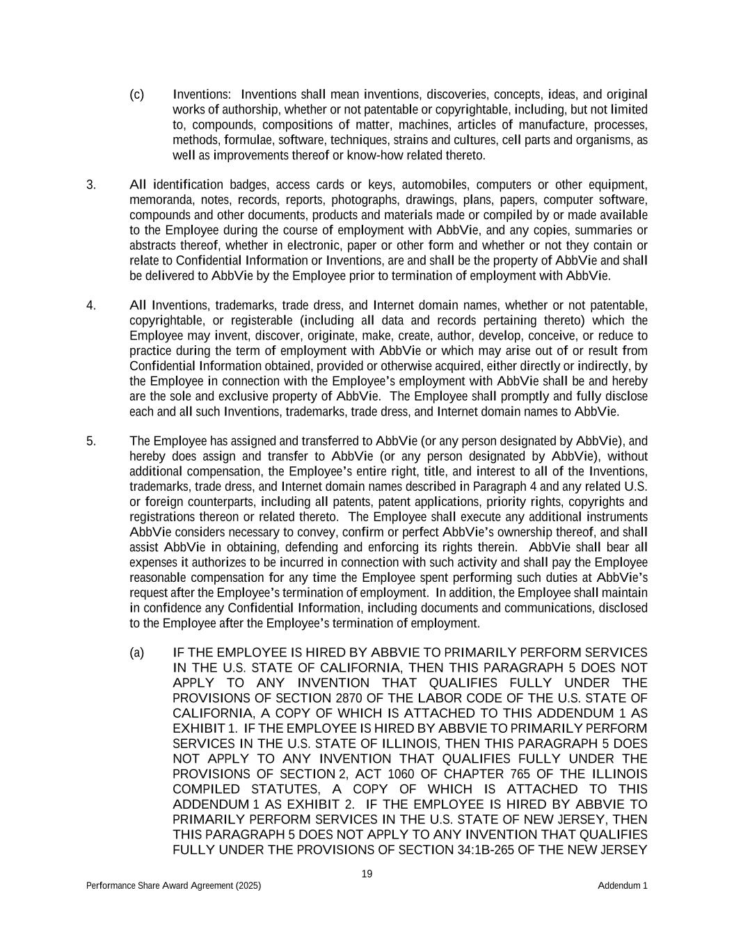 19 Performance Share Award Agreement (2025) Addendum 1 (c) Inventions: Inventions shall mean inventions, discoveries, concepts, ideas, and original works of authorship, whether or not patentable or copyrightable, including, but not limited to, compounds, compositions of matter, machines, articles of manufacture, processes, methods, formulae, software, techniques, strains and cultures, cell parts and organisms, as well as improvements thereof or know-how related thereto. 3. All identification badges, access cards or keys, automobiles, computers or other equipment, memoranda, notes, records, reports, photographs, drawings, plans, papers, computer software, compounds and other documents, products and materials made or compiled by or made available to the Employee during the course of employment with AbbVie, and any copies, summaries or abstracts thereof, whether in electronic, paper or other form and whether or not they contain or relate to Confidential Information or Inventions, are and shall be the property of AbbVie and shall be delivered to AbbVie by the Employee prior to termination of employment with AbbVie. 4. All Inventions, trademarks, trade dress, and Internet domain names, whether or not patentable, copyrightable, or registerable (including all data and records pertaining thereto) which the Employee may invent, discover, originate, make, create, author, develop, conceive, or reduce to practice during the term of employment with AbbVie or which may arise out of or result from Confidential Information obtained, provided or otherwise acquired, either directly or indirectly, by the Employee in connection with the Employee’s employment with AbbVie shall be and hereby are the sole and exclusive property of AbbVie. The Employee shall promptly and fully disclose each and all such Inventions, trademarks, trade dress, and Internet domain names to AbbVie. 5. The Employee has assigned and transferred to AbbVie (or any person designated by AbbVie), and hereby does assign and transfer to AbbVie (or any person designated by AbbVie), without additional compensation, the Employee’s entire right, title, and interest to all of the Inventions, trademarks, trade dress, and Internet domain names described in Paragraph 4 and any related U.S. or foreign counterparts, including all patents, patent applications, priority rights, copyrights and registrations thereon or related thereto. The Employee shall execute any additional instruments AbbVie considers necessary to convey, confirm or perfect AbbVie’s ownership thereof, and shall assist AbbVie in obtaining, defending and enforcing its rights therein. AbbVie shall bear all expenses it authorizes to be incurred in connection with such activity and shall pay the Employee reasonable compensation for any time the Employee spent performing such duties at AbbVie’s request after the Employee’s termination of employment. In addition, the Employee shall maintain in confidence any Confidential Information, including documents and communications, disclosed to the Employee after the Employee’s termination of employment. (a) IF THE EMPLOYEE IS HIRED BY ABBVIE TO PRIMARILY PERFORM SERVICES IN THE U.S. STATE OF CALIFORNIA, THEN THIS PARAGRAPH 5 DOES NOT APPLY TO ANY INVENTION THAT QUALIFIES FULLY UNDER THE PROVISIONS OF SECTION 2870 OF THE LABOR CODE OF THE U.S. STATE OF CALIFORNIA, A COPY OF WHICH IS ATTACHED TO THIS ADDENDUM 1 AS EXHIBIT 1. IF THE EMPLOYEE IS HIRED BY ABBVIE TO PRIMARILY PERFORM SERVICES IN THE U.S. STATE OF ILLINOIS, THEN THIS PARAGRAPH 5 DOES NOT APPLY TO ANY INVENTION THAT QUALIFIES FULLY UNDER THE PROVISIONS OF SECTION 2, ACT 1060 OF CHAPTER 765 OF THE ILLINOIS COMPILED STATUTES, A COPY OF WHICH IS ATTACHED TO THIS ADDENDUM 1 AS EXHIBIT 2. IF THE EMPLOYEE IS HIRED BY ABBVIE TO PRIMARILY PERFORM SERVICES IN THE U.S. STATE OF NEW JERSEY, THEN THIS PARAGRAPH 5 DOES NOT APPLY TO ANY INVENTION THAT QUALIFIES FULLY UNDER THE PROVISIONS OF SECTION 34:1B-265 OF THE NEW JERSEY
