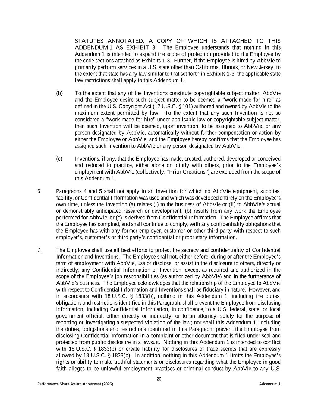 20 Performance Share Award Agreement (2025) Addendum 1 STATUTES ANNOTATED, A COPY OF WHICH IS ATTACHED TO THIS ADDENDUM 1 AS EXHIBIT 3. The Employee understands that nothing in this Addendum 1 is intended to expand the scope of protection provided to the Employee by the code sections attached as Exhibits 1-3. Further, if the Employee is hired by AbbVie to primarily perform services in a U.S. state other than California, Illinois, or New Jersey, to the extent that state has any law similar to that set forth in Exhibits 1-3, the applicable state law restrictions shall apply to this Addendum 1. (b) To the extent that any of the Inventions constitute copyrightable subject matter, AbbVie and the Employee desire such subject matter to be deemed a “work made for hire” as defined in the U.S. Copyright Act (17 U.S.C. § 101) authored and owned by AbbVie to the maximum extent permitted by law. To the extent that any such Invention is not so considered a “work made for hire” under applicable law or copyrightable subject matter, then such Invention will be deemed, upon invention, to be assigned to AbbVie, or any person designated by AbbVie, automatically without further compensation or action by either the Employee or AbbVie, and the Employee hereby confirms that the Employee has assigned such Invention to AbbVie or any person designated by AbbVie. (c) Inventions, if any, that the Employee has made, created, authored, developed or conceived and reduced to practice, either alone or jointly with others, prior to the Employee’s employment with AbbVie (collectively, “Prior Creations”) are excluded from the scope of this Addendum 1. 6. Paragraphs 4 and 5 shall not apply to an Invention for which no AbbVie equipment, supplies, facility, or Confidential Information was used and which was developed entirely on the Employee’s own time, unless the Invention (a) relates (i) to the business of AbbVie or (ii) to AbbVie’s actual or demonstrably anticipated research or development, (b) results from any work the Employee performed for AbbVie, or (c) is derived from Confidential Information. The Employee affirms that the Employee has complied, and shall continue to comply, with any confidentiality obligations that the Employee has with any former employer, customer or other third party with respect to such employer’s, customer’s or third party’s confidential or proprietary information. 7. The Employee shall use all best efforts to protect the secrecy and confidentiality of Confidential Information and Inventions. The Employee shall not, either before, during or after the Employee’s term of employment with AbbVie, use or disclose, or assist in the disclosure to others, directly or indirectly, any Confidential Information or Invention, except as required and authorized in the scope of the Employee’s job responsibilities (as authorized by AbbVie) and in the furtherance of AbbVie’s business. The Employee acknowledges that the relationship of the Employee to AbbVie with respect to Confidential Information and Inventions shall be fiduciary in nature. However, and in accordance with 18 U.S.C. § 1833(b), nothing in this Addendum 1, including the duties, obligations and restrictions identified in this Paragraph, shall prevent the Employee from disclosing information, including Confidential Information, in confidence, to a U.S. federal, state, or local government official, either directly or indirectly, or to an attorney, solely for the purpose of reporting or investigating a suspected violation of the law; nor shall this Addendum 1, including the duties, obligations and restrictions identified in this Paragraph, prevent the Employee from disclosing Confidential Information in a complaint or other document that is filed under seal and protected from public disclosure in a lawsuit. Nothing in this Addendum 1 is intended to conflict with 18 U.S.C. § 1833(b) or create liability for disclosures of trade secrets that are expressly allowed by 18 U.S.C. § 1833(b). In addition, nothing in this Addendum 1 limits the Employee’s rights or ability to make truthful statements or disclosures regarding what the Employee in good faith alleges to be unlawful employment practices or criminal conduct by AbbVie to any U.S.