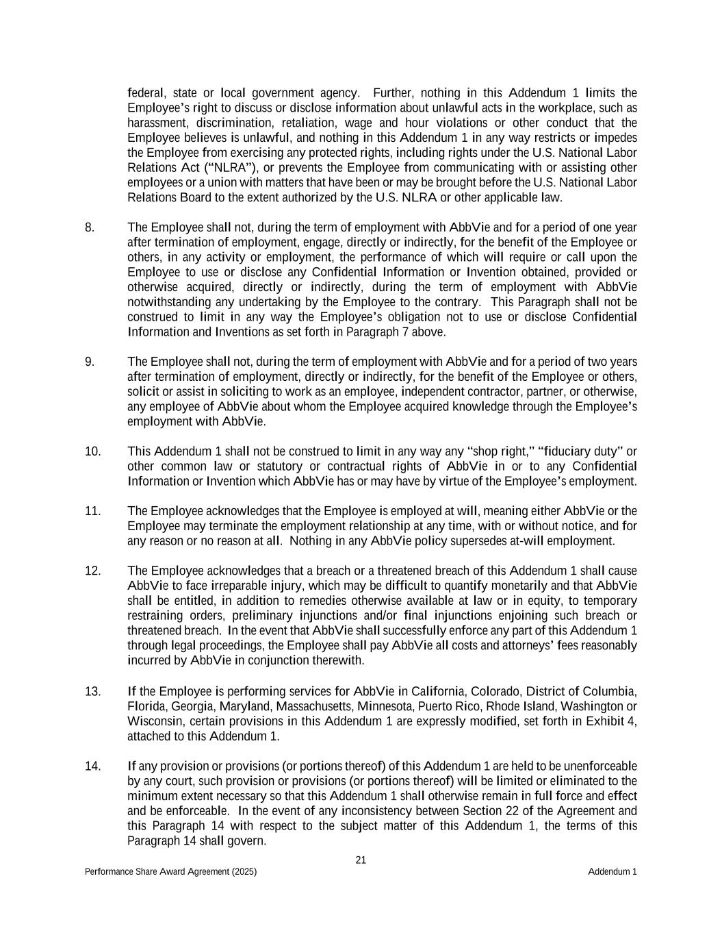 21 Performance Share Award Agreement (2025) Addendum 1 federal, state or local government agency. Further, nothing in this Addendum 1 limits the Employee’s right to discuss or disclose information about unlawful acts in the workplace, such as harassment, discrimination, retaliation, wage and hour violations or other conduct that the Employee believes is unlawful, and nothing in this Addendum 1 in any way restricts or impedes the Employee from exercising any protected rights, including rights under the U.S. National Labor Relations Act (“NLRA”), or prevents the Employee from communicating with or assisting other employees or a union with matters that have been or may be brought before the U.S. National Labor Relations Board to the extent authorized by the U.S. NLRA or other applicable law. 8. The Employee shall not, during the term of employment with AbbVie and for a period of one year after termination of employment, engage, directly or indirectly, for the benefit of the Employee or others, in any activity or employment, the performance of which will require or call upon the Employee to use or disclose any Confidential Information or Invention obtained, provided or otherwise acquired, directly or indirectly, during the term of employment with AbbVie notwithstanding any undertaking by the Employee to the contrary. This Paragraph shall not be construed to limit in any way the Employee’s obligation not to use or disclose Confidential Information and Inventions as set forth in Paragraph 7 above. 9. The Employee shall not, during the term of employment with AbbVie and for a period of two years after termination of employment, directly or indirectly, for the benefit of the Employee or others, solicit or assist in soliciting to work as an employee, independent contractor, partner, or otherwise, any employee of AbbVie about whom the Employee acquired knowledge through the Employee’s employment with AbbVie. 10. This Addendum 1 shall not be construed to limit in any way any “shop right,” “fiduciary duty” or other common law or statutory or contractual rights of AbbVie in or to any Confidential Information or Invention which AbbVie has or may have by virtue of the Employee’s employment. 11. The Employee acknowledges that the Employee is employed at will, meaning either AbbVie or the Employee may terminate the employment relationship at any time, with or without notice, and for any reason or no reason at all. Nothing in any AbbVie policy supersedes at-will employment. 12. The Employee acknowledges that a breach or a threatened breach of this Addendum 1 shall cause AbbVie to face irreparable injury, which may be difficult to quantify monetarily and that AbbVie shall be entitled, in addition to remedies otherwise available at law or in equity, to temporary restraining orders, preliminary injunctions and/or final injunctions enjoining such breach or threatened breach. In the event that AbbVie shall successfully enforce any part of this Addendum 1 through legal proceedings, the Employee shall pay AbbVie all costs and attorneys’ fees reasonably incurred by AbbVie in conjunction therewith. 13. If the Employee is performing services for AbbVie in California, Colorado, District of Columbia, Florida, Georgia, Maryland, Massachusetts, Minnesota, Puerto Rico, Rhode Island, Washington or Wisconsin, certain provisions in this Addendum 1 are expressly modified, set forth in Exhibit 4, attached to this Addendum 1. 14. If any provision or provisions (or portions thereof) of this Addendum 1 are held to be unenforceable by any court, such provision or provisions (or portions thereof) will be limited or eliminated to the minimum extent necessary so that this Addendum 1 shall otherwise remain in full force and effect and be enforceable. In the event of any inconsistency between Section 22 of the Agreement and this Paragraph 14 with respect to the subject matter of this Addendum 1, the terms of this Paragraph 14 shall govern.