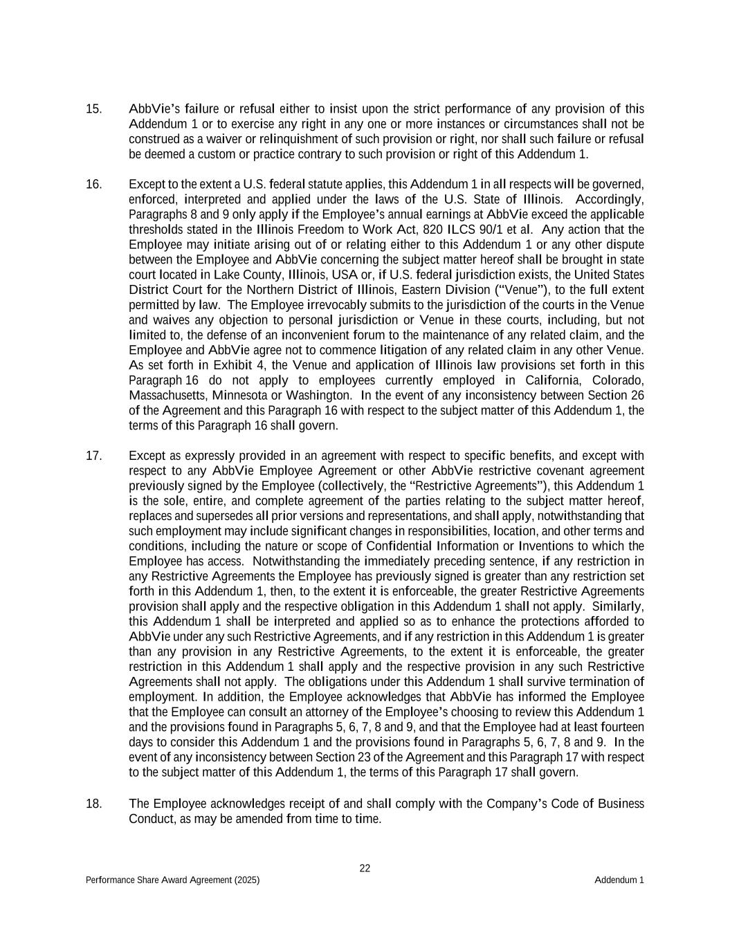 22 Performance Share Award Agreement (2025) Addendum 1 15. AbbVie’s failure or refusal either to insist upon the strict performance of any provision of this Addendum 1 or to exercise any right in any one or more instances or circumstances shall not be construed as a waiver or relinquishment of such provision or right, nor shall such failure or refusal be deemed a custom or practice contrary to such provision or right of this Addendum 1. 16. Except to the extent a U.S. federal statute applies, this Addendum 1 in all respects will be governed, enforced, interpreted and applied under the laws of the U.S. State of Illinois. Accordingly, Paragraphs 8 and 9 only apply if the Employee’s annual earnings at AbbVie exceed the applicable thresholds stated in the Illinois Freedom to Work Act, 820 ILCS 90/1 et al. Any action that the Employee may initiate arising out of or relating either to this Addendum 1 or any other dispute between the Employee and AbbVie concerning the subject matter hereof shall be brought in state court located in Lake County, Illinois, USA or, if U.S. federal jurisdiction exists, the United States District Court for the Northern District of Illinois, Eastern Division (“Venue”), to the full extent permitted by law. The Employee irrevocably submits to the jurisdiction of the courts in the Venue and waives any objection to personal jurisdiction or Venue in these courts, including, but not limited to, the defense of an inconvenient forum to the maintenance of any related claim, and the Employee and AbbVie agree not to commence litigation of any related claim in any other Venue. As set forth in Exhibit 4, the Venue and application of Illinois law provisions set forth in this Paragraph 16 do not apply to employees currently employed in California, Colorado, Massachusetts, Minnesota or Washington. In the event of any inconsistency between Section 26 of the Agreement and this Paragraph 16 with respect to the subject matter of this Addendum 1, the terms of this Paragraph 16 shall govern. 17. Except as expressly provided in an agreement with respect to specific benefits, and except with respect to any AbbVie Employee Agreement or other AbbVie restrictive covenant agreement previously signed by the Employee (collectively, the “Restrictive Agreements”), this Addendum 1 is the sole, entire, and complete agreement of the parties relating to the subject matter hereof, replaces and supersedes all prior versions and representations, and shall apply, notwithstanding that such employment may include significant changes in responsibilities, location, and other terms and conditions, including the nature or scope of Confidential Information or Inventions to which the Employee has access. Notwithstanding the immediately preceding sentence, if any restriction in any Restrictive Agreements the Employee has previously signed is greater than any restriction set forth in this Addendum 1, then, to the extent it is enforceable, the greater Restrictive Agreements provision shall apply and the respective obligation in this Addendum 1 shall not apply. Similarly, this Addendum 1 shall be interpreted and applied so as to enhance the protections afforded to AbbVie under any such Restrictive Agreements, and if any restriction in this Addendum 1 is greater than any provision in any Restrictive Agreements, to the extent it is enforceable, the greater restriction in this Addendum 1 shall apply and the respective provision in any such Restrictive Agreements shall not apply. The obligations under this Addendum 1 shall survive termination of employment. In addition, the Employee acknowledges that AbbVie has informed the Employee that the Employee can consult an attorney of the Employee’s choosing to review this Addendum 1 and the provisions found in Paragraphs 5, 6, 7, 8 and 9, and that the Employee had at least fourteen days to consider this Addendum 1 and the provisions found in Paragraphs 5, 6, 7, 8 and 9. In the event of any inconsistency between Section 23 of the Agreement and this Paragraph 17 with respect to the subject matter of this Addendum 1, the terms of this Paragraph 17 shall govern. 18. The Employee acknowledges receipt of and shall comply with the Company’s Code of Business Conduct, as may be amended from time to time.
