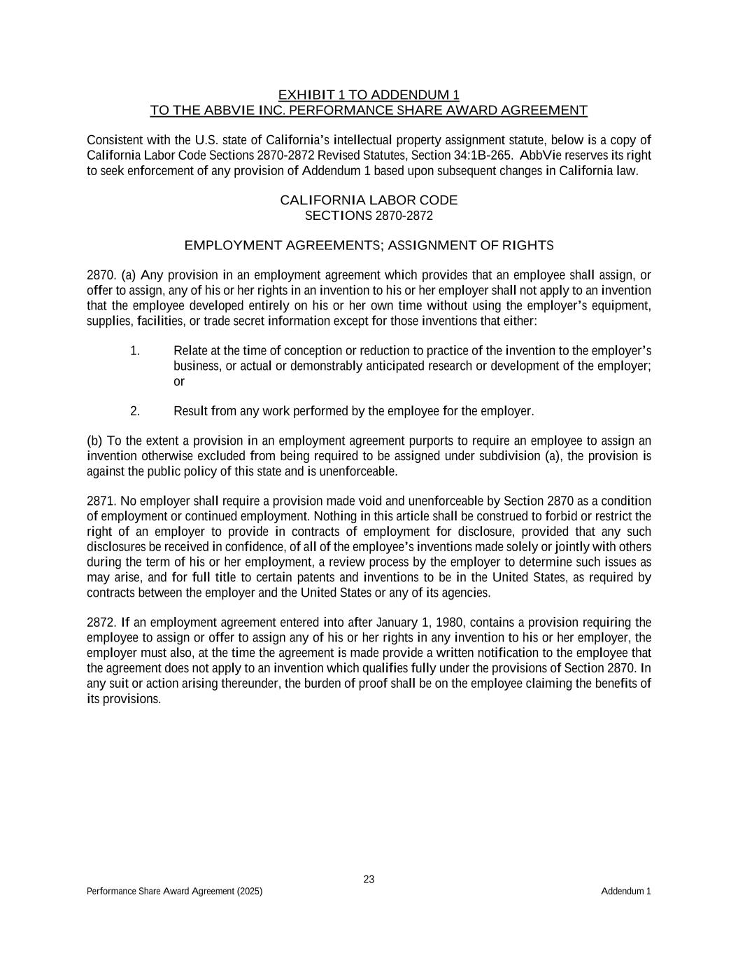 23 Performance Share Award Agreement (2025) Addendum 1 EXHIBIT 1 TO ADDENDUM 1 TO THE ABBVIE INC. PERFORMANCE SHARE AWARD AGREEMENT Consistent with the U.S. state of California’s intellectual property assignment statute, below is a copy of California Labor Code Sections 2870-2872 Revised Statutes, Section 34:1B-265. AbbVie reserves its right to seek enforcement of any provision of Addendum 1 based upon subsequent changes in California law. CALIFORNIA LABOR CODE SECTIONS 2870-2872 EMPLOYMENT AGREEMENTS; ASSIGNMENT OF RIGHTS 2870. (a) Any provision in an employment agreement which provides that an employee shall assign, or offer to assign, any of his or her rights in an invention to his or her employer shall not apply to an invention that the employee developed entirely on his or her own time without using the employer’s equipment, supplies, facilities, or trade secret information except for those inventions that either: 1. Relate at the time of conception or reduction to practice of the invention to the employer’s business, or actual or demonstrably anticipated research or development of the employer; or 2. Result from any work performed by the employee for the employer. (b) To the extent a provision in an employment agreement purports to require an employee to assign an invention otherwise excluded from being required to be assigned under subdivision (a), the provision is against the public policy of this state and is unenforceable. 2871. No employer shall require a provision made void and unenforceable by Section 2870 as a condition of employment or continued employment. Nothing in this article shall be construed to forbid or restrict the right of an employer to provide in contracts of employment for disclosure, provided that any such disclosures be received in confidence, of all of the employee’s inventions made solely or jointly with others during the term of his or her employment, a review process by the employer to determine such issues as may arise, and for full title to certain patents and inventions to be in the United States, as required by contracts between the employer and the United States or any of its agencies. 2872. If an employment agreement entered into after January 1, 1980, contains a provision requiring the employee to assign or offer to assign any of his or her rights in any invention to his or her employer, the employer must also, at the time the agreement is made provide a written notification to the employee that the agreement does not apply to an invention which qualifies fully under the provisions of Section 2870. In any suit or action arising thereunder, the burden of proof shall be on the employee claiming the benefits of its provisions.
