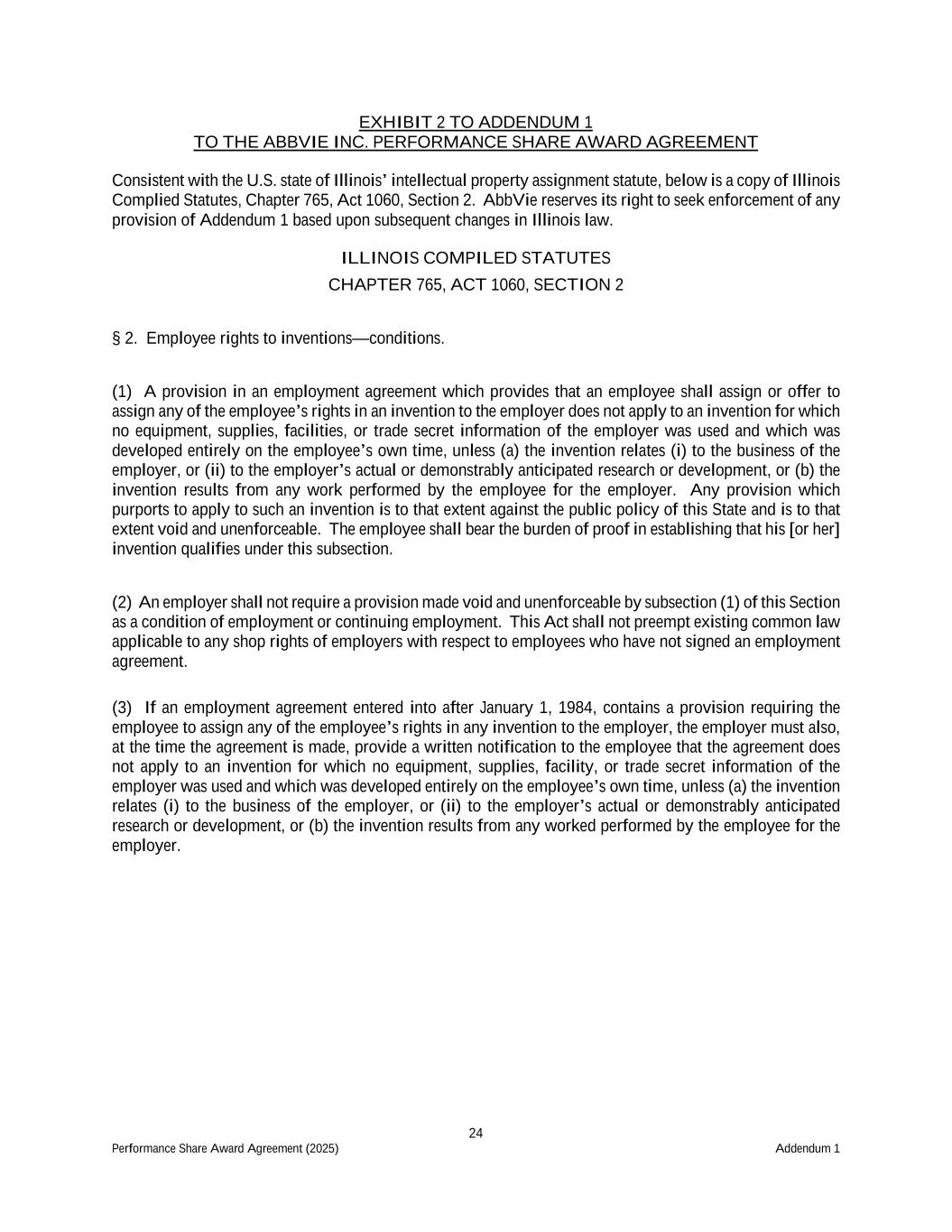 24 Performance Share Award Agreement (2025) Addendum 1 EXHIBIT 2 TO ADDENDUM 1 TO THE ABBVIE INC. PERFORMANCE SHARE AWARD AGREEMENT Consistent with the U.S. state of Illinois’ intellectual property assignment statute, below is a copy of Illinois Complied Statutes, Chapter 765, Act 1060, Section 2. AbbVie reserves its right to seek enforcement of any provision of Addendum 1 based upon subsequent changes in Illinois law. ILLINOIS COMPILED STATUTES CHAPTER 765, ACT 1060, SECTION 2 § 2. Employee rights to inventions—conditions. (1) A provision in an employment agreement which provides that an employee shall assign or offer to assign any of the employee’s rights in an invention to the employer does not apply to an invention for which no equipment, supplies, facilities, or trade secret information of the employer was used and which was developed entirely on the employee’s own time, unless (a) the invention relates (i) to the business of the employer, or (ii) to the employer’s actual or demonstrably anticipated research or development, or (b) the invention results from any work performed by the employee for the employer. Any provision which purports to apply to such an invention is to that extent against the public policy of this State and is to that extent void and unenforceable. The employee shall bear the burden of proof in establishing that his [or her] invention qualifies under this subsection. (2) An employer shall not require a provision made void and unenforceable by subsection (1) of this Section as a condition of employment or continuing employment. This Act shall not preempt existing common law applicable to any shop rights of employers with respect to employees who have not signed an employment agreement. (3) If an employment agreement entered into after January 1, 1984, contains a provision requiring the employee to assign any of the employee’s rights in any invention to the employer, the employer must also, at the time the agreement is made, provide a written notification to the employee that the agreement does not apply to an invention for which no equipment, supplies, facility, or trade secret information of the employer was used and which was developed entirely on the employee’s own time, unless (a) the invention relates (i) to the business of the employer, or (ii) to the employer’s actual or demonstrably anticipated research or development, or (b) the invention results from any worked performed by the employee for the employer.