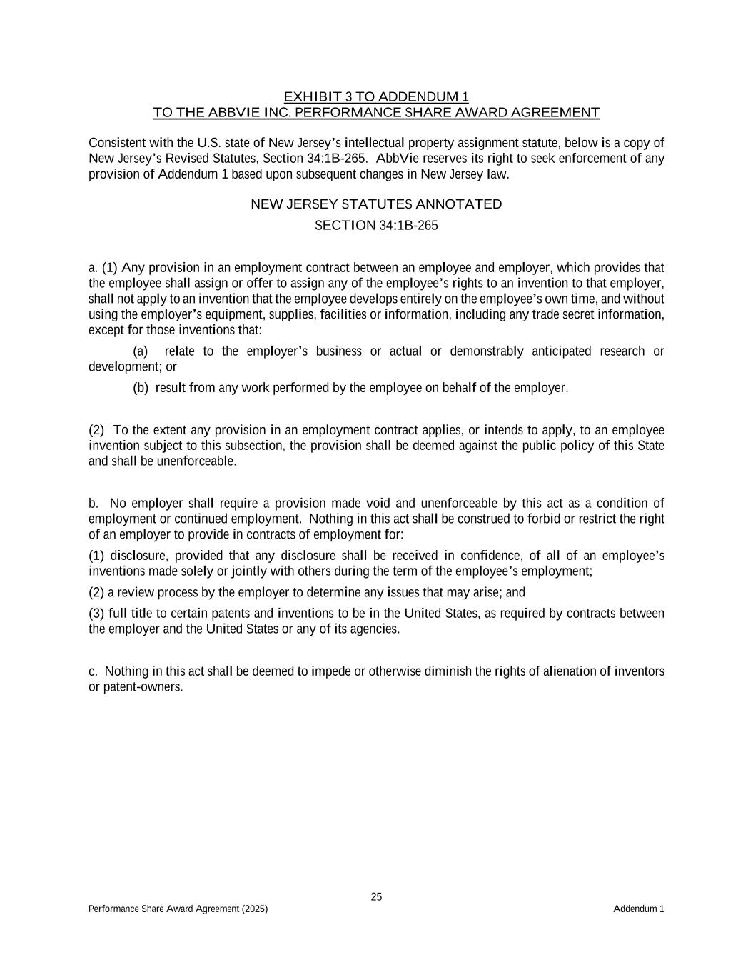 25 Performance Share Award Agreement (2025) Addendum 1 EXHIBIT 3 TO ADDENDUM 1 TO THE ABBVIE INC. PERFORMANCE SHARE AWARD AGREEMENT Consistent with the U.S. state of New Jersey’s intellectual property assignment statute, below is a copy of New Jersey’s Revised Statutes, Section 34:1B-265. AbbVie reserves its right to seek enforcement of any provision of Addendum 1 based upon subsequent changes in New Jersey law. NEW JERSEY STATUTES ANNOTATED SECTION 34:1B-265 a. (1) Any provision in an employment contract between an employee and employer, which provides that the employee shall assign or offer to assign any of the employee’s rights to an invention to that employer, shall not apply to an invention that the employee develops entirely on the employee’s own time, and without using the employer’s equipment, supplies, facilities or information, including any trade secret information, except for those inventions that: (a) relate to the employer’s business or actual or demonstrably anticipated research or development; or (b) result from any work performed by the employee on behalf of the employer. (2) To the extent any provision in an employment contract applies, or intends to apply, to an employee invention subject to this subsection, the provision shall be deemed against the public policy of this State and shall be unenforceable. b. No employer shall require a provision made void and unenforceable by this act as a condition of employment or continued employment. Nothing in this act shall be construed to forbid or restrict the right of an employer to provide in contracts of employment for: (1) disclosure, provided that any disclosure shall be received in confidence, of all of an employee’s inventions made solely or jointly with others during the term of the employee’s employment; (2) a review process by the employer to determine any issues that may arise; and (3) full title to certain patents and inventions to be in the United States, as required by contracts between the employer and the United States or any of its agencies. c. Nothing in this act shall be deemed to impede or otherwise diminish the rights of alienation of inventors or patent-owners.