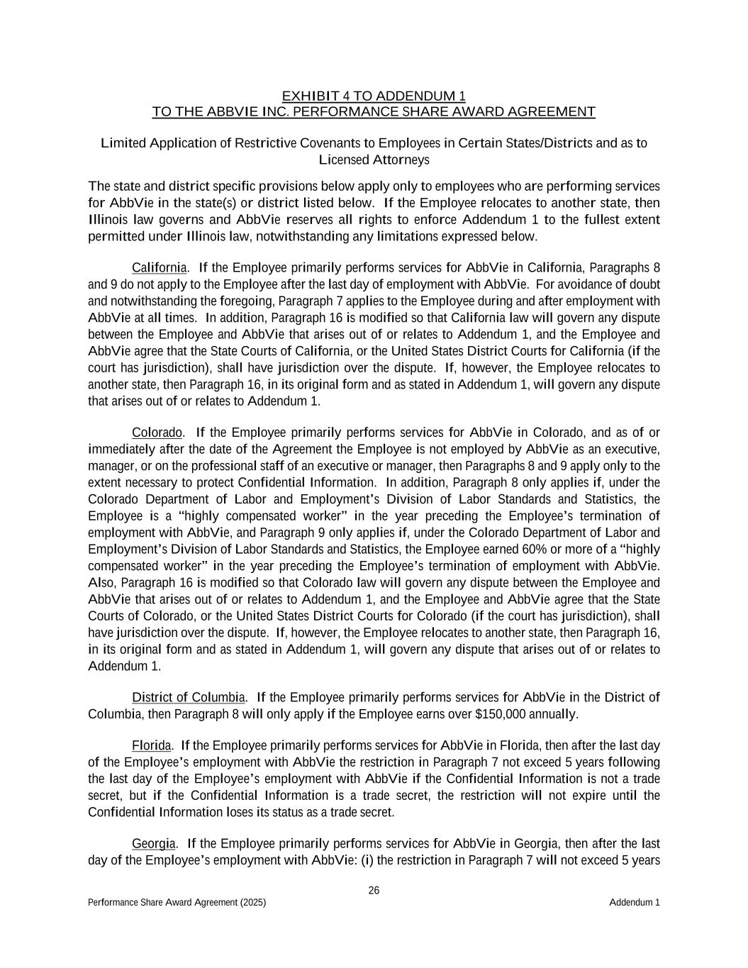 26 Performance Share Award Agreement (2025) Addendum 1 EXHIBIT 4 TO ADDENDUM 1 TO THE ABBVIE INC. PERFORMANCE SHARE AWARD AGREEMENT Limited Application of Restrictive Covenants to Employees in Certain States/Districts and as to Licensed Attorneys The state and district specific provisions below apply only to employees who are performing services for AbbVie in the state(s) or district listed below. If the Employee relocates to another state, then Illinois law governs and AbbVie reserves all rights to enforce Addendum 1 to the fullest extent permitted under Illinois law, notwithstanding any limitations expressed below. California. If the Employee primarily performs services for AbbVie in California, Paragraphs 8 and 9 do not apply to the Employee after the last day of employment with AbbVie. For avoidance of doubt and notwithstanding the foregoing, Paragraph 7 applies to the Employee during and after employment with AbbVie at all times. In addition, Paragraph 16 is modified so that California law will govern any dispute between the Employee and AbbVie that arises out of or relates to Addendum 1, and the Employee and AbbVie agree that the State Courts of California, or the United States District Courts for California (if the court has jurisdiction), shall have jurisdiction over the dispute. If, however, the Employee relocates to another state, then Paragraph 16, in its original form and as stated in Addendum 1, will govern any dispute that arises out of or relates to Addendum 1. Colorado. If the Employee primarily performs services for AbbVie in Colorado, and as of or immediately after the date of the Agreement the Employee is not employed by AbbVie as an executive, manager, or on the professional staff of an executive or manager, then Paragraphs 8 and 9 apply only to the extent necessary to protect Confidential Information. In addition, Paragraph 8 only applies if, under the Colorado Department of Labor and Employment’s Division of Labor Standards and Statistics, the Employee is a “highly compensated worker” in the year preceding the Employee’s termination of employment with AbbVie, and Paragraph 9 only applies if, under the Colorado Department of Labor and Employment’s Division of Labor Standards and Statistics, the Employee earned 60% or more of a “highly compensated worker” in the year preceding the Employee’s termination of employment with AbbVie. Also, Paragraph 16 is modified so that Colorado law will govern any dispute between the Employee and AbbVie that arises out of or relates to Addendum 1, and the Employee and AbbVie agree that the State Courts of Colorado, or the United States District Courts for Colorado (if the court has jurisdiction), shall have jurisdiction over the dispute. If, however, the Employee relocates to another state, then Paragraph 16, in its original form and as stated in Addendum 1, will govern any dispute that arises out of or relates to Addendum 1. District of Columbia. If the Employee primarily performs services for AbbVie in the District of Columbia, then Paragraph 8 will only apply if the Employee earns over $150,000 annually. Florida. If the Employee primarily performs services for AbbVie in Florida, then after the last day of the Employee’s employment with AbbVie the restriction in Paragraph 7 not exceed 5 years following the last day of the Employee’s employment with AbbVie if the Confidential Information is not a trade secret, but if the Confidential Information is a trade secret, the restriction will not expire until the Confidential Information loses its status as a trade secret. Georgia. If the Employee primarily performs services for AbbVie in Georgia, then after the last day of the Employee’s employment with AbbVie: (i) the restriction in Paragraph 7 will not exceed 5 years