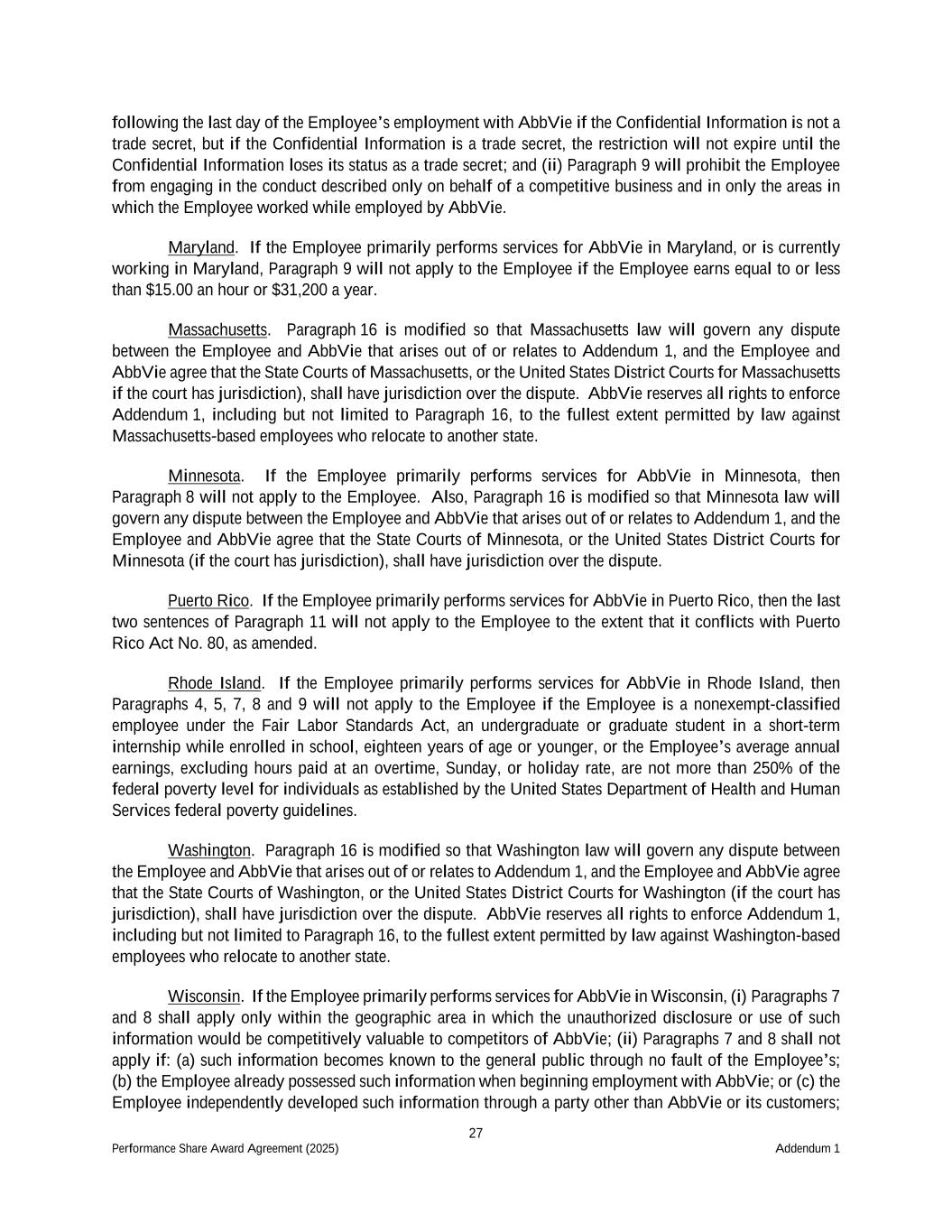 27 Performance Share Award Agreement (2025) Addendum 1 following the last day of the Employee’s employment with AbbVie if the Confidential Information is not a trade secret, but if the Confidential Information is a trade secret, the restriction will not expire until the Confidential Information loses its status as a trade secret; and (ii) Paragraph 9 will prohibit the Employee from engaging in the conduct described only on behalf of a competitive business and in only the areas in which the Employee worked while employed by AbbVie. Maryland. If the Employee primarily performs services for AbbVie in Maryland, or is currently working in Maryland, Paragraph 9 will not apply to the Employee if the Employee earns equal to or less than $15.00 an hour or $31,200 a year. Massachusetts. Paragraph 16 is modified so that Massachusetts law will govern any dispute between the Employee and AbbVie that arises out of or relates to Addendum 1, and the Employee and AbbVie agree that the State Courts of Massachusetts, or the United States District Courts for Massachusetts if the court has jurisdiction), shall have jurisdiction over the dispute. AbbVie reserves all rights to enforce Addendum 1, including but not limited to Paragraph 16, to the fullest extent permitted by law against Massachusetts-based employees who relocate to another state. Minnesota. If the Employee primarily performs services for AbbVie in Minnesota, then Paragraph 8 will not apply to the Employee. Also, Paragraph 16 is modified so that Minnesota law will govern any dispute between the Employee and AbbVie that arises out of or relates to Addendum 1, and the Employee and AbbVie agree that the State Courts of Minnesota, or the United States District Courts for Minnesota (if the court has jurisdiction), shall have jurisdiction over the dispute. Puerto Rico. If the Employee primarily performs services for AbbVie in Puerto Rico, then the last two sentences of Paragraph 11 will not apply to the Employee to the extent that it conflicts with Puerto Rico Act No. 80, as amended. Rhode Island. If the Employee primarily performs services for AbbVie in Rhode Island, then Paragraphs 4, 5, 7, 8 and 9 will not apply to the Employee if the Employee is a nonexempt-classified employee under the Fair Labor Standards Act, an undergraduate or graduate student in a short-term internship while enrolled in school, eighteen years of age or younger, or the Employee’s average annual earnings, excluding hours paid at an overtime, Sunday, or holiday rate, are not more than 250% of the federal poverty level for individuals as established by the United States Department of Health and Human Services federal poverty guidelines. Washington. Paragraph 16 is modified so that Washington law will govern any dispute between the Employee and AbbVie that arises out of or relates to Addendum 1, and the Employee and AbbVie agree that the State Courts of Washington, or the United States District Courts for Washington (if the court has jurisdiction), shall have jurisdiction over the dispute. AbbVie reserves all rights to enforce Addendum 1, including but not limited to Paragraph 16, to the fullest extent permitted by law against Washington-based employees who relocate to another state. Wisconsin. If the Employee primarily performs services for AbbVie in Wisconsin, (i) Paragraphs 7 and 8 shall apply only within the geographic area in which the unauthorized disclosure or use of such information would be competitively valuable to competitors of AbbVie; (ii) Paragraphs 7 and 8 shall not apply if: (a) such information becomes known to the general public through no fault of the Employee’s; (b) the Employee already possessed such information when beginning employment with AbbVie; or (c) the Employee independently developed such information through a party other than AbbVie or its customers;