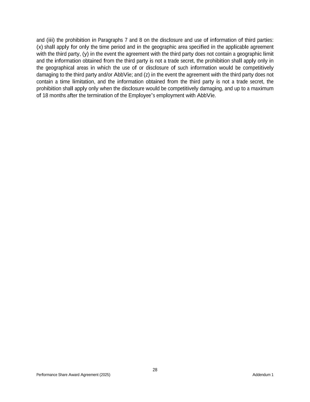 28 Performance Share Award Agreement (2025) Addendum 1 and (iii) the prohibition in Paragraphs 7 and 8 on the disclosure and use of information of third parties: (x) shall apply for only the time period and in the geographic area specified in the applicable agreement with the third party, (y) in the event the agreement with the third party does not contain a geographic limit and the information obtained from the third party is not a trade secret, the prohibition shall apply only in the geographical areas in which the use of or disclosure of such information would be competitively damaging to the third party and/or AbbVie; and (z) in the event the agreement with the third party does not contain a time limitation, and the information obtained from the third party is not a trade secret, the prohibition shall apply only when the disclosure would be competitively damaging, and up to a maximum of 18 months after the termination of the Employee’s employment with AbbVie.