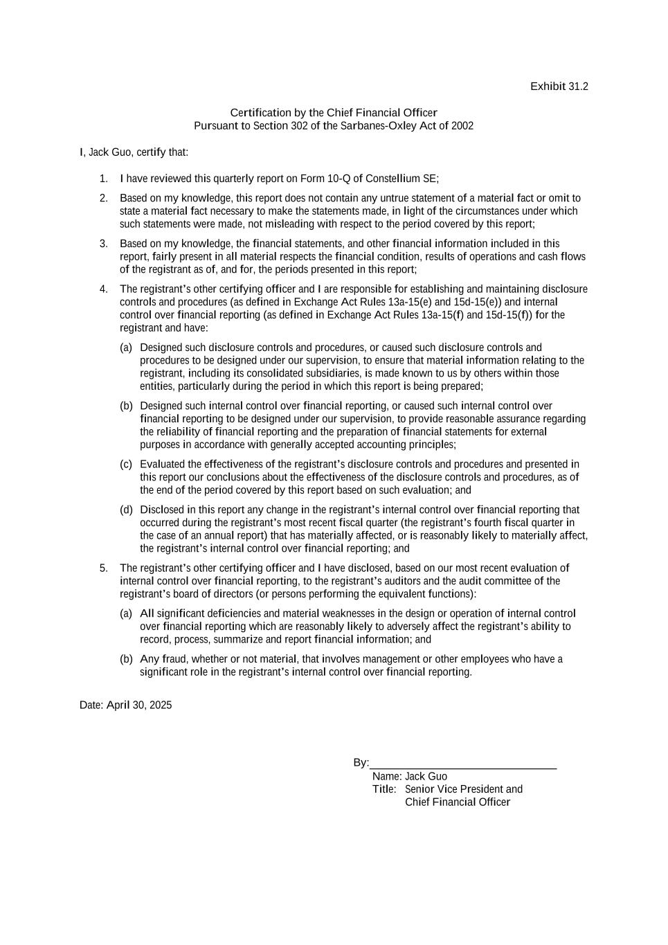 Exhibit 31.2 Certification by the Chief Financial Officer Pursuant to Section 302 of the Sarbanes-Oxley Act of 2002 I, Jack Guo, certify that: 1. I have reviewed this quarterly report on Form 10-Q of Constellium SE; 2. Based on my knowledge, this report does not contain any untrue statement of a material fact or omit to state a material fact necessary to make the statements made, in light of the circumstances under which such statements were made, not misleading with respect to the period covered by this report; 3. Based on my knowledge, the financial statements, and other financial information included in this report, fairly present in all material respects the financial condition, results of operations and cash flows of the registrant as of, and for, the periods presented in this report; 4. The registrant’s other certifying officer and I are responsible for establishing and maintaining disclosure controls and procedures (as defined in Exchange Act Rules 13a-15(e) and 15d-15(e)) and internal control over financial reporting (as defined in Exchange Act Rules 13a-15(f) and 15d-15(f)) for the registrant and have: (a) Designed such disclosure controls and procedures, or caused such disclosure controls and procedures to be designed under our supervision, to ensure that material information relating to the registrant, including its consolidated subsidiaries, is made known to us by others within those entities, particularly during the period in which this report is being prepared; (b) Designed such internal control over financial reporting, or caused such internal control over financial reporting to be designed under our supervision, to provide reasonable assurance regarding the reliability of financial reporting and the preparation of financial statements for external purposes in accordance with generally accepted accounting principles; (c) Evaluated the effectiveness of the registrant’s disclosure controls and procedures and presented in this report our conclusions about the effectiveness of the disclosure controls and procedures, as of the end of the period covered by this report based on such evaluation; and (d) Disclosed in this report any change in the registrant’s internal control over financial reporting that occurred during the registrant’s most recent fiscal quarter (the registrant’s fourth fiscal quarter in the case of an annual report) that has materially affected, or is reasonably likely to materially affect, the registrant’s internal control over financial reporting; and 5. The registrant’s other certifying officer and I have disclosed, based on our most recent evaluation of internal control over financial reporting, to the registrant’s auditors and the audit committee of the registrant’s board of directors (or persons performing the equivalent functions): (a) All significant deficiencies and material weaknesses in the design or operation of internal control over financial reporting which are reasonably likely to adversely affect the registrant’s ability to record, process, summarize and report financial information; and (b) Any fraud, whether or not material, that involves management or other employees who have a significant role in the registrant’s internal control over financial reporting. Date: April 30, 2025 By: Name: Jack Guo Title: Senior Vice President and Chief Financial Officer