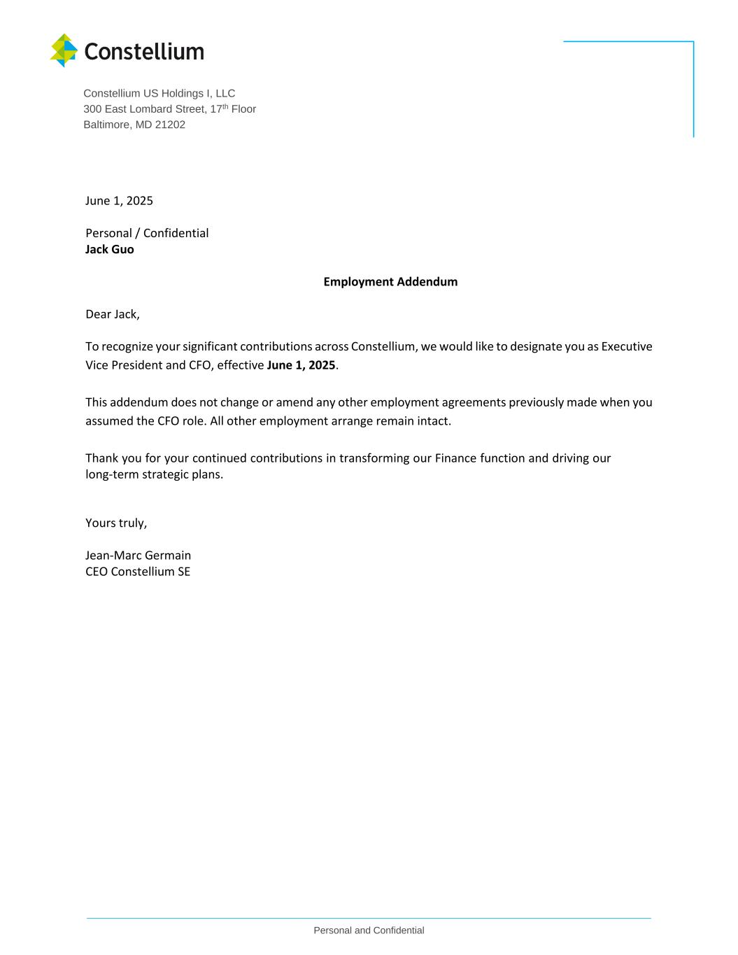 Constellium US Holdings I, LLC 300 East Lombard Street, 17th Floor Baltimore, MD 21202 Personal and Confidential June 1, 2025 Personal / Confidential Jack Guo Employment Addendum Dear Jack, To recognize your significant contributions across Constellium, we would like to designate you as Executive Vice President and CFO, effective June 1, 2025. This addendum does not change or amend any other employment agreements previously made when you assumed the CFO role. All other employment arrange remain intact. Thank you for your continued contributions in transforming our Finance function and driving our long-term strategic plans. Yours truly, Jean-Marc Germain CEO Constellium SE