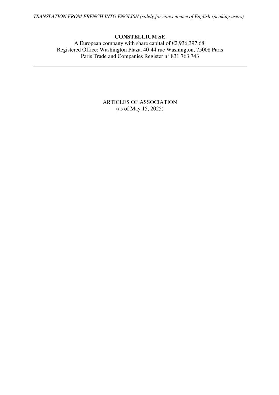 TRANSLATION FROM FRENCH INTO ENGLISH (solely for convenience of English speaking users) CONSTELLIUM SE A European company with share capital of €2,936,397.68 Registered Office: Washington Plaza, 40-44 rue Washington, 75008 Paris Paris Trade and Companies Register n° 831 763 743 ARTICLES OF ASSOCIATION (as of May 15, 2025)