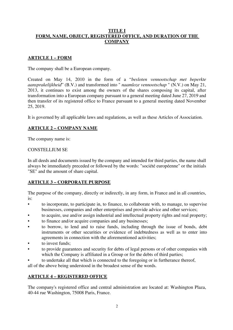 2 TITLE I FORM, NAME, OBJECT, REGISTERED OFFICE, AND DURATION OF THE COMPANY ARTICLE 1 – FORM The company shall be a European company. Created on May 14, 2010 in the form of a “besloten vennootschap met beperkte aansprakelijkheid” (B.V.) and transformed into " naamloze vennootschap " (N.V.) on May 21, 2013, it continues to exist among the owners of the shares composing its capital, after transformation into a European company pursuant to a general meeting dated June 27, 2019 and then transfer of its registered office to France pursuant to a general meeting dated November 25, 2019. It is governed by all applicable laws and regulations, as well as these Articles of Association. ARTICLE 2 – COMPANY NAME The company name is: CONSTELLIUM SE In all deeds and documents issued by the company and intended for third parties, the name shall always be immediately preceded or followed by the words: "société européenne" or the initials "SE" and the amount of share capital. ARTICLE 3 – CORPORATE PURPOSE The purpose of the company, directly or indirectly, in any form, in France and in all countries, is: • to incorporate, to participate in, to finance, to collaborate with, to manage, to supervise businesses, companies and other enterprises and provide advice and other services; • to acquire, use and/or assign industrial and intellectual property rights and real property; • to finance and/or acquire companies and any businesses; • to borrow, to lend and to raise funds, including through the issue of bonds, debt instruments or other securities or evidence of indebtedness as well as to enter into agreements in connection with the aforementioned activities; • to invest funds; • to provide guarantees and security for debts of legal persons or of other companies with which the Company is affiliated in a Group or for the debts of third parties; • to undertake all that which is connected to the foregoing or in furtherance thereof, all of the above being understood in the broadest sense of the words. ARTICLE 4 – REGISTERED OFFICE The company's registered office and central administration are located at: Washington Plaza, 40-44 rue Washington, 75008 Paris, France.