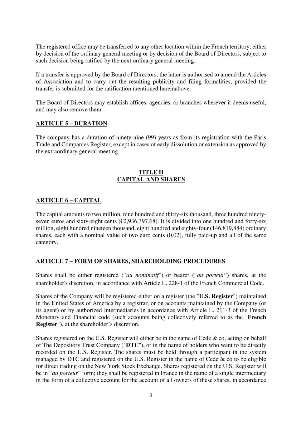 3 The registered office may be transferred to any other location within the French territory, either by decision of the ordinary general meeting or by decision of the Board of Directors, subject to such decision being ratified by the next ordinary general meeting. If a transfer is approved by the Board of Directors, the latter is authorised to amend the Articles of Association and to carry out the resulting publicity and filing formalities, provided the transfer is submitted for the ratification mentioned hereinabove. The Board of Directors may establish offices, agencies, or branches wherever it deems useful, and may also remove them. ARTICLE 5 – DURATION The company has a duration of ninety-nine (99) years as from its registration with the Paris Trade and Companies Register, except in cases of early dissolution or extension as approved by the extraordinary general meeting. TITLE II CAPITAL AND SHARES ARTICLE 6 – CAPITAL The capital amounts to two million, nine hundred and thirty-six thousand, three hundred ninety- seven euros and sixty-eight cents (€2,936,397.68). It is divided into one hundred and forty-six million, eight hundred nineteen thousand, eight hundred and eighty-four (146,819,884) ordinary shares, each with a nominal value of two euro cents (0.02), fully paid-up and all of the same category. ARTICLE 7 – FORM OF SHARES, SHAREHOLDING PROCEDURES Shares shall be either registered (“au nominatif”) or bearer (“au porteur”) shares, at the shareholder's discretion, in accordance with Article L. 228-1 of the French Commercial Code. Shares of the Company will be registered either on a register (the "U.S. Register") maintained in the United States of America by a registrar, or on accounts maintained by the Company (or its agent) or by authorized intermediaries in accordance with Article L. 211-3 of the French Monetary and Financial code (such accounts being collectively referred to as the "French Register"), at the shareholder’s discretion. Shares registered on the U.S. Register will either be in the name of Cede & co, acting on behalf of The Depository Trust Company ("DTC"), or in the name of holders who want to be directly recorded on the U.S. Register. The shares must be held through a participant in the system managed by DTC and registered on the U.S. Register in the name of Cede & co to be eligible for direct trading on the New York Stock Exchange. Shares registered on the U.S. Register will be in “au porteur” form; they shall be registered in France in the name of a single intermediary in the form of a collective account for the account of all owners of these shares, in accordance