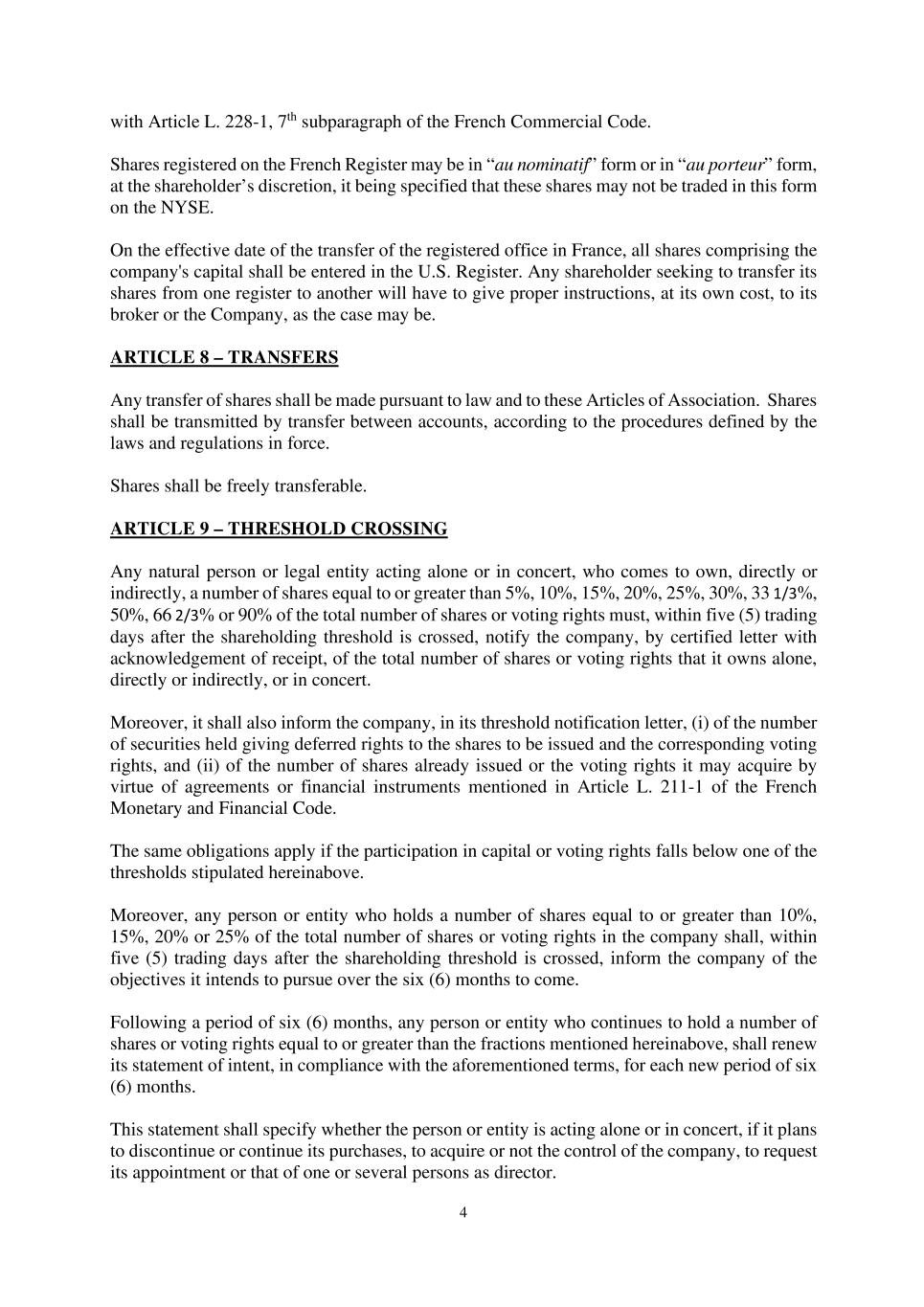 4 with Article L. 228-1, 7th subparagraph of the French Commercial Code. Shares registered on the French Register may be in “au nominatif” form or in “au porteur” form, at the shareholder’s discretion, it being specified that these shares may not be traded in this form on the NYSE. On the effective date of the transfer of the registered office in France, all shares comprising the company's capital shall be entered in the U.S. Register. Any shareholder seeking to transfer its shares from one register to another will have to give proper instructions, at its own cost, to its broker or the Company, as the case may be. ARTICLE 8 – TRANSFERS Any transfer of shares shall be made pursuant to law and to these Articles of Association. Shares shall be transmitted by transfer between accounts, according to the procedures defined by the laws and regulations in force. Shares shall be freely transferable. ARTICLE 9 – THRESHOLD CROSSING Any natural person or legal entity acting alone or in concert, who comes to own, directly or indirectly, a number of shares equal to or greater than 5%, 10%, 15%, 20%, 25%, 30%, 33 1/3%, 50%, 66 2/3% or 90% of the total number of shares or voting rights must, within five (5) trading days after the shareholding threshold is crossed, notify the company, by certified letter with acknowledgement of receipt, of the total number of shares or voting rights that it owns alone, directly or indirectly, or in concert. Moreover, it shall also inform the company, in its threshold notification letter, (i) of the number of securities held giving deferred rights to the shares to be issued and the corresponding voting rights, and (ii) of the number of shares already issued or the voting rights it may acquire by virtue of agreements or financial instruments mentioned in Article L. 211-1 of the French Monetary and Financial Code. The same obligations apply if the participation in capital or voting rights falls below one of the thresholds stipulated hereinabove. Moreover, any person or entity who holds a number of shares equal to or greater than 10%, 15%, 20% or 25% of the total number of shares or voting rights in the company shall, within five (5) trading days after the shareholding threshold is crossed, inform the company of the objectives it intends to pursue over the six (6) months to come. Following a period of six (6) months, any person or entity who continues to hold a number of shares or voting rights equal to or greater than the fractions mentioned hereinabove, shall renew its statement of intent, in compliance with the aforementioned terms, for each new period of six (6) months. This statement shall specify whether the person or entity is acting alone or in concert, if it plans to discontinue or continue its purchases, to acquire or not the control of the company, to request its appointment or that of one or several persons as director.