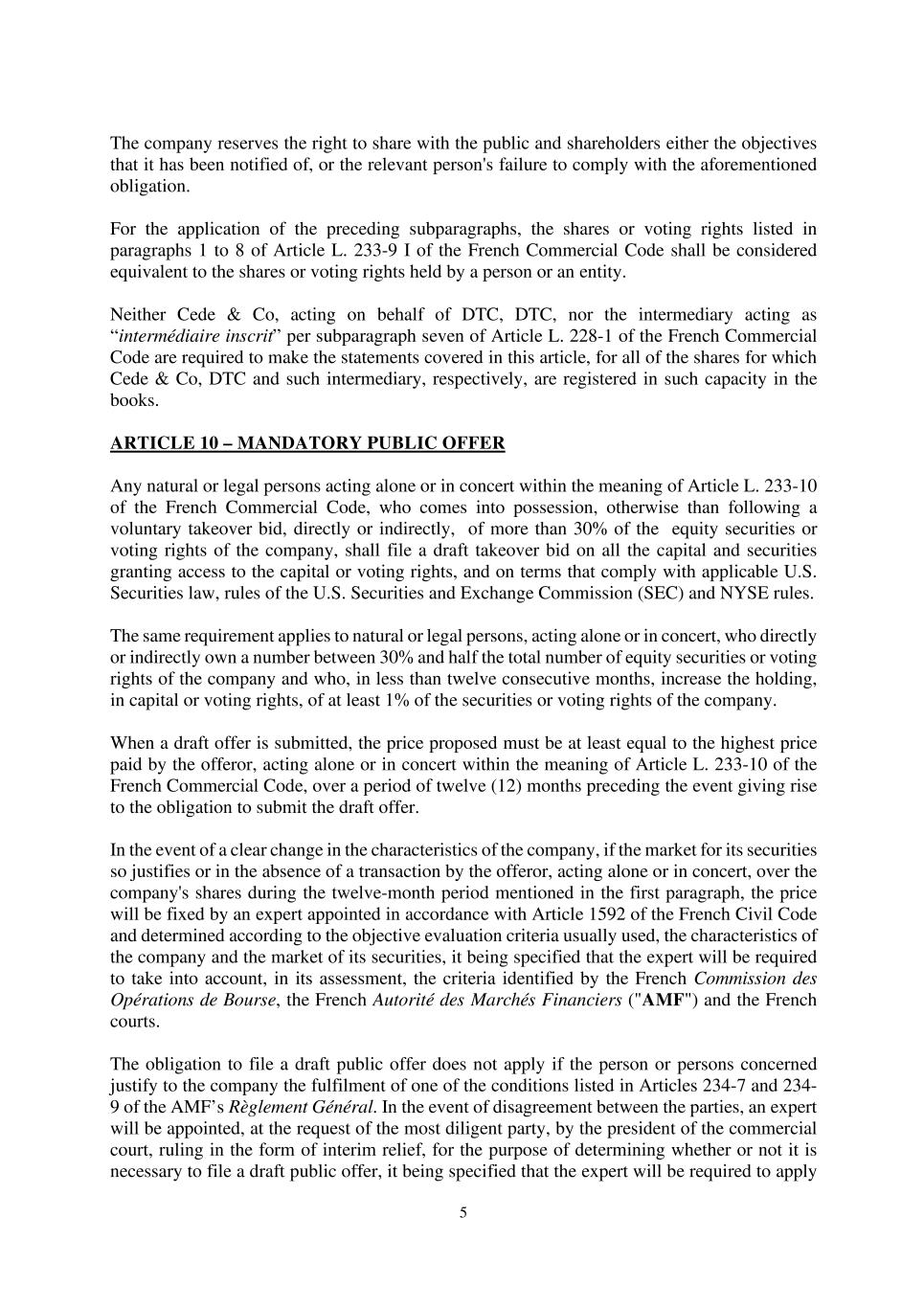 5 The company reserves the right to share with the public and shareholders either the objectives that it has been notified of, or the relevant person's failure to comply with the aforementioned obligation. For the application of the preceding subparagraphs, the shares or voting rights listed in paragraphs 1 to 8 of Article L. 233-9 I of the French Commercial Code shall be considered equivalent to the shares or voting rights held by a person or an entity. Neither Cede & Co, acting on behalf of DTC, DTC, nor the intermediary acting as “intermédiaire inscrit” per subparagraph seven of Article L. 228-1 of the French Commercial Code are required to make the statements covered in this article, for all of the shares for which Cede & Co, DTC and such intermediary, respectively, are registered in such capacity in the books. ARTICLE 10 – MANDATORY PUBLIC OFFER Any natural or legal persons acting alone or in concert within the meaning of Article L. 233-10 of the French Commercial Code, who comes into possession, otherwise than following a voluntary takeover bid, directly or indirectly, of more than 30% of the equity securities or voting rights of the company, shall file a draft takeover bid on all the capital and securities granting access to the capital or voting rights, and on terms that comply with applicable U.S. Securities law, rules of the U.S. Securities and Exchange Commission (SEC) and NYSE rules. The same requirement applies to natural or legal persons, acting alone or in concert, who directly or indirectly own a number between 30% and half the total number of equity securities or voting rights of the company and who, in less than twelve consecutive months, increase the holding, in capital or voting rights, of at least 1% of the securities or voting rights of the company. When a draft offer is submitted, the price proposed must be at least equal to the highest price paid by the offeror, acting alone or in concert within the meaning of Article L. 233-10 of the French Commercial Code, over a period of twelve (12) months preceding the event giving rise to the obligation to submit the draft offer. In the event of a clear change in the characteristics of the company, if the market for its securities so justifies or in the absence of a transaction by the offeror, acting alone or in concert, over the company's shares during the twelve-month period mentioned in the first paragraph, the price will be fixed by an expert appointed in accordance with Article 1592 of the French Civil Code and determined according to the objective evaluation criteria usually used, the characteristics of the company and the market of its securities, it being specified that the expert will be required to take into account, in its assessment, the criteria identified by the French Commission des Opérations de Bourse, the French Autorité des Marchés Financiers ("AMF") and the French courts. The obligation to file a draft public offer does not apply if the person or persons concerned justify to the company the fulfilment of one of the conditions listed in Articles 234-7 and 234- 9 of the AMF’s Règlement Général. In the event of disagreement between the parties, an expert will be appointed, at the request of the most diligent party, by the president of the commercial court, ruling in the form of interim relief, for the purpose of determining whether or not it is necessary to file a draft public offer, it being specified that the expert will be required to apply