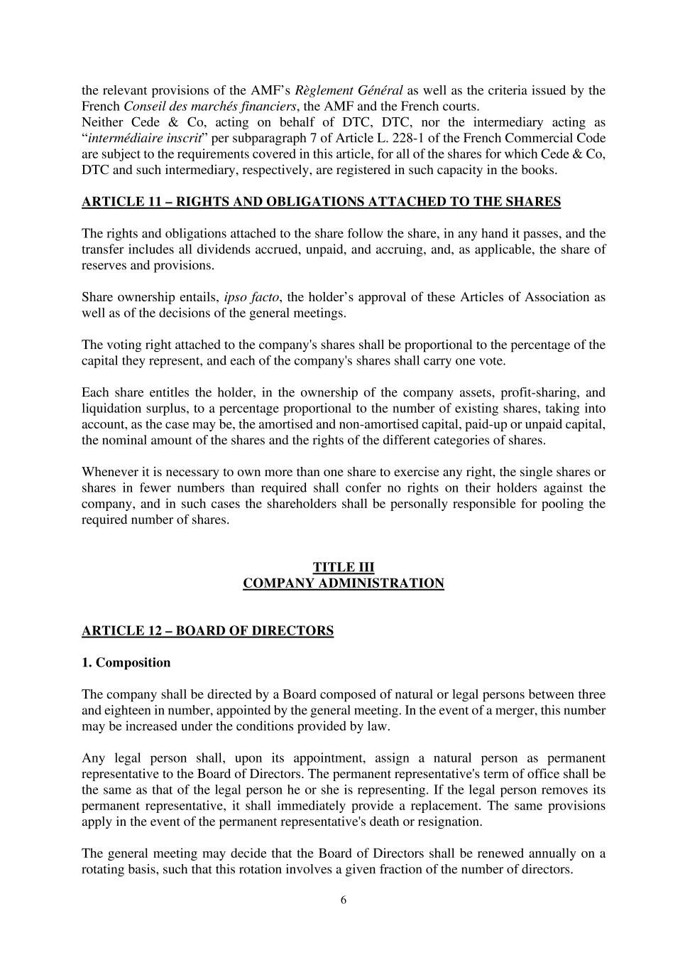 6 the relevant provisions of the AMF’s Règlement Général as well as the criteria issued by the French Conseil des marchés financiers, the AMF and the French courts. Neither Cede & Co, acting on behalf of DTC, DTC, nor the intermediary acting as “intermédiaire inscrit” per subparagraph 7 of Article L. 228-1 of the French Commercial Code are subject to the requirements covered in this article, for all of the shares for which Cede & Co, DTC and such intermediary, respectively, are registered in such capacity in the books. ARTICLE 11 – RIGHTS AND OBLIGATIONS ATTACHED TO THE SHARES The rights and obligations attached to the share follow the share, in any hand it passes, and the transfer includes all dividends accrued, unpaid, and accruing, and, as applicable, the share of reserves and provisions. Share ownership entails, ipso facto, the holder’s approval of these Articles of Association as well as of the decisions of the general meetings. The voting right attached to the company's shares shall be proportional to the percentage of the capital they represent, and each of the company's shares shall carry one vote. Each share entitles the holder, in the ownership of the company assets, profit-sharing, and liquidation surplus, to a percentage proportional to the number of existing shares, taking into account, as the case may be, the amortised and non-amortised capital, paid-up or unpaid capital, the nominal amount of the shares and the rights of the different categories of shares. Whenever it is necessary to own more than one share to exercise any right, the single shares or shares in fewer numbers than required shall confer no rights on their holders against the company, and in such cases the shareholders shall be personally responsible for pooling the required number of shares. TITLE III COMPANY ADMINISTRATION ARTICLE 12 – BOARD OF DIRECTORS 1. Composition The company shall be directed by a Board composed of natural or legal persons between three and eighteen in number, appointed by the general meeting. In the event of a merger, this number may be increased under the conditions provided by law. Any legal person shall, upon its appointment, assign a natural person as permanent representative to the Board of Directors. The permanent representative's term of office shall be the same as that of the legal person he or she is representing. If the legal person removes its permanent representative, it shall immediately provide a replacement. The same provisions apply in the event of the permanent representative's death or resignation. The general meeting may decide that the Board of Directors shall be renewed annually on a rotating basis, such that this rotation involves a given fraction of the number of directors.