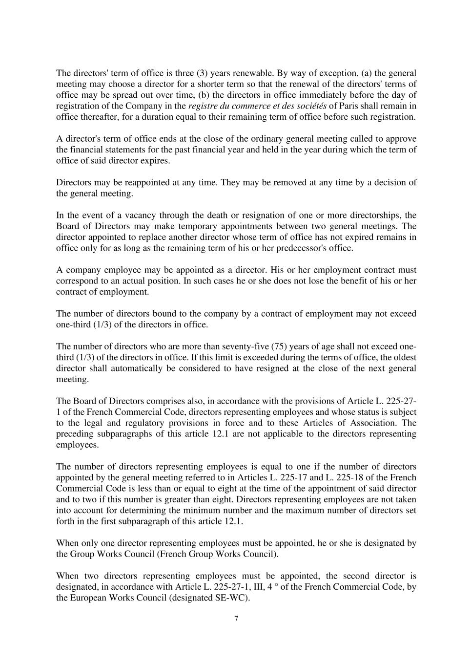 7 The directors' term of office is three (3) years renewable. By way of exception, (a) the general meeting may choose a director for a shorter term so that the renewal of the directors' terms of office may be spread out over time, (b) the directors in office immediately before the day of registration of the Company in the registre du commerce et des sociétés of Paris shall remain in office thereafter, for a duration equal to their remaining term of office before such registration. A director's term of office ends at the close of the ordinary general meeting called to approve the financial statements for the past financial year and held in the year during which the term of office of said director expires. Directors may be reappointed at any time. They may be removed at any time by a decision of the general meeting. In the event of a vacancy through the death or resignation of one or more directorships, the Board of Directors may make temporary appointments between two general meetings. The director appointed to replace another director whose term of office has not expired remains in office only for as long as the remaining term of his or her predecessor's office. A company employee may be appointed as a director. His or her employment contract must correspond to an actual position. In such cases he or she does not lose the benefit of his or her contract of employment. The number of directors bound to the company by a contract of employment may not exceed one-third (1/3) of the directors in office. The number of directors who are more than seventy-five (75) years of age shall not exceed one- third (1/3) of the directors in office. If this limit is exceeded during the terms of office, the oldest director shall automatically be considered to have resigned at the close of the next general meeting. The Board of Directors comprises also, in accordance with the provisions of Article L. 225-27- 1 of the French Commercial Code, directors representing employees and whose status is subject to the legal and regulatory provisions in force and to these Articles of Association. The preceding subparagraphs of this article 12.1 are not applicable to the directors representing employees. The number of directors representing employees is equal to one if the number of directors appointed by the general meeting referred to in Articles L. 225-17 and L. 225-18 of the French Commercial Code is less than or equal to eight at the time of the appointment of said director and to two if this number is greater than eight. Directors representing employees are not taken into account for determining the minimum number and the maximum number of directors set forth in the first subparagraph of this article 12.1. When only one director representing employees must be appointed, he or she is designated by the Group Works Council (French Group Works Council). When two directors representing employees must be appointed, the second director is designated, in accordance with Article L. 225-27-1, III, 4 ° of the French Commercial Code, by the European Works Council (designated SE-WC).