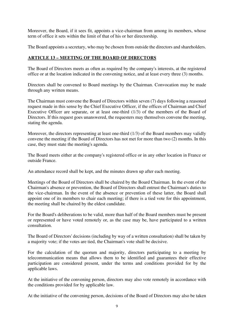 9 Moreover, the Board, if it sees fit, appoints a vice-chairman from among its members, whose term of office it sets within the limit of that of his or her directorship. The Board appoints a secretary, who may be chosen from outside the directors and shareholders. ARTICLE 13 – MEETING OF THE BOARD OF DIRECTORS The Board of Directors meets as often as required by the company's interests, at the registered office or at the location indicated in the convening notice, and at least every three (3) months. Directors shall be convened to Board meetings by the Chairman. Convocation may be made through any written means. The Chairman must convene the Board of Directors within seven (7) days following a reasoned request made in this sense by the Chief Executive Officer, if the offices of Chairman and Chief Executive Officer are separate, or at least one-third (1/3) of the members of the Board of Directors. If this request goes unanswered, the requesters may themselves convene the meeting, stating the agenda. Moreover, the directors representing at least one-third (1/3) of the Board members may validly convene the meeting if the Board of Directors has not met for more than two (2) months. In this case, they must state the meeting's agenda. The Board meets either at the company's registered office or in any other location in France or outside France. An attendance record shall be kept, and the minutes drawn up after each meeting. Meetings of the Board of Directors shall be chaired by the Board Chairman. In the event of the Chairman's absence or prevention, the Board of Directors shall entrust the Chairman's duties to the vice-chairman. In the event of the absence or prevention of these latter, the Board shall appoint one of its members to chair each meeting; if there is a tied vote for this appointment, the meeting shall be chaired by the eldest candidate. For the Board's deliberations to be valid, more than half of the Board members must be present or represented or have voted remotely or, as the case may be, have participated to a written consultation. The Board of Directors' decisions (including by way of a written consultation) shall be taken by a majority vote; if the votes are tied, the Chairman's vote shall be decisive. For the calculation of the quorum and majority, directors participating to a meeting by telecommunication means that allows them to be identified and guarantees their effective participation are considered present, under the terms and conditions provided for by the applicable laws. At the initiative of the convening person, directors may also vote remotely in accordance with the conditions provided for by applicable law. At the initiative of the convening person, decisions of the Board of Directors may also be taken
