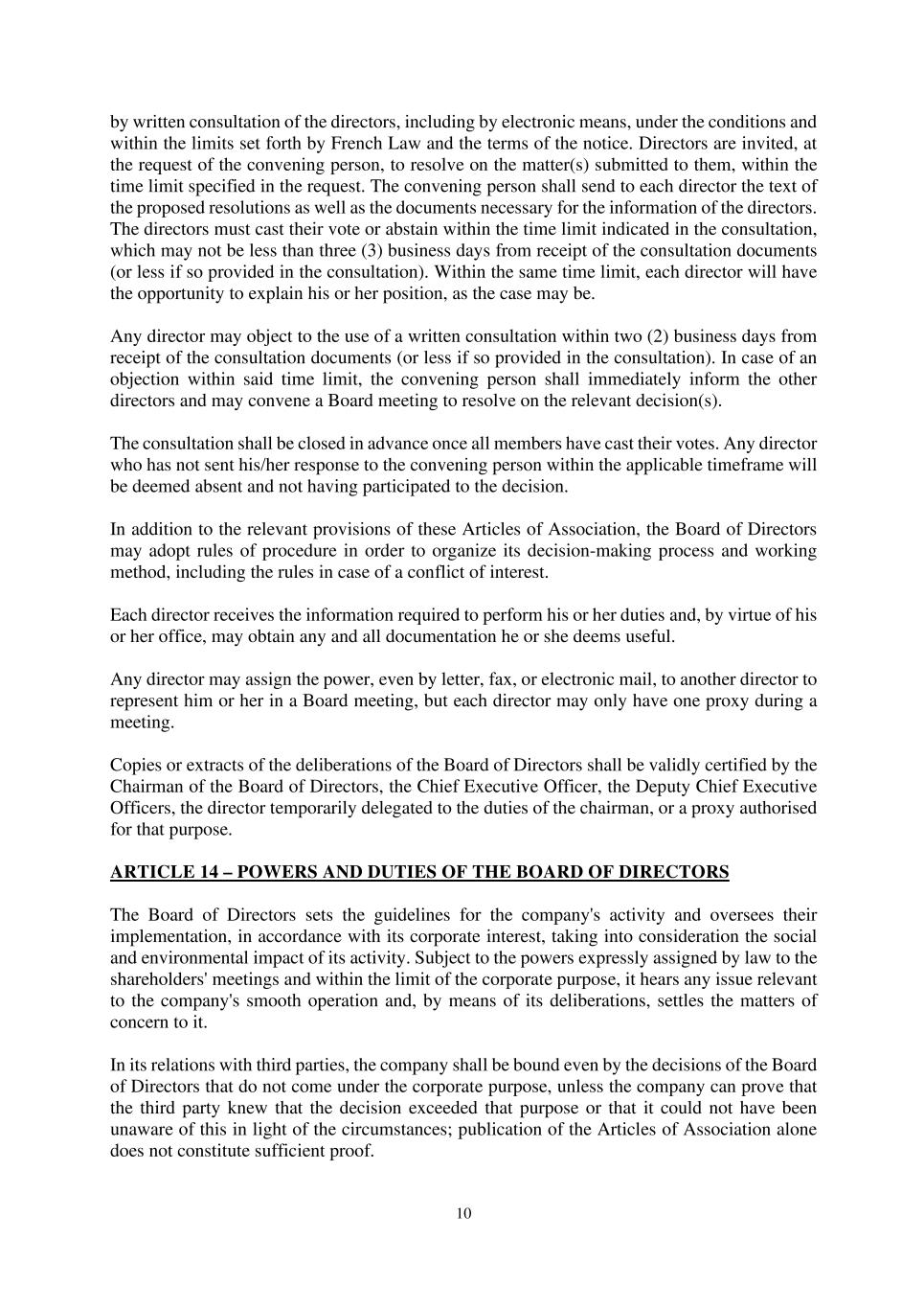 10 by written consultation of the directors, including by electronic means, under the conditions and within the limits set forth by French Law and the terms of the notice. Directors are invited, at the request of the convening person, to resolve on the matter(s) submitted to them, within the time limit specified in the request. The convening person shall send to each director the text of the proposed resolutions as well as the documents necessary for the information of the directors. The directors must cast their vote or abstain within the time limit indicated in the consultation, which may not be less than three (3) business days from receipt of the consultation documents (or less if so provided in the consultation). Within the same time limit, each director will have the opportunity to explain his or her position, as the case may be. Any director may object to the use of a written consultation within two (2) business days from receipt of the consultation documents (or less if so provided in the consultation). In case of an objection within said time limit, the convening person shall immediately inform the other directors and may convene a Board meeting to resolve on the relevant decision(s). The consultation shall be closed in advance once all members have cast their votes. Any director who has not sent his/her response to the convening person within the applicable timeframe will be deemed absent and not having participated to the decision. In addition to the relevant provisions of these Articles of Association, the Board of Directors may adopt rules of procedure in order to organize its decision-making process and working method, including the rules in case of a conflict of interest. Each director receives the information required to perform his or her duties and, by virtue of his or her office, may obtain any and all documentation he or she deems useful. Any director may assign the power, even by letter, fax, or electronic mail, to another director to represent him or her in a Board meeting, but each director may only have one proxy during a meeting. Copies or extracts of the deliberations of the Board of Directors shall be validly certified by the Chairman of the Board of Directors, the Chief Executive Officer, the Deputy Chief Executive Officers, the director temporarily delegated to the duties of the chairman, or a proxy authorised for that purpose. ARTICLE 14 – POWERS AND DUTIES OF THE BOARD OF DIRECTORS The Board of Directors sets the guidelines for the company's activity and oversees their implementation, in accordance with its corporate interest, taking into consideration the social and environmental impact of its activity. Subject to the powers expressly assigned by law to the shareholders' meetings and within the limit of the corporate purpose, it hears any issue relevant to the company's smooth operation and, by means of its deliberations, settles the matters of concern to it. In its relations with third parties, the company shall be bound even by the decisions of the Board of Directors that do not come under the corporate purpose, unless the company can prove that the third party knew that the decision exceeded that purpose or that it could not have been unaware of this in light of the circumstances; publication of the Articles of Association alone does not constitute sufficient proof.