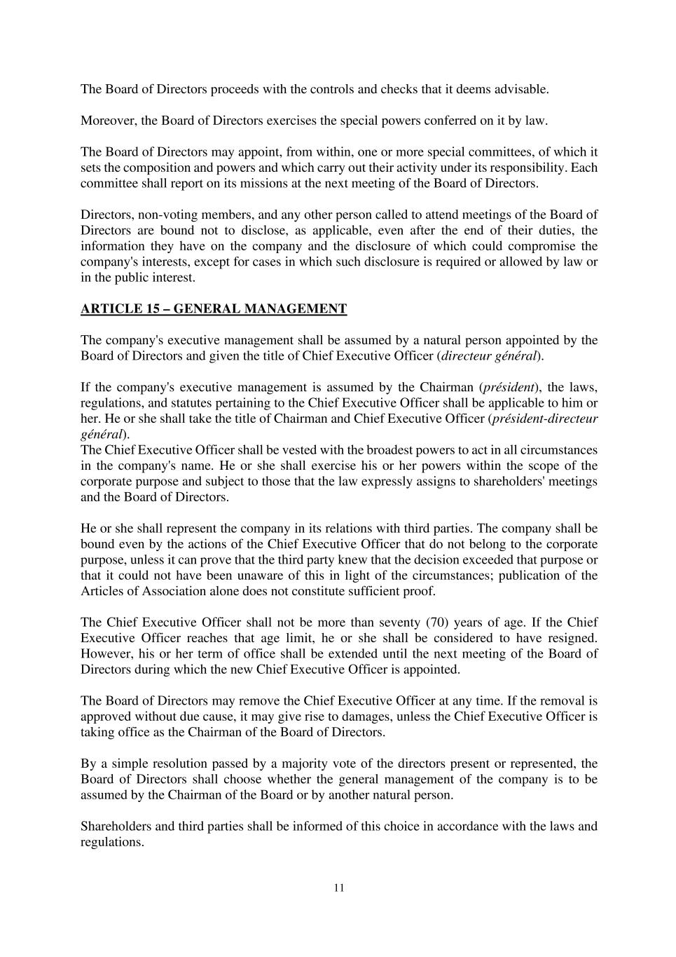 11 The Board of Directors proceeds with the controls and checks that it deems advisable. Moreover, the Board of Directors exercises the special powers conferred on it by law. The Board of Directors may appoint, from within, one or more special committees, of which it sets the composition and powers and which carry out their activity under its responsibility. Each committee shall report on its missions at the next meeting of the Board of Directors. Directors, non-voting members, and any other person called to attend meetings of the Board of Directors are bound not to disclose, as applicable, even after the end of their duties, the information they have on the company and the disclosure of which could compromise the company's interests, except for cases in which such disclosure is required or allowed by law or in the public interest. ARTICLE 15 – GENERAL MANAGEMENT The company's executive management shall be assumed by a natural person appointed by the Board of Directors and given the title of Chief Executive Officer (directeur général). If the company's executive management is assumed by the Chairman (président), the laws, regulations, and statutes pertaining to the Chief Executive Officer shall be applicable to him or her. He or she shall take the title of Chairman and Chief Executive Officer (président-directeur général). The Chief Executive Officer shall be vested with the broadest powers to act in all circumstances in the company's name. He or she shall exercise his or her powers within the scope of the corporate purpose and subject to those that the law expressly assigns to shareholders' meetings and the Board of Directors. He or she shall represent the company in its relations with third parties. The company shall be bound even by the actions of the Chief Executive Officer that do not belong to the corporate purpose, unless it can prove that the third party knew that the decision exceeded that purpose or that it could not have been unaware of this in light of the circumstances; publication of the Articles of Association alone does not constitute sufficient proof. The Chief Executive Officer shall not be more than seventy (70) years of age. If the Chief Executive Officer reaches that age limit, he or she shall be considered to have resigned. However, his or her term of office shall be extended until the next meeting of the Board of Directors during which the new Chief Executive Officer is appointed. The Board of Directors may remove the Chief Executive Officer at any time. If the removal is approved without due cause, it may give rise to damages, unless the Chief Executive Officer is taking office as the Chairman of the Board of Directors. By a simple resolution passed by a majority vote of the directors present or represented, the Board of Directors shall choose whether the general management of the company is to be assumed by the Chairman of the Board or by another natural person. Shareholders and third parties shall be informed of this choice in accordance with the laws and regulations.