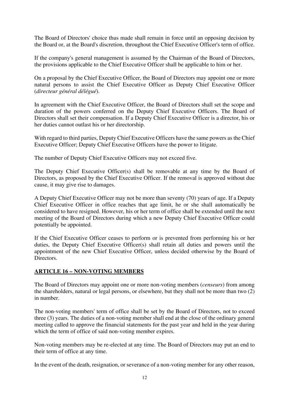12 The Board of Directors' choice thus made shall remain in force until an opposing decision by the Board or, at the Board's discretion, throughout the Chief Executive Officer's term of office. If the company's general management is assumed by the Chairman of the Board of Directors, the provisions applicable to the Chief Executive Officer shall be applicable to him or her. On a proposal by the Chief Executive Officer, the Board of Directors may appoint one or more natural persons to assist the Chief Executive Officer as Deputy Chief Executive Officer (directeur général délégué). In agreement with the Chief Executive Officer, the Board of Directors shall set the scope and duration of the powers conferred on the Deputy Chief Executive Officers. The Board of Directors shall set their compensation. If a Deputy Chief Executive Officer is a director, his or her duties cannot outlast his or her directorship. With regard to third parties, Deputy Chief Executive Officers have the same powers as the Chief Executive Officer; Deputy Chief Executive Officers have the power to litigate. The number of Deputy Chief Executive Officers may not exceed five. The Deputy Chief Executive Officer(s) shall be removable at any time by the Board of Directors, as proposed by the Chief Executive Officer. If the removal is approved without due cause, it may give rise to damages. A Deputy Chief Executive Officer may not be more than seventy (70) years of age. If a Deputy Chief Executive Officer in office reaches that age limit, he or she shall automatically be considered to have resigned. However, his or her term of office shall be extended until the next meeting of the Board of Directors during which a new Deputy Chief Executive Officer could potentially be appointed. If the Chief Executive Officer ceases to perform or is prevented from performing his or her duties, the Deputy Chief Executive Officer(s) shall retain all duties and powers until the appointment of the new Chief Executive Officer, unless decided otherwise by the Board of Directors. ARTICLE 16 – NON-VOTING MEMBERS The Board of Directors may appoint one or more non-voting members (censeurs) from among the shareholders, natural or legal persons, or elsewhere, but they shall not be more than two (2) in number. The non-voting members' term of office shall be set by the Board of Directors, not to exceed three (3) years. The duties of a non-voting member shall end at the close of the ordinary general meeting called to approve the financial statements for the past year and held in the year during which the term of office of said non-voting member expires. Non-voting members may be re-elected at any time. The Board of Directors may put an end to their term of office at any time. In the event of the death, resignation, or severance of a non-voting member for any other reason,
