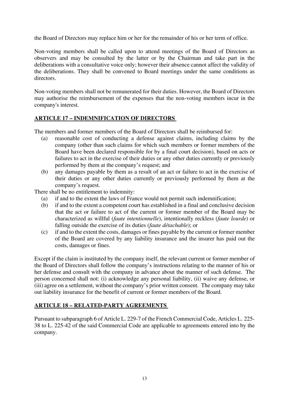 13 the Board of Directors may replace him or her for the remainder of his or her term of office. Non-voting members shall be called upon to attend meetings of the Board of Directors as observers and may be consulted by the latter or by the Chairman and take part in the deliberations with a consultative voice only; however their absence cannot affect the validity of the deliberations. They shall be convened to Board meetings under the same conditions as directors. Non-voting members shall not be remunerated for their duties. However, the Board of Directors may authorise the reimbursement of the expenses that the non-voting members incur in the company's interest. ARTICLE 17 – INDEMNIFICATION OF DIRECTORS The members and former members of the Board of Directors shall be reimbursed for: (a) reasonable cost of conducting a defense against claims, including claims by the company (other than such claims for which such members or former members of the Board have been declared responsible for by a final court decision), based on acts or failures to act in the exercise of their duties or any other duties currently or previously performed by them at the company’s request; and (b) any damages payable by them as a result of an act or failure to act in the exercise of their duties or any other duties currently or previously performed by them at the company’s request. There shall be no entitlement to indemnity: (a) if and to the extent the laws of France would not permit such indemnification; (b) if and to the extent a competent court has established in a final and conclusive decision that the act or failure to act of the current or former member of the Board may be characterized as willful (faute intentionnelle), intentionally reckless (faute lourde) or falling outside the exercise of its duties (faute détachable); or (c) if and to the extent the costs, damages or fines payable by the current or former member of the Board are covered by any liability insurance and the insurer has paid out the costs, damages or fines. Except if the claim is instituted by the company itself, the relevant current or former member of the Board of Directors shall follow the company’s instructions relating to the manner of his or her defense and consult with the company in advance about the manner of such defense. The person concerned shall not: (i) acknowledge any personal liability, (ii) waive any defense, or (iii) agree on a settlement, without the company’s prior written consent. The company may take out liability insurance for the benefit of current or former members of the Board. ARTICLE 18 – RELATED-PARTY AGREEMENTS Pursuant to subparagraph 6 of Article L. 229-7 of the French Commercial Code, Articles L. 225- 38 to L. 225-42 of the said Commercial Code are applicable to agreements entered into by the company.